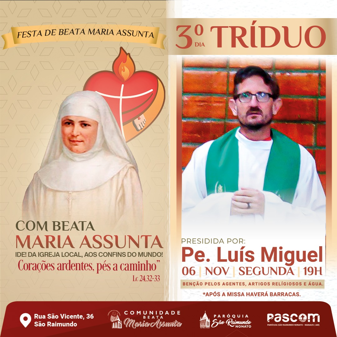 Convidamos você e sua família para o TERCEIRO DIA DO TRÍDUO, hoje (06 de novembro segunda feira às 19h). Venham celebrar conosco este momento especial! Haverá bênção pelos agentes e ártigos religiosos e água. *Após a missa, haverá barracas.