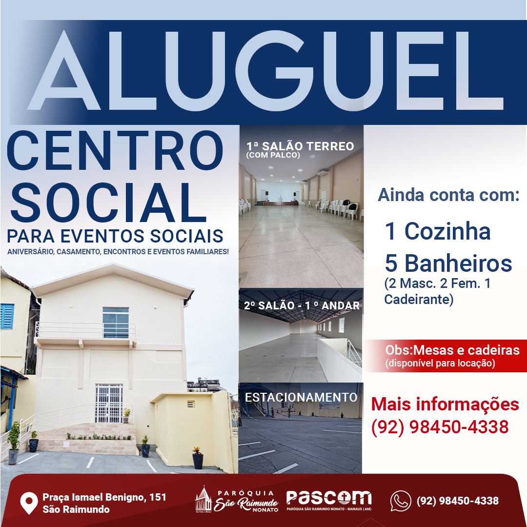 A Paróquia São Raimundo Nonato está alugando o Centro Social para eventos particulares. Uma boa oportunidade para as famílias. Procure a Secretaria da Paróquia e conheça o espaço, os detalhes e condições de aluguel.