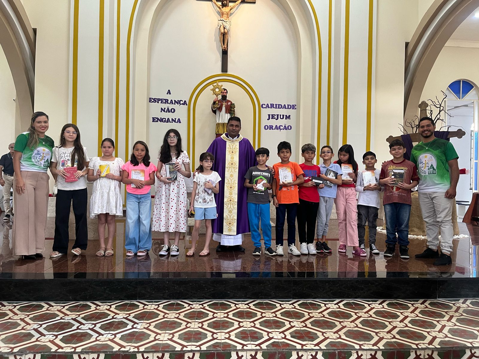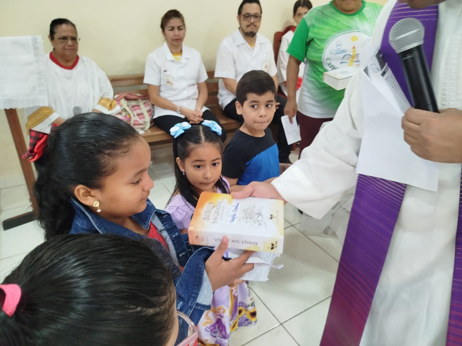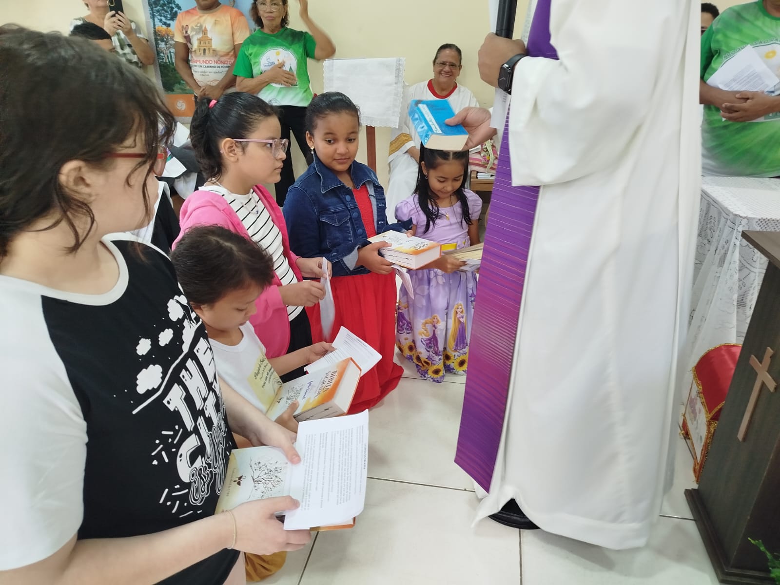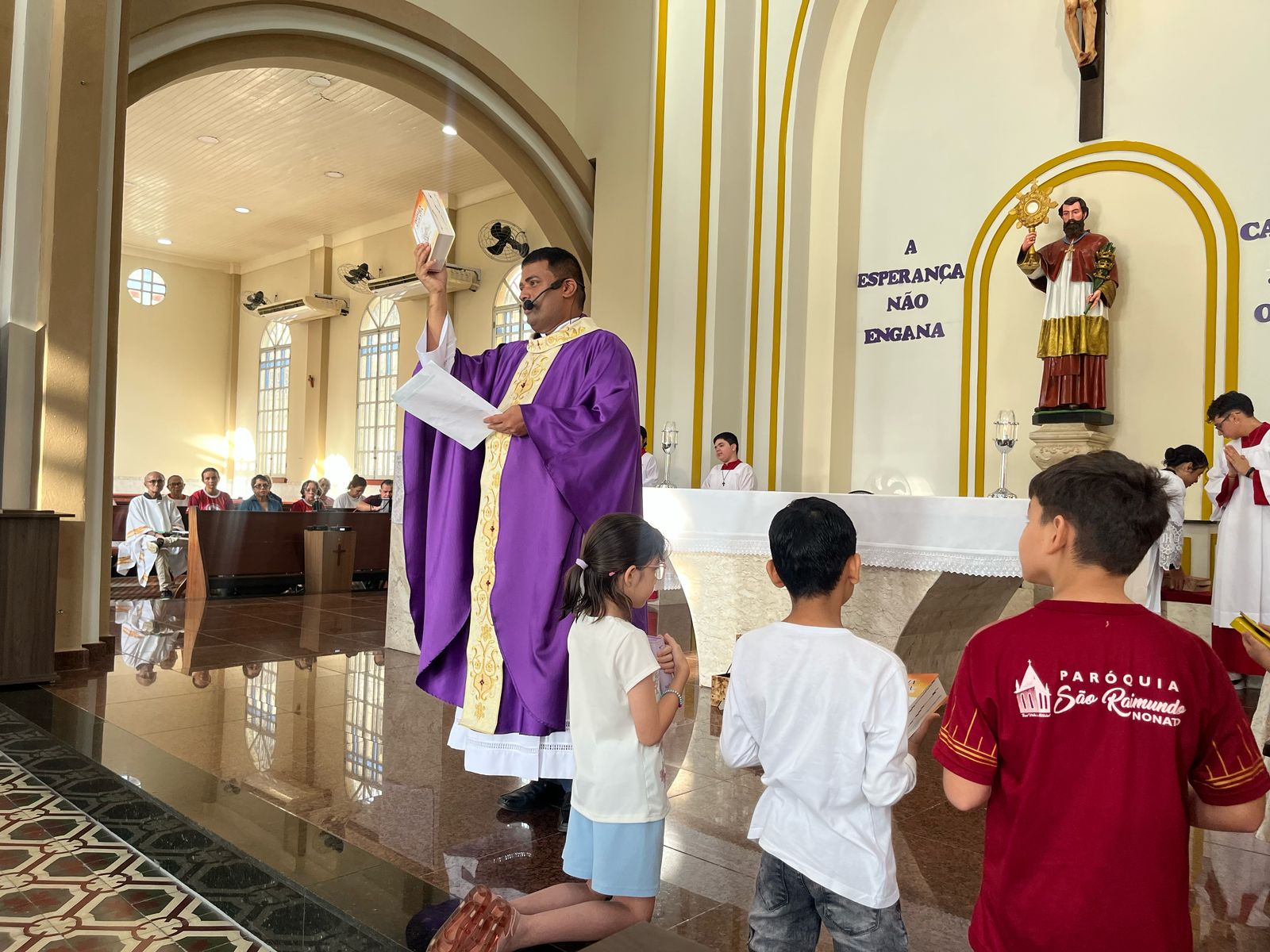 Neste domingo 06/04/025, na Paróquia São Raimundo Nonato, realizou-se o Rito da Entrega da Palavra nas três comunidades pertencentes à paróquia: nas Comunidades Beata Maria Assunta e São Raimundo Nonato a missa foi presidida por Pe John Paul; na Comunidade São Vicente de Paulo quem realizou o Rito foi o Ministro Extraordinário da Comunhão Eucarística, Sr Ferreira. O centro deste Rito não é o livro, mas sim a Palavra de Deus que está contida nele, o gesto ritual recorda a entrega da tradição recebida em torno da Sagrada Escritura. Por isso o livro bíblico já foi adquirido pelo catequizando, mas a entrega da Palavra é realizada pela Comunidade. Os celebrantes orientaram os catequizandos sobre a importância da Bíblia na caminhada de fé e na vida de maneira geral.