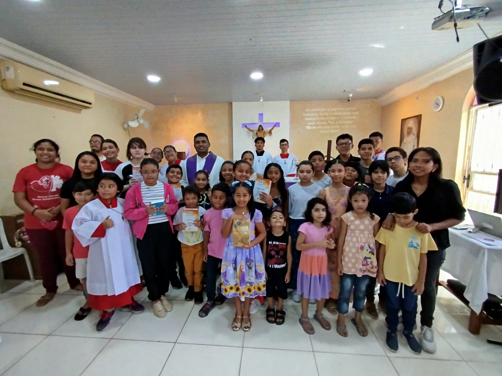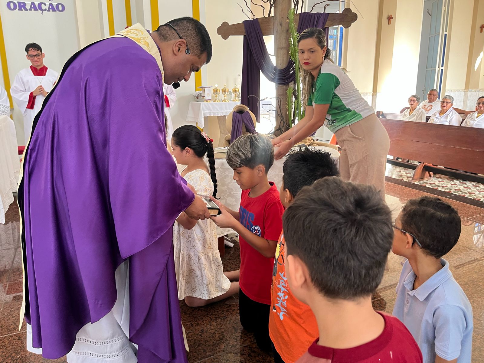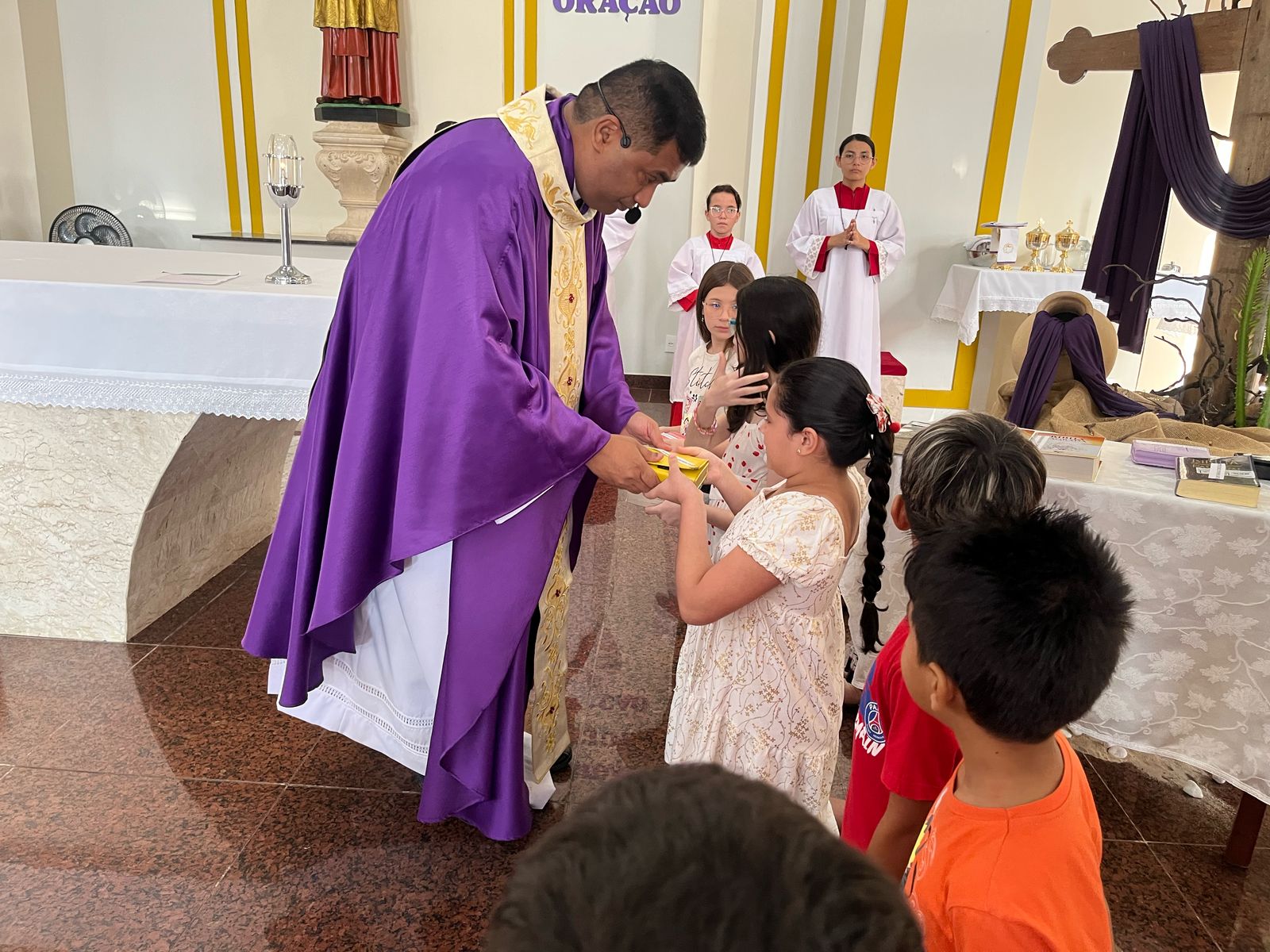 Neste domingo 06/04/025, na Paróquia São Raimundo Nonato, realizou-se o Rito da Entrega da Palavra nas três comunidades pertencentes à paróquia: nas Comunidades Beata Maria Assunta e São Raimundo Nonato a missa foi presidida por Pe John Paul; na Comunidade São Vicente de Paulo quem realizou o Rito foi o Ministro Extraordinário da Comunhão Eucarística, Sr Ferreira. O centro deste Rito não é o livro, mas sim a Palavra de Deus que está contida nele, o gesto ritual recorda a entrega da tradição recebida em torno da Sagrada Escritura. Por isso o livro bíblico já foi adquirido pelo catequizando, mas a entrega da Palavra é realizada pela Comunidade. Os celebrantes orientaram os catequizandos sobre a importância da Bíblia na caminhada de fé e na vida de maneira geral.