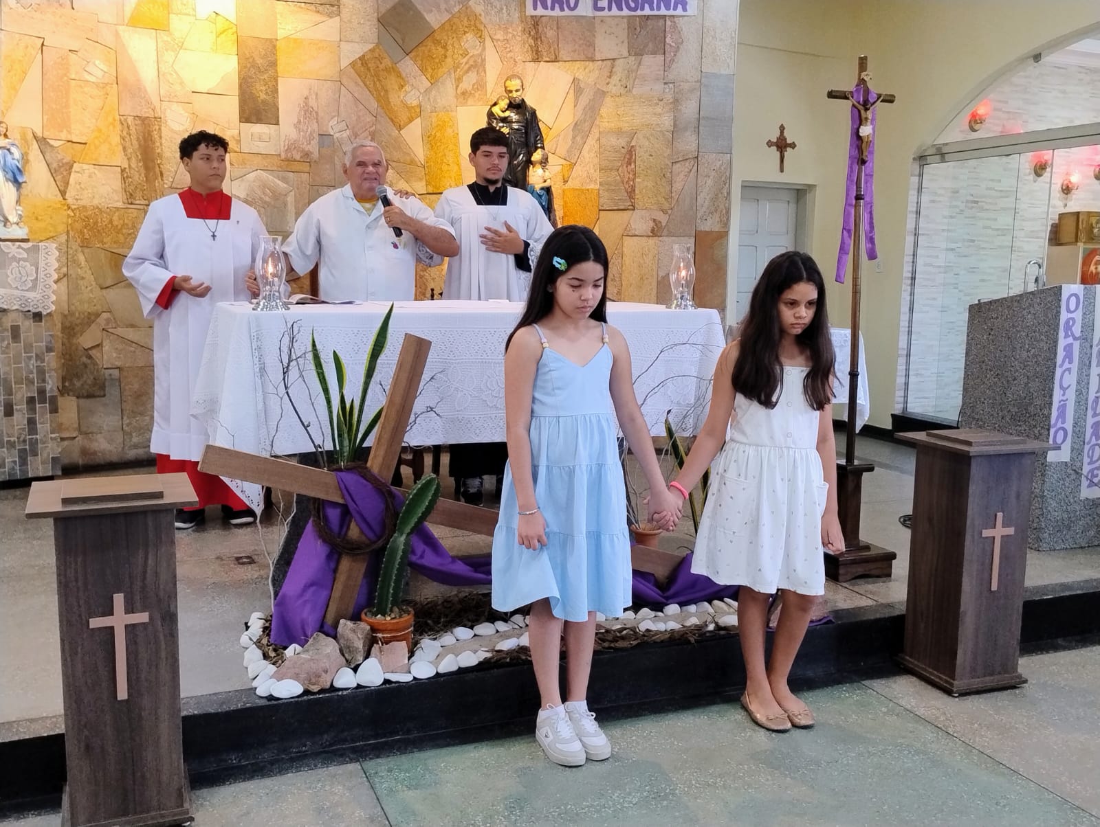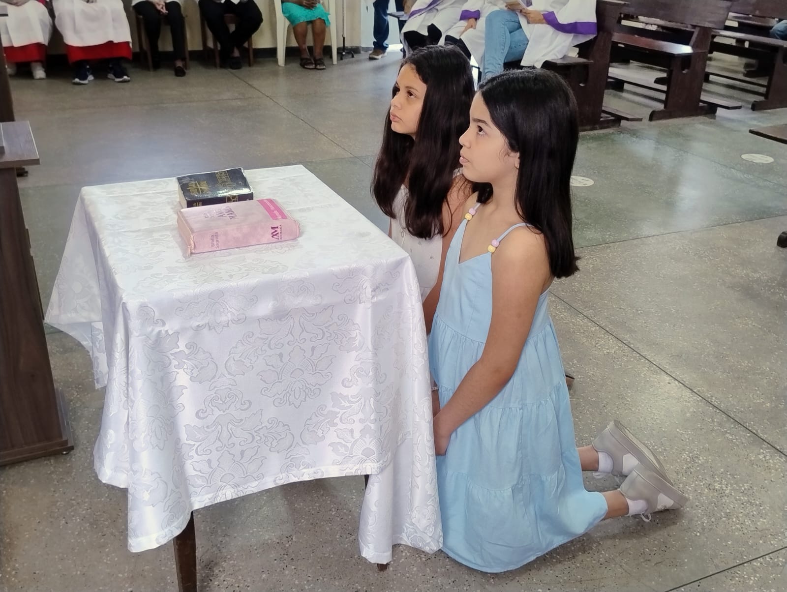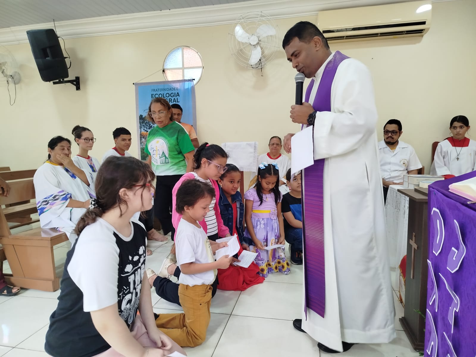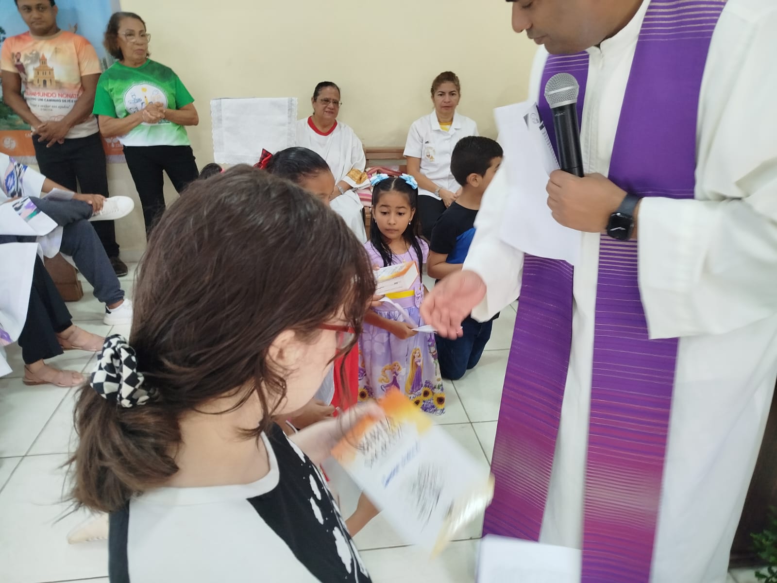 Neste domingo 06/04/025, na Paróquia São Raimundo Nonato, realizou-se o Rito da Entrega da Palavra nas três comunidades pertencentes à paróquia: nas Comunidades Beata Maria Assunta e São Raimundo Nonato a missa foi presidida por Pe John Paul; na Comunidade São Vicente de Paulo quem realizou o Rito foi o Ministro Extraordinário da Comunhão Eucarística, Sr Ferreira. O centro deste Rito não é o livro, mas sim a Palavra de Deus que está contida nele, o gesto ritual recorda a entrega da tradição recebida em torno da Sagrada Escritura. Por isso o livro bíblico já foi adquirido pelo catequizando, mas a entrega da Palavra é realizada pela Comunidade. Os celebrantes orientaram os catequizandos sobre a importância da Bíblia na caminhada de fé e na vida de maneira geral.
