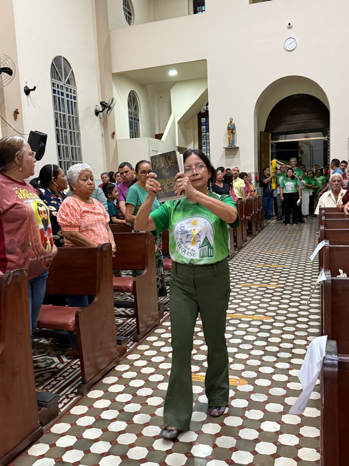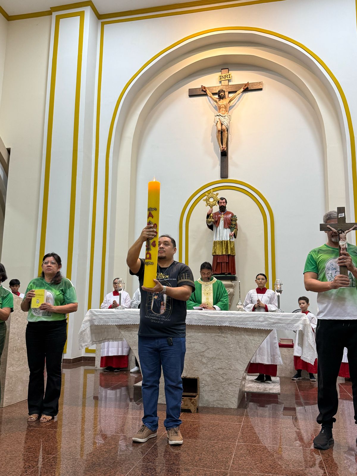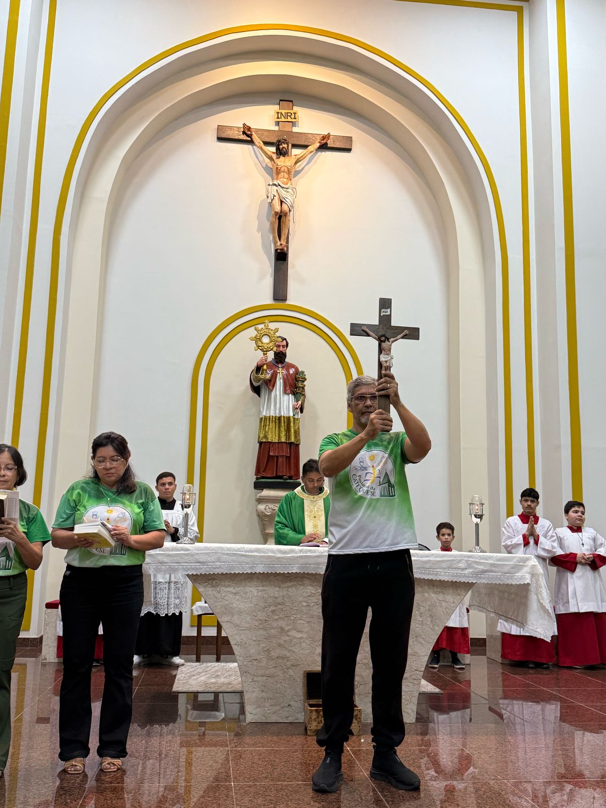 Rito deu início com a condução do celebrante Pe. John Paul, seguido da entrada dos símbolos importantes para catequese como a Bíblia, o Catecismo, o Crucifixo e o Círio Pascal, sendo conduzidos pelos coordenadores da Pastoral, seguidos pelos catequistas.