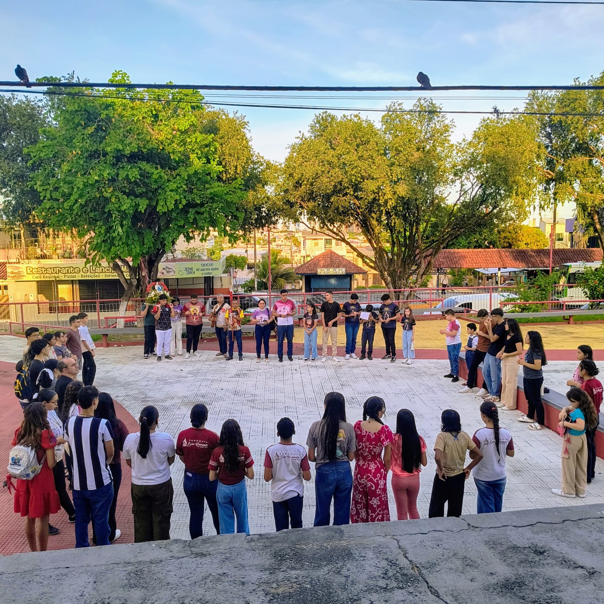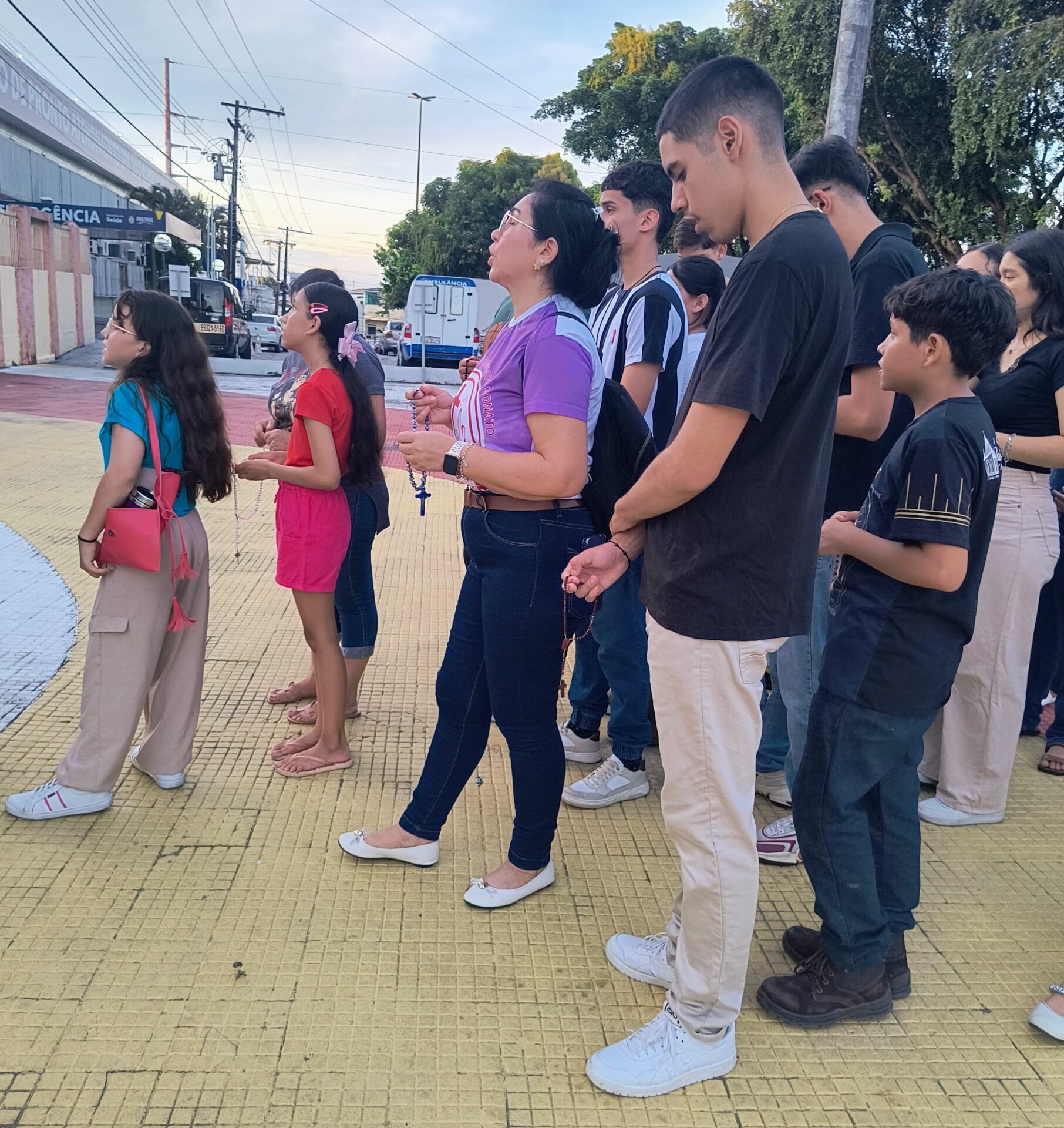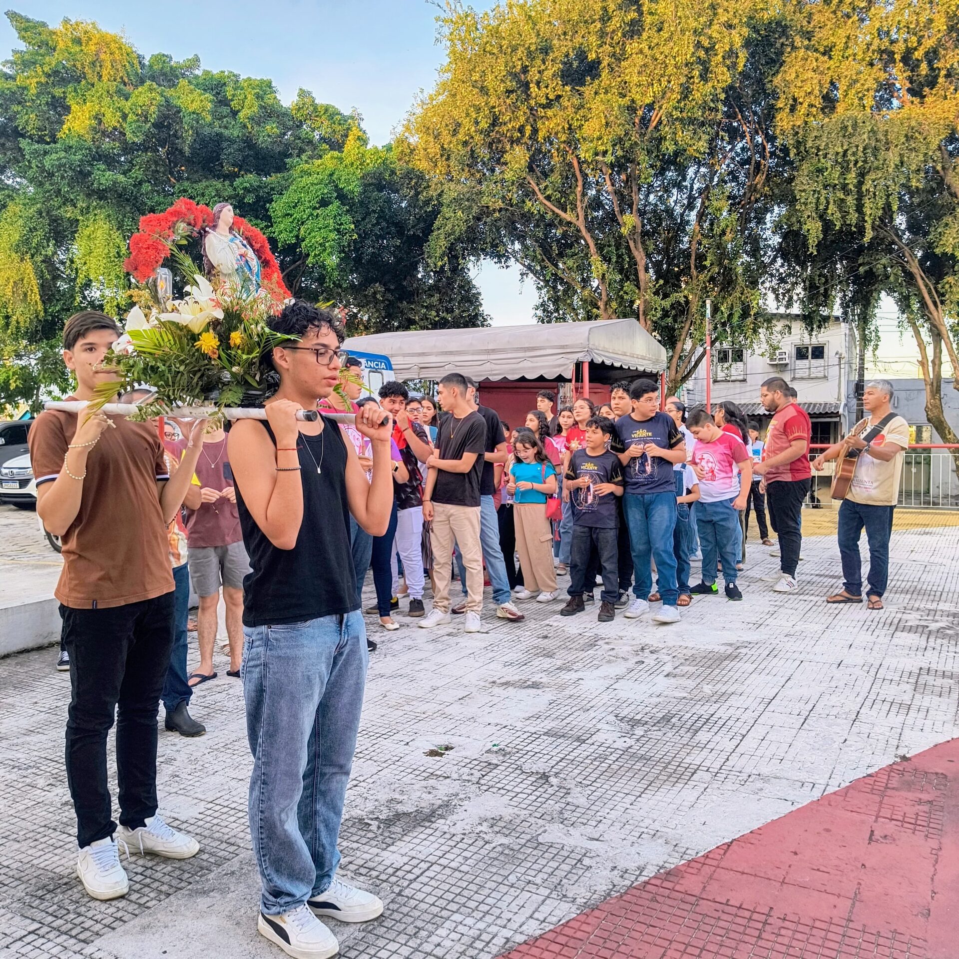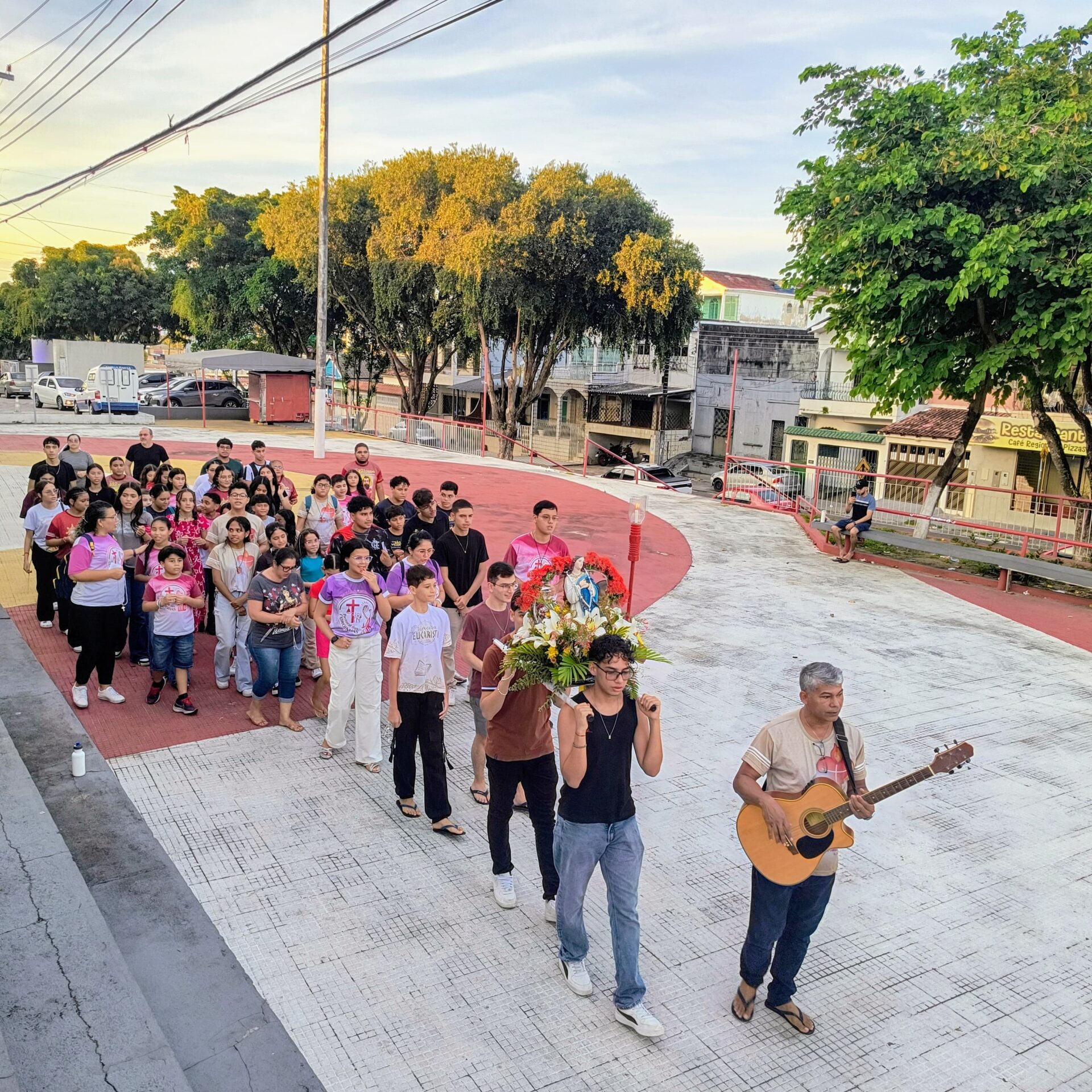 Conforme o Ano Jubilar, com o tema: Com Maria aprendemos ser Peregrinos de Esperança , e sim essa pequena peregrinação na praça, nos fez contemplar o Mistério Glorioso, com muita fé e esperança, pedindo a intercessão de Maria por nossas intenções: pelas intenções do nosso pároco Pe John Paul, pela eleição do Conclave no Vaticano o futuro de nossa igreja, por nossas famílias paroquianas, pela saúde dos enfermos nos hospitais, em suas casas, nas ruas (saúde mental, espiritual e física), pela paz do mundo, pelos abandonados, viciados, desempregados, por todos os presentes e os que não puderem está conosco.