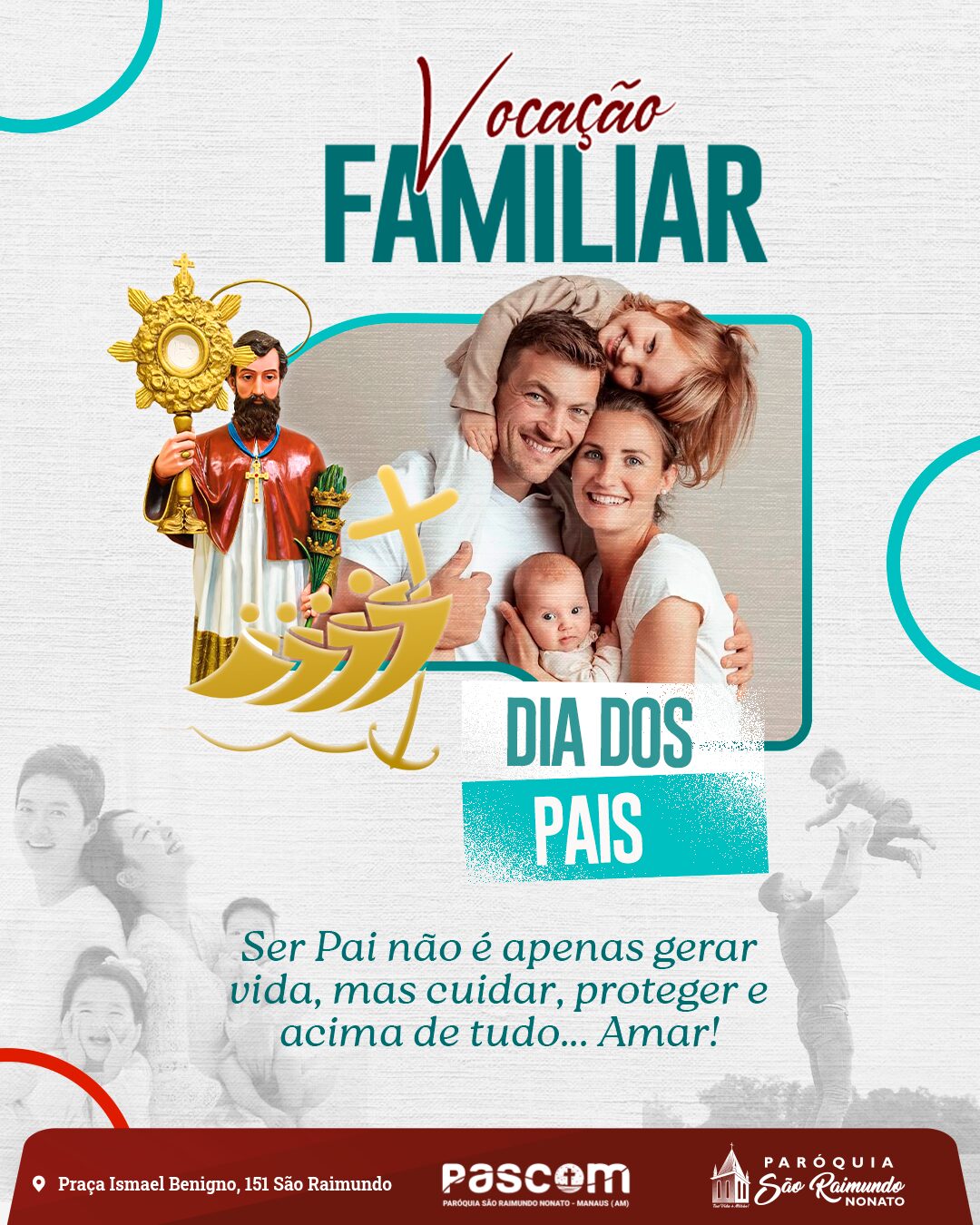 Vocês são sinais do amor e da providência de Deus, chamados a proteger, cuidar e guiar suas famílias no caminho da fé. Com seu trabalho, suas renúncias e seu exemplo silencioso, constroem um lar seguro e um futuro cheio de esperança para seus filhos.