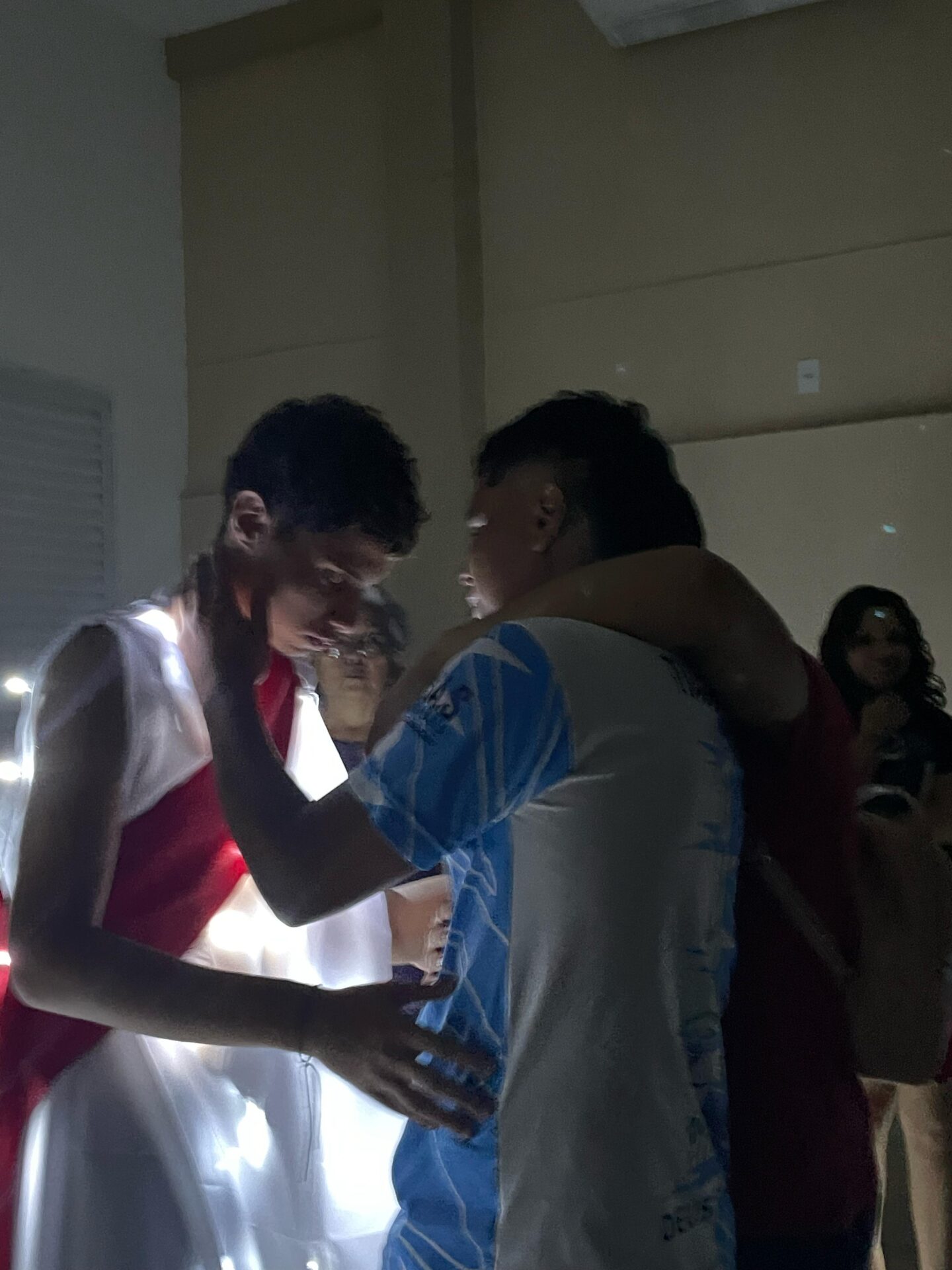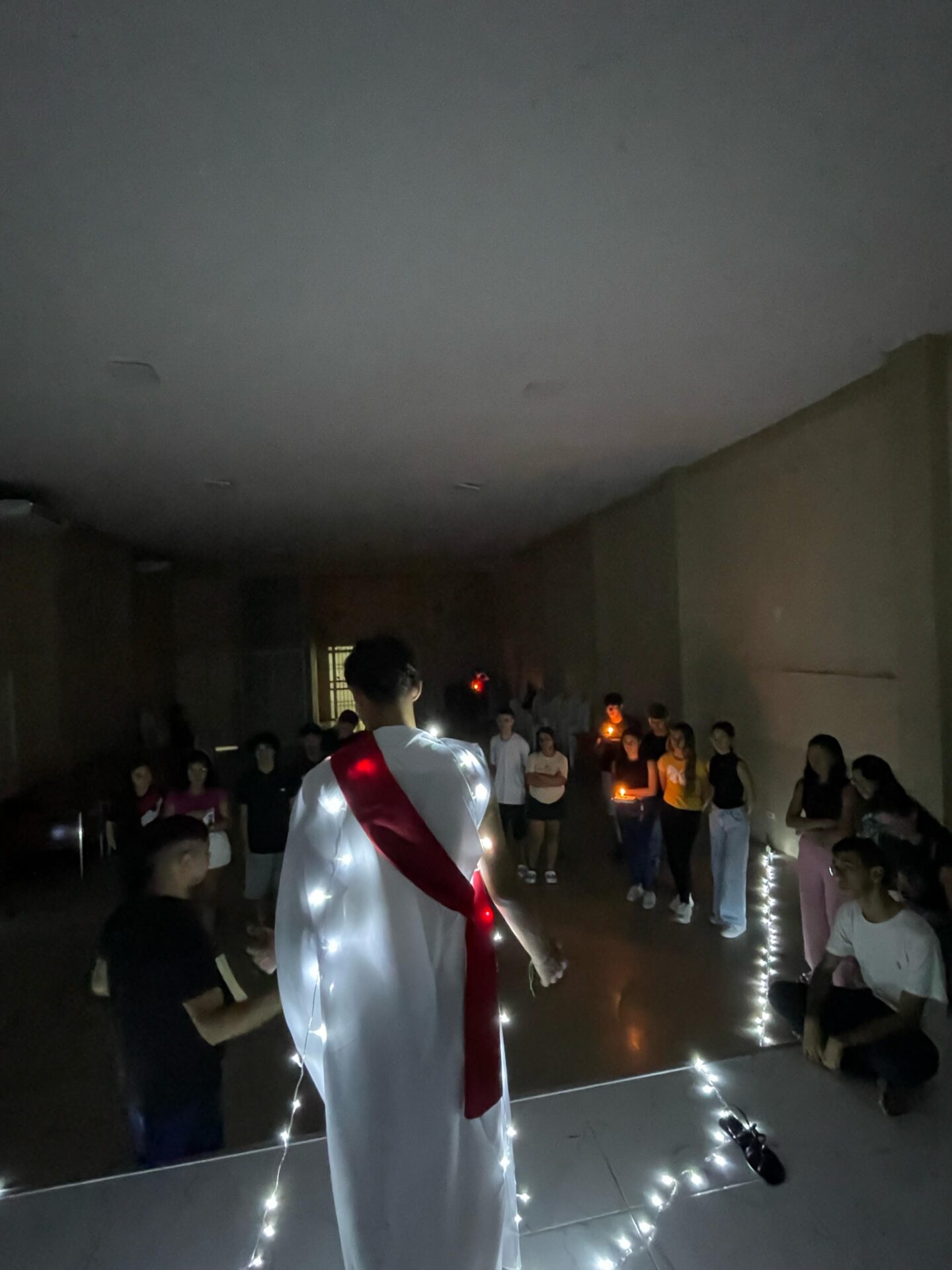 Em seguida, foram levados ao “Monte Tabor”, no qual viram Jesus Transfigurado, refletindo que devemos brilhar com a luz de Cristo, mostrando que existe um caminho de esperança e redenção no mundo.