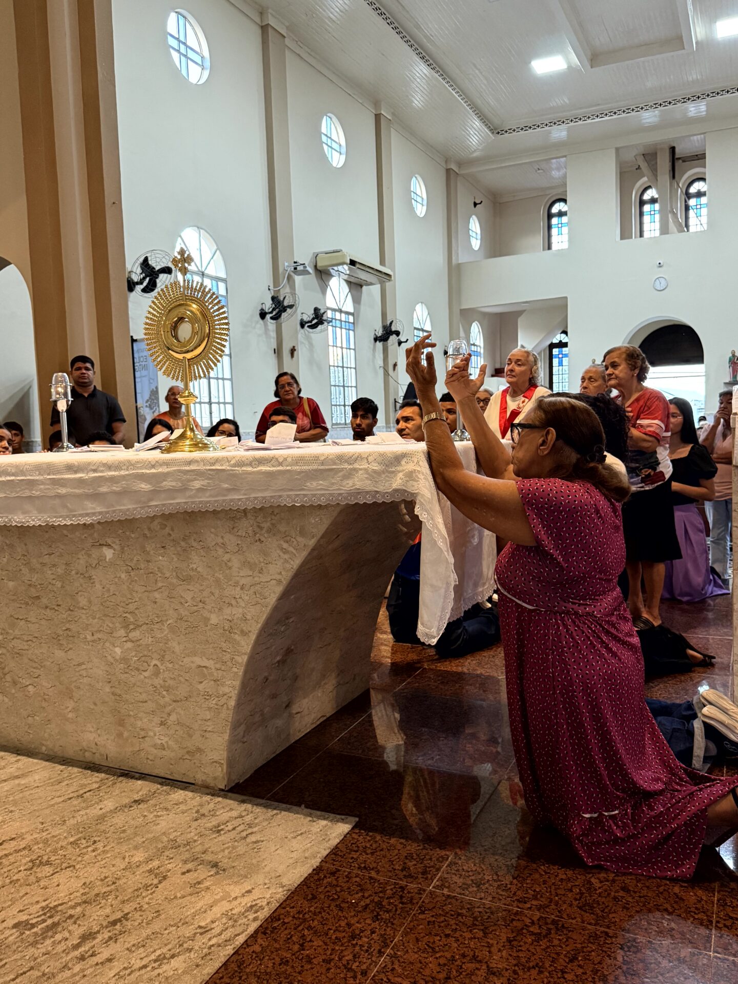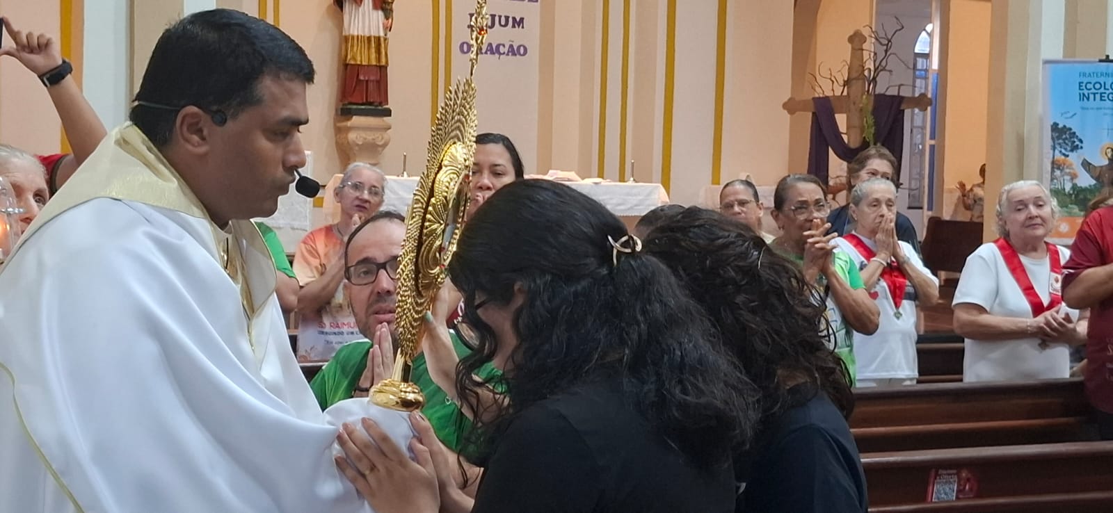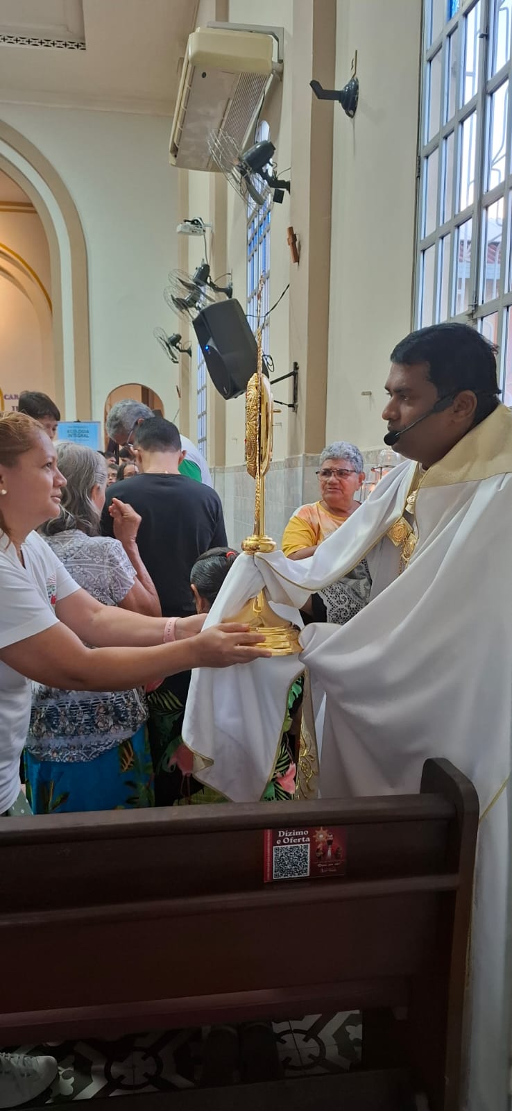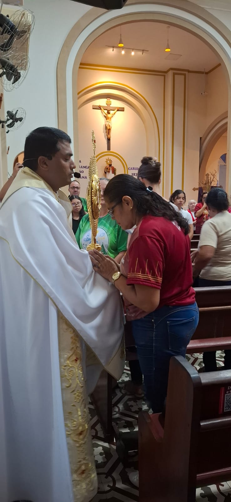 Sobre os pedidos por escrito, colocados aos pés do Senhor, o sacerdote pediu que todos unidos apresentamos à Virgem Maria, a Mulher Eucarística, Mãe de Deus e nossa mãe, a oração da Ave Maria. Ela intercede por nós junto a Jesus.
