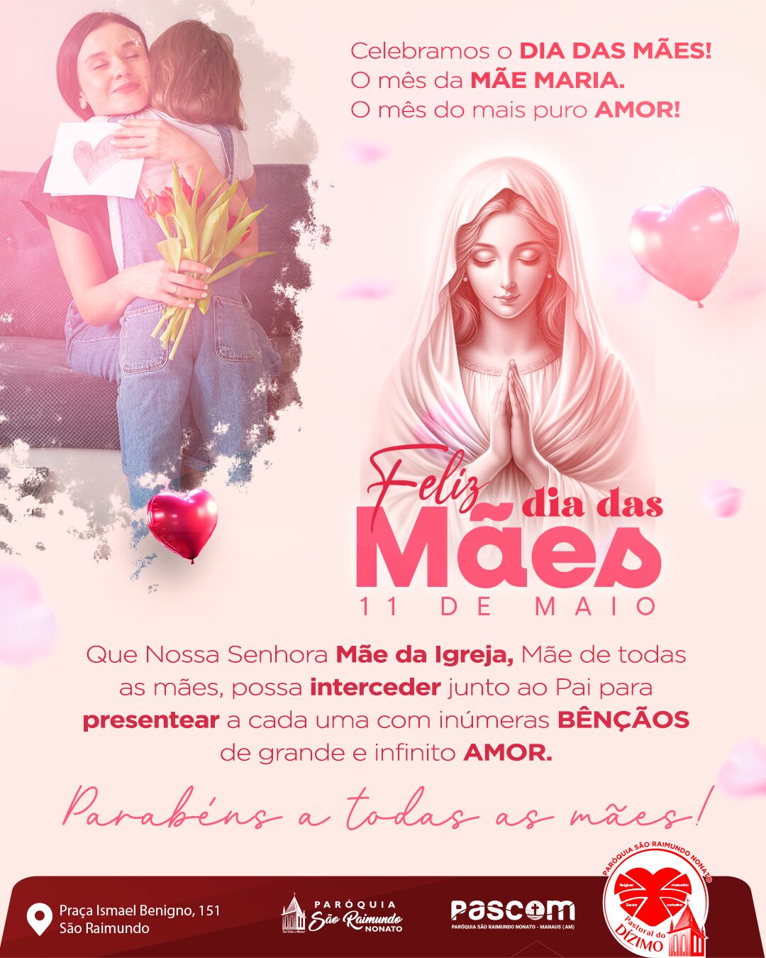 AA Paróquia São Raimundo Nonato deseja um feliz Dia das Mães a todas as mamães, especialmente às mães que se dedicam ao serviço pastoral e à evangelização desta paróquia! Que Deus as abençoe sempre e as recompense por tudo que fizeram e fazem por nós, muitas vezes no silêncio e na oração. Parabéns, mães, pelo seu dia!