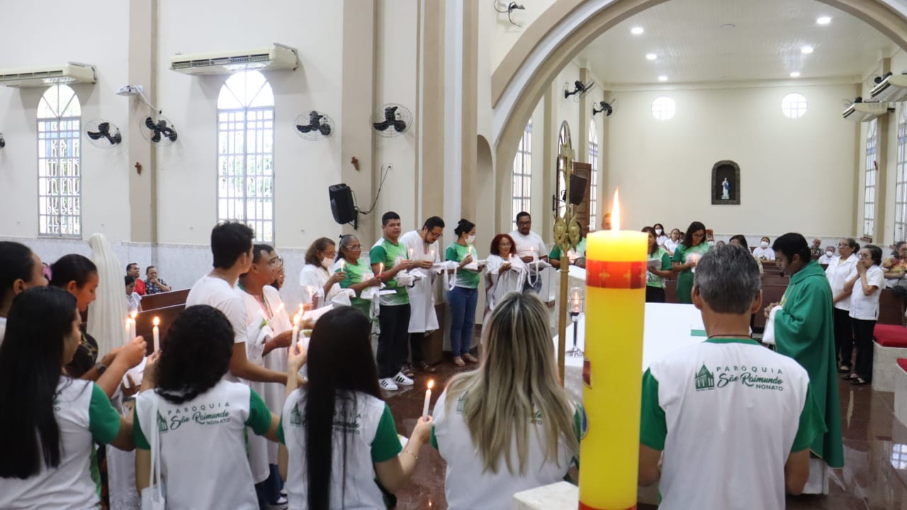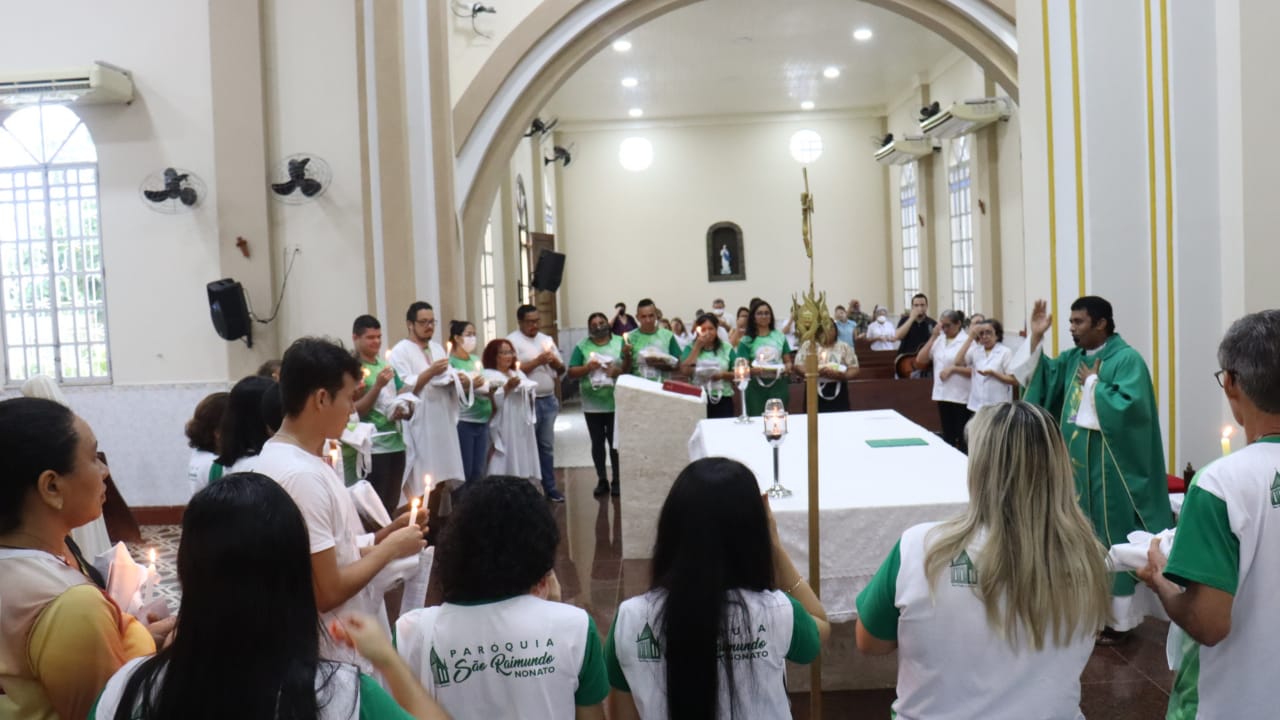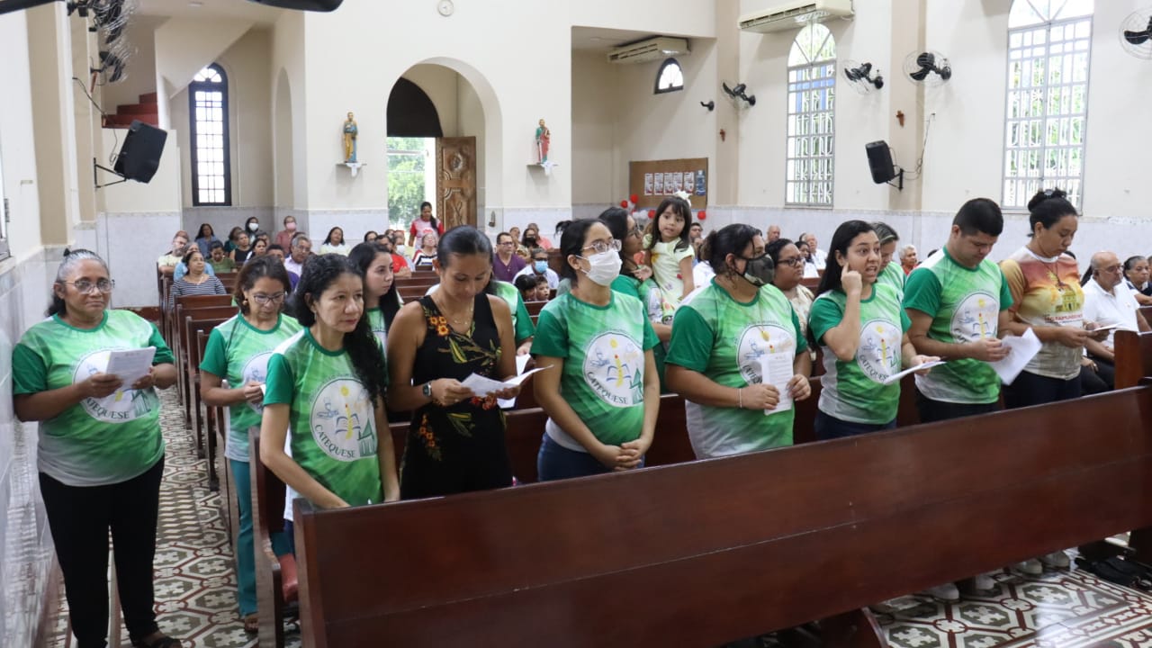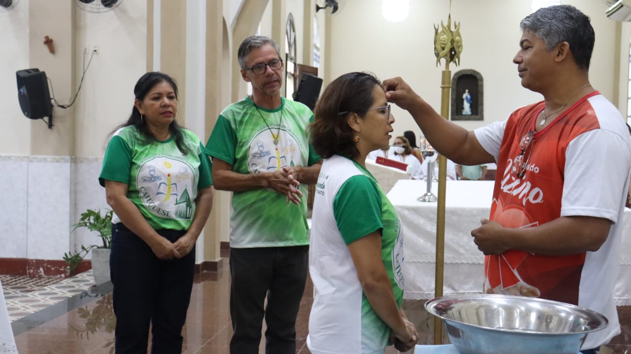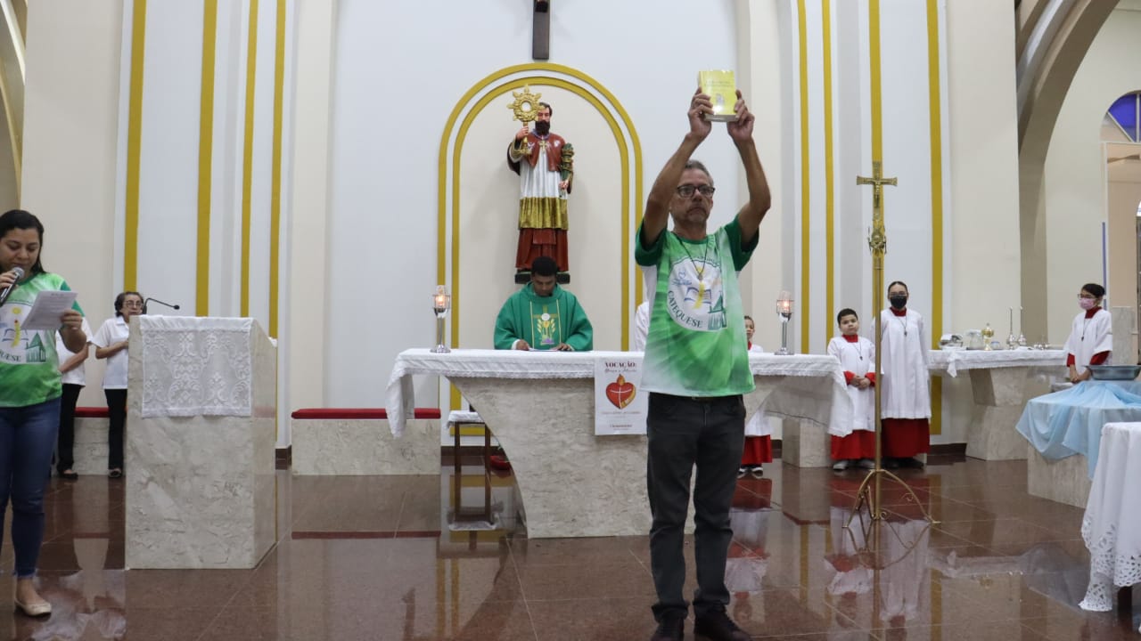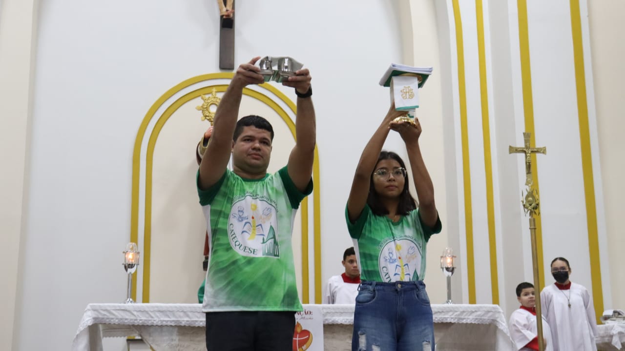 Neste dia 12/02/23, em uma linda celebração pela manhã, os catequistas de nossa Paróquia, representados pelas três comunidades, foram enviados a esta grande e necessária missão de catequizar. No primeiro momento tivemos a bênção da água, onde os catequistas de dois em dois foram direcionados a tocá-la e depois fazerem o sinal da cruz no seu par. No momento do ofertório, tivemos a entrada dos símbolos que ajudam na caminhada, como a Bíblia, o Catecismo da Igreja Católica, a Cruz, o Círio Pascal, que é a luz de Cristo, vindo acender a vela de cada um que deu o seu sim, para que se mantenha a chama acesa. Os catequistas também receberam o sal, uma bolsa com o livro e sua bíblia pessoal.