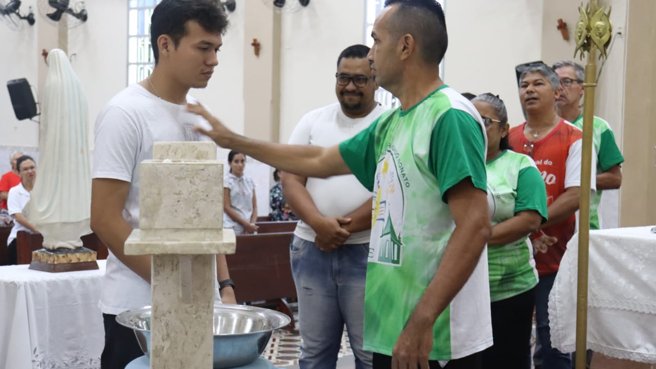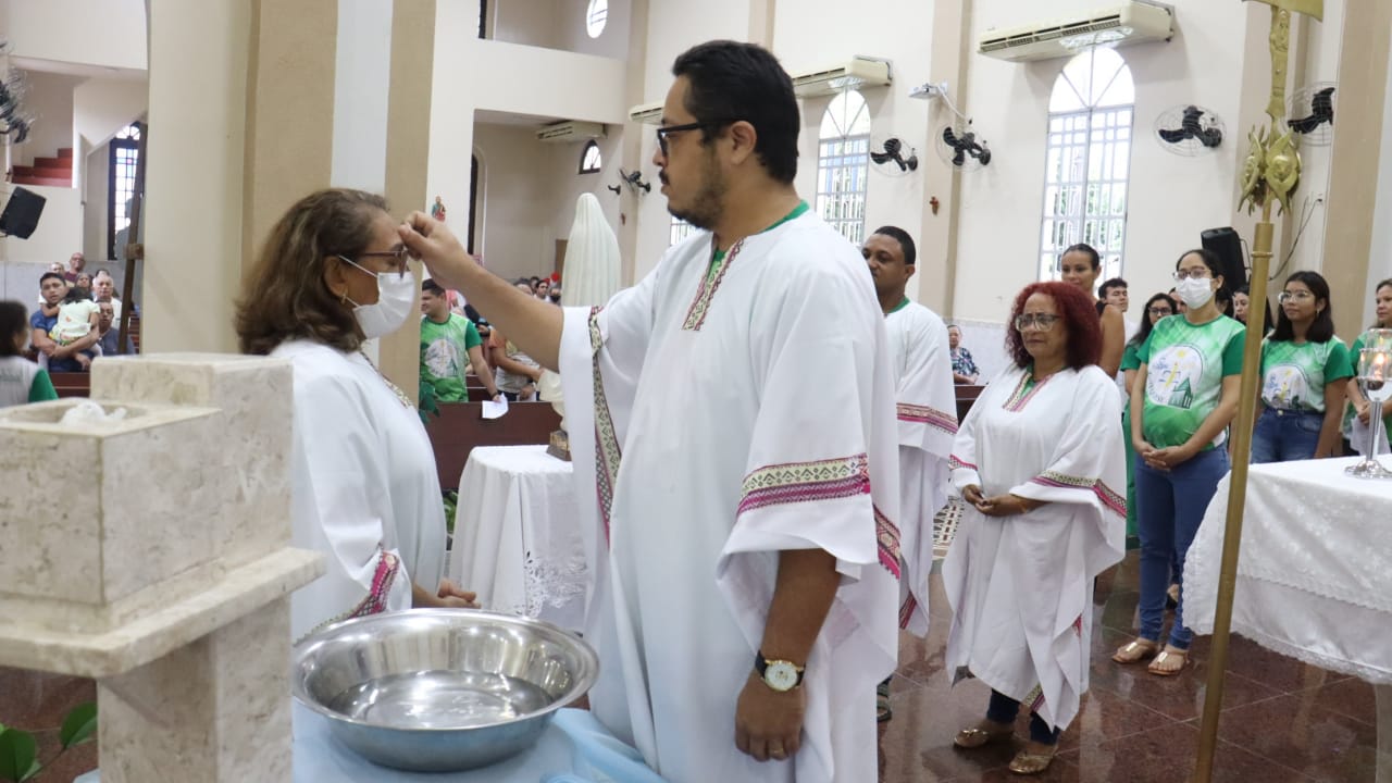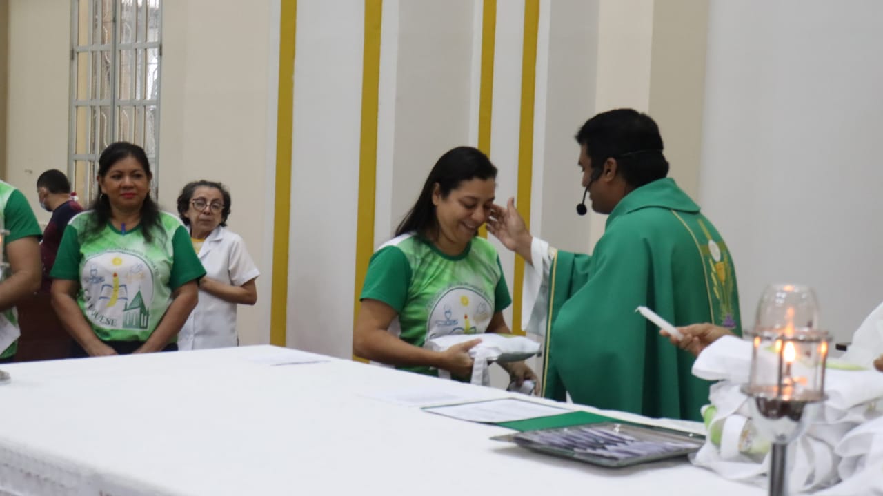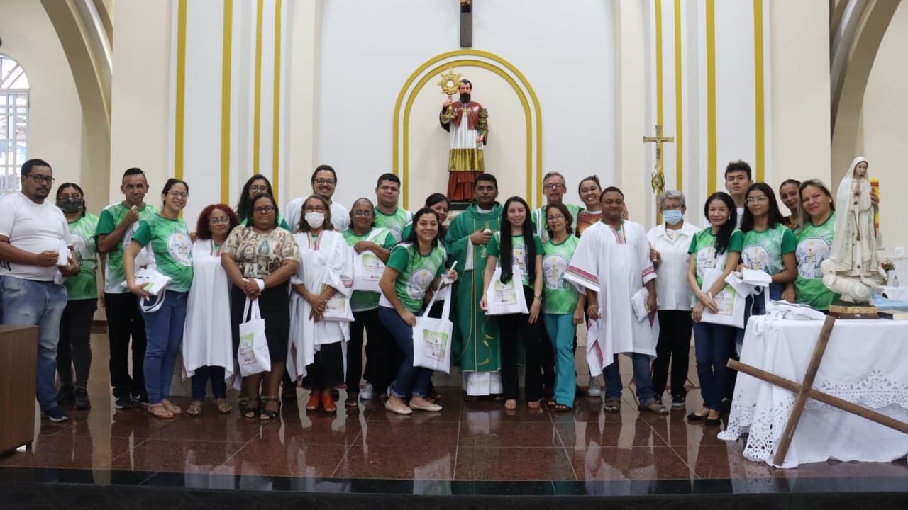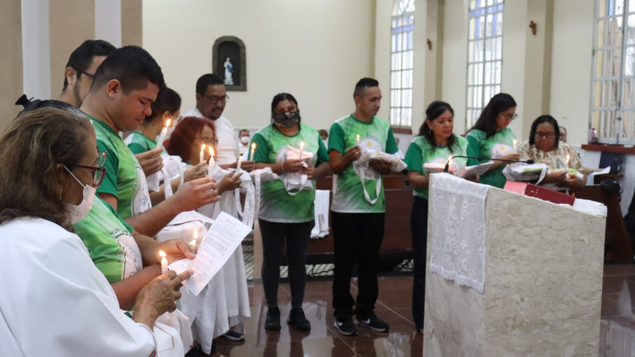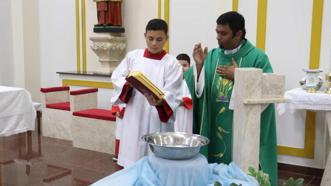 Neste dia 12/02/23, em uma linda celebração pela manhã, os catequistas de nossa Paróquia, representados pelas três comunidades, foram enviados a esta grande e necessária missão de catequizar. No primeiro momento tivemos a bênção da água, onde os catequistas de dois em dois foram direcionados a tocá-la e depois fazerem o sinal da cruz no seu par. No momento do ofertório, tivemos a entrada dos símbolos que ajudam na caminhada, como a Bíblia, o Catecismo da Igreja Católica, a Cruz, o Círio Pascal, que é a luz de Cristo, vindo acender a vela de cada um que deu o seu sim, para que se mantenha a chama acesa. Os catequistas também receberam o sal, uma bolsa com o livro e sua bíblia pessoal.