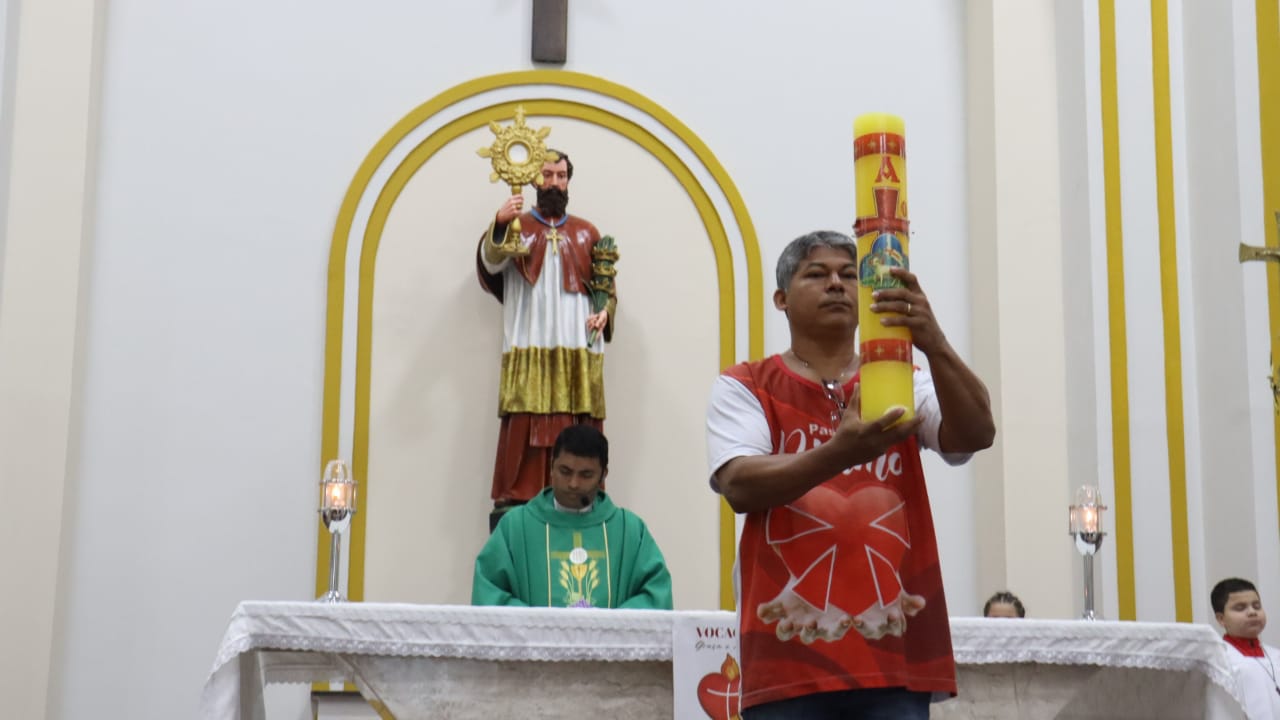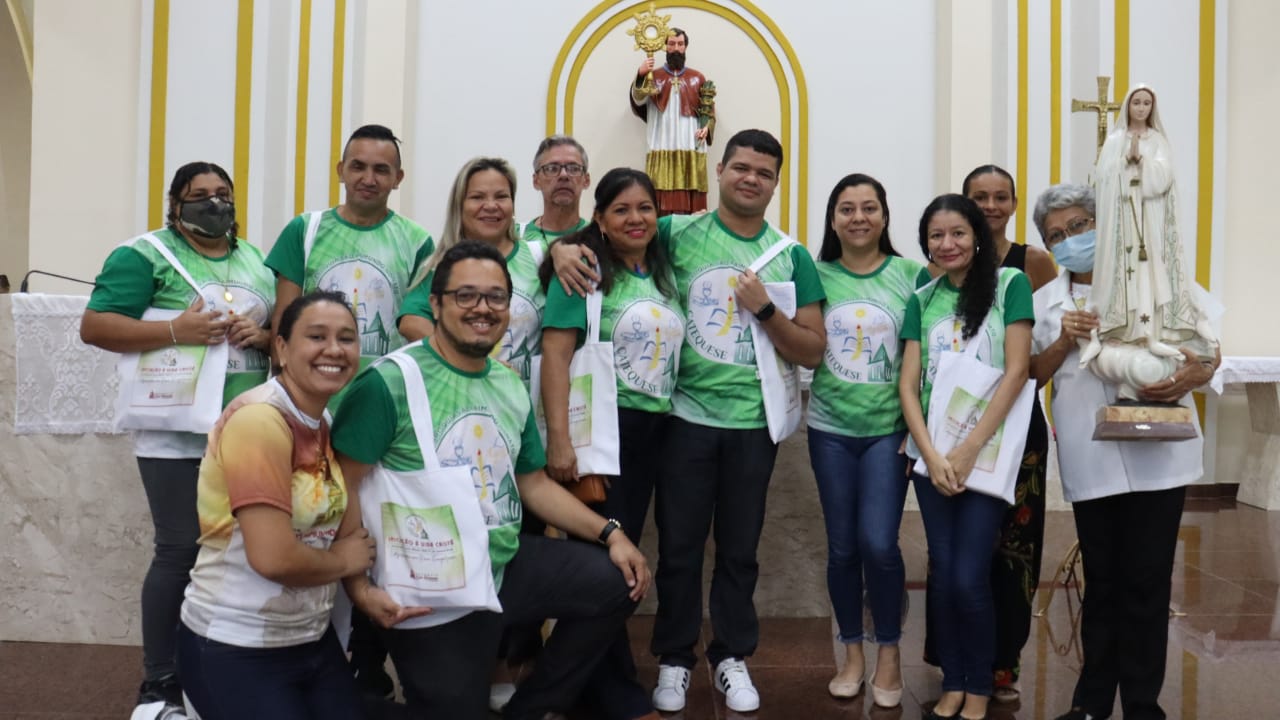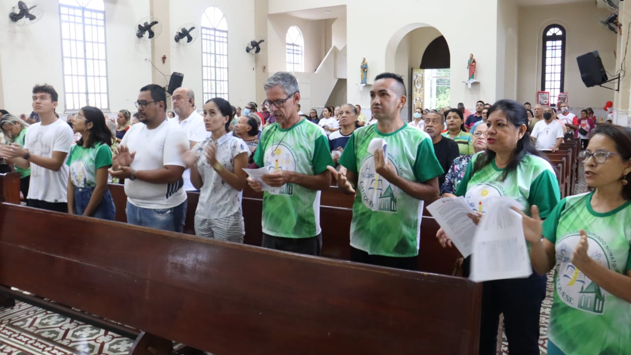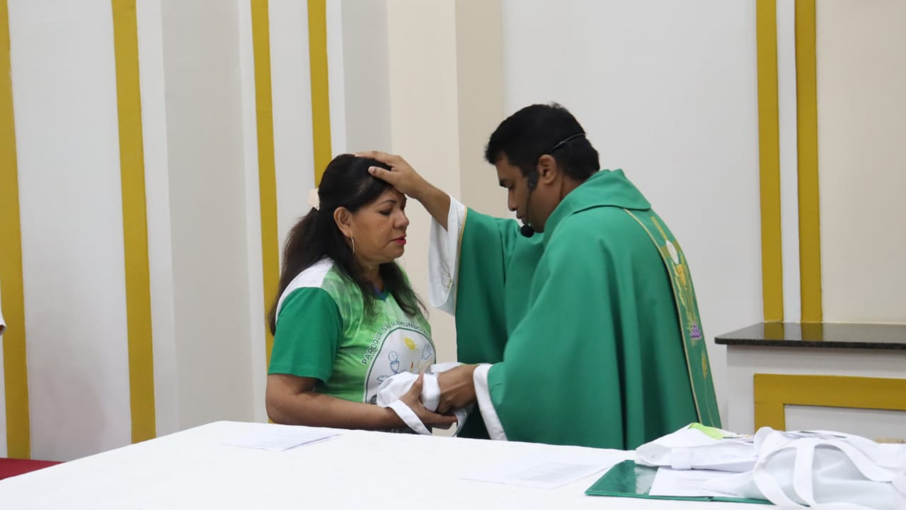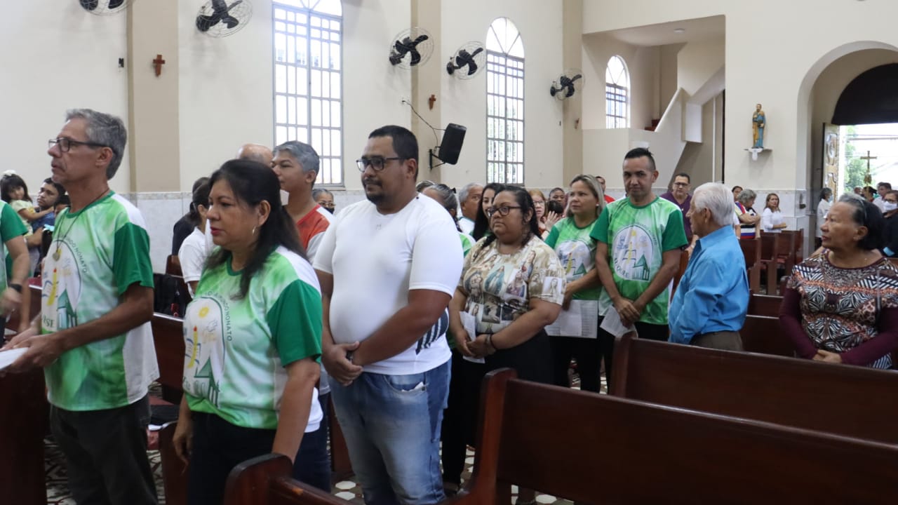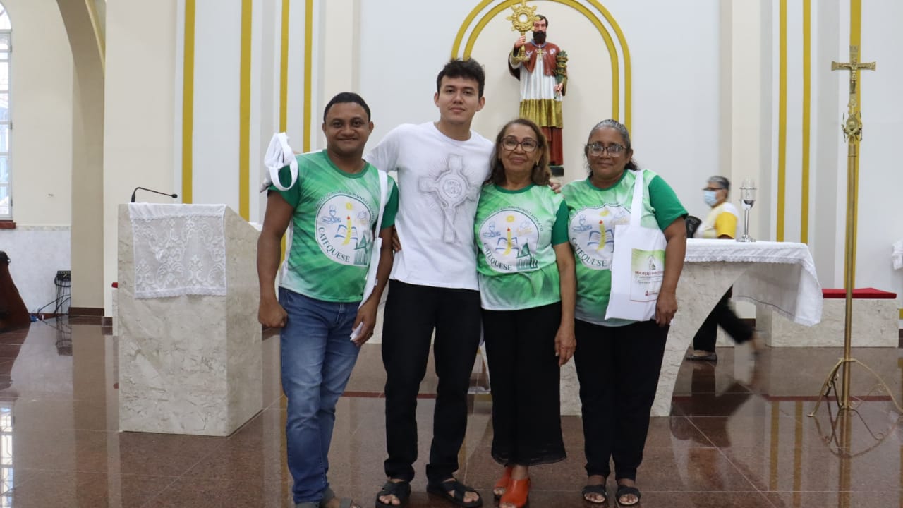 Neste dia 12/02/23, em uma linda celebração pela manhã, os catequistas de nossa Paróquia, representados pelas três comunidades, foram enviados a esta grande e necessária missão de catequizar. No primeiro momento tivemos a bênção da água, onde os catequistas de dois em dois foram direcionados a tocá-la e depois fazerem o sinal da cruz no seu par. No momento do ofertório, tivemos a entrada dos símbolos que ajudam na caminhada, como a Bíblia, o Catecismo da Igreja Católica, a Cruz, o Círio Pascal, que é a luz de Cristo, vindo acender a vela de cada um que deu o seu sim, para que se mantenha a chama acesa. Os catequistas também receberam o sal, uma bolsa com o livro e sua bíblia pessoal.