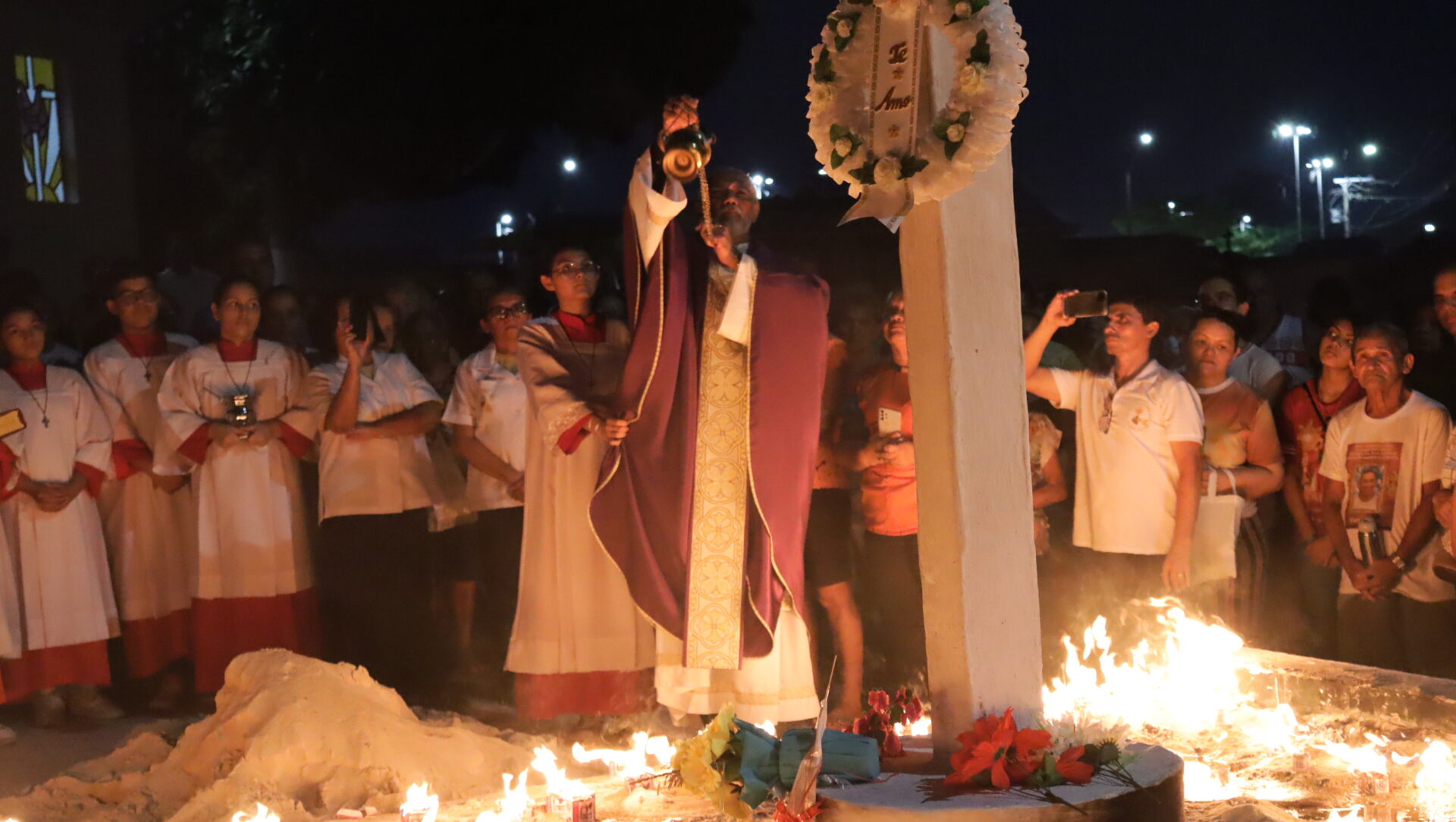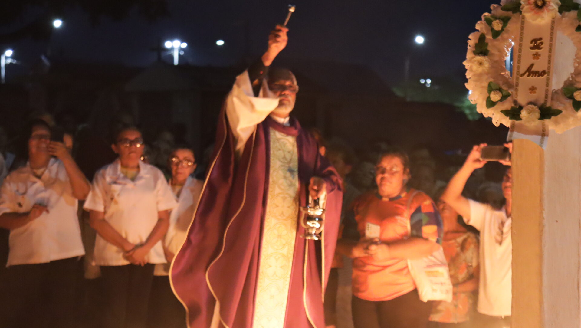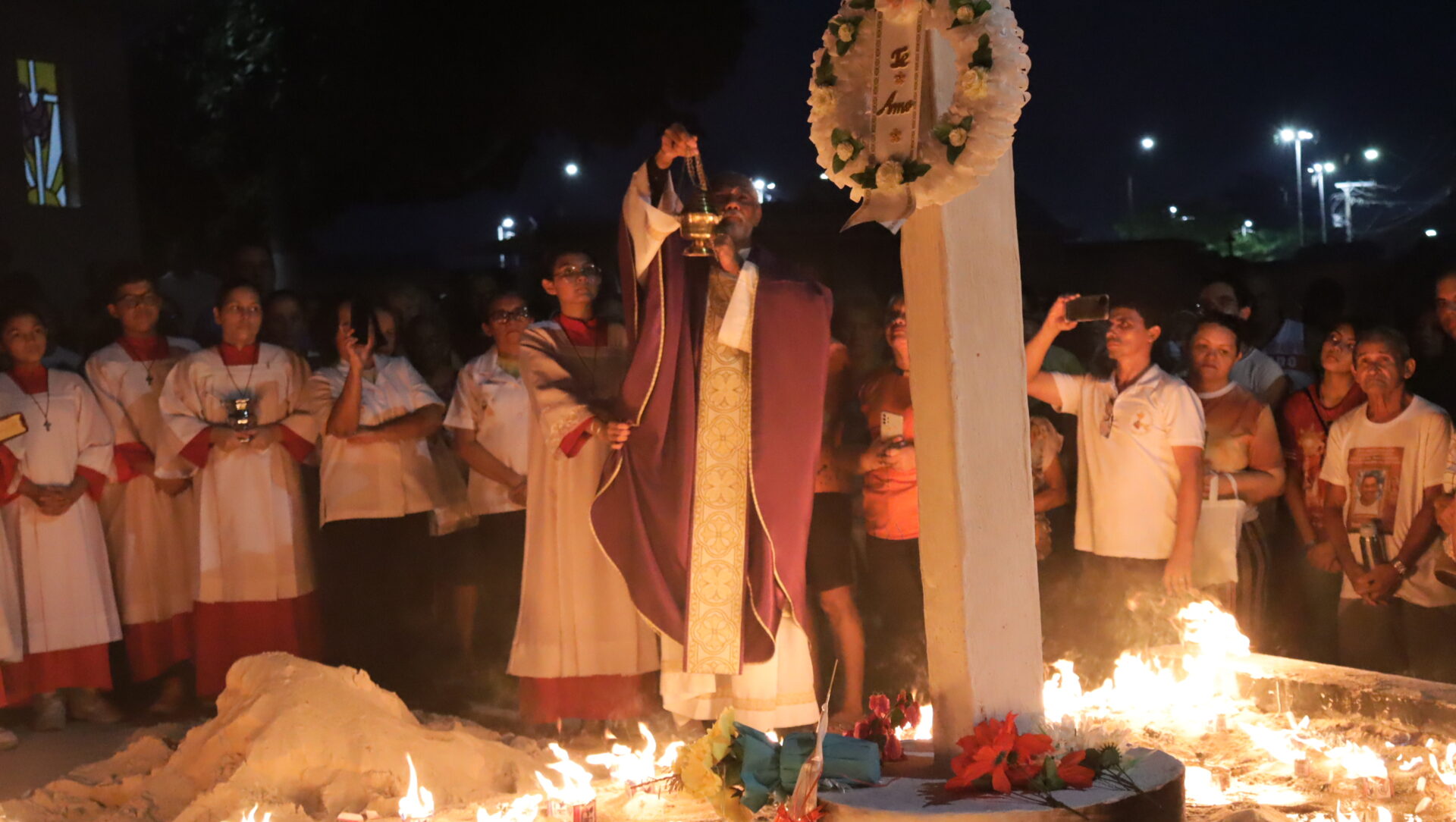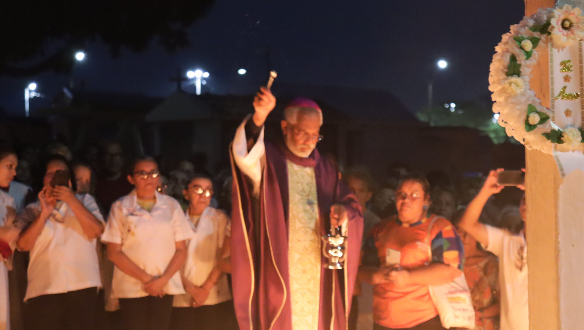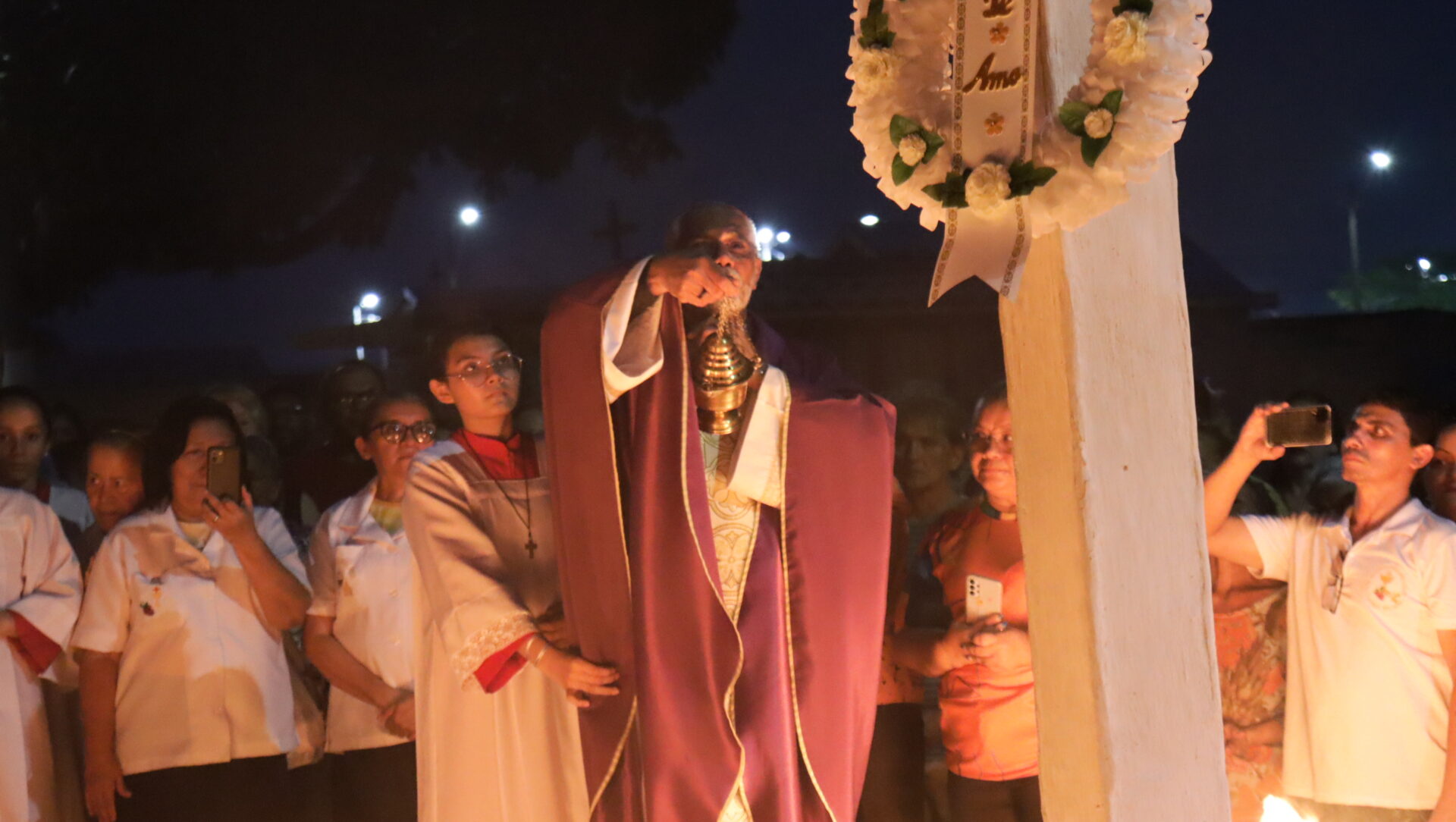 Ao final da celebração, fomos em procissão até o Cruzeiro. “Indo e vindo, trevas e luz. Tudo é graça, Deus nos conduz!” Mons. Zenildo abençoou, aspergindo, o cruzeiro e os presentes.