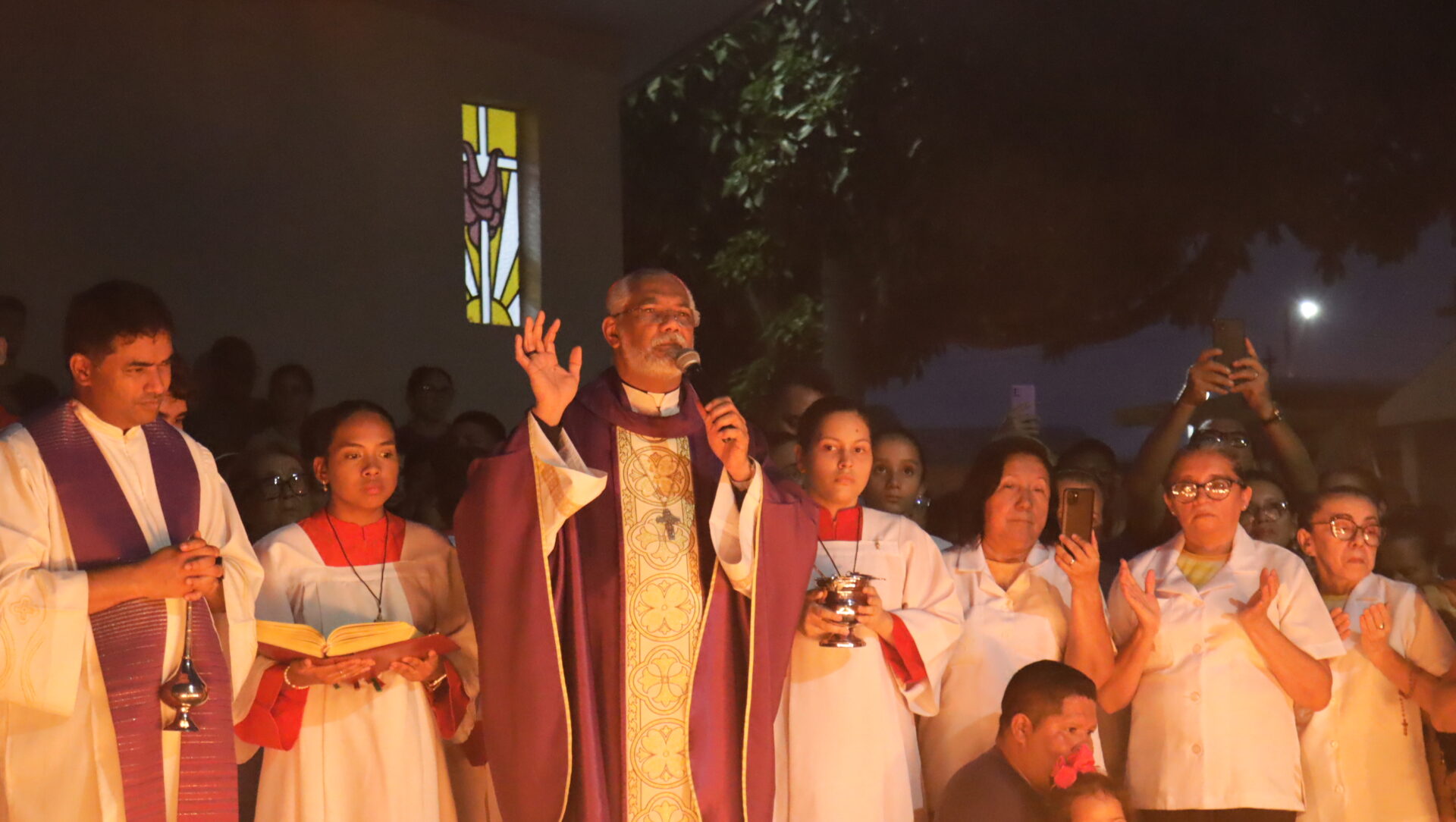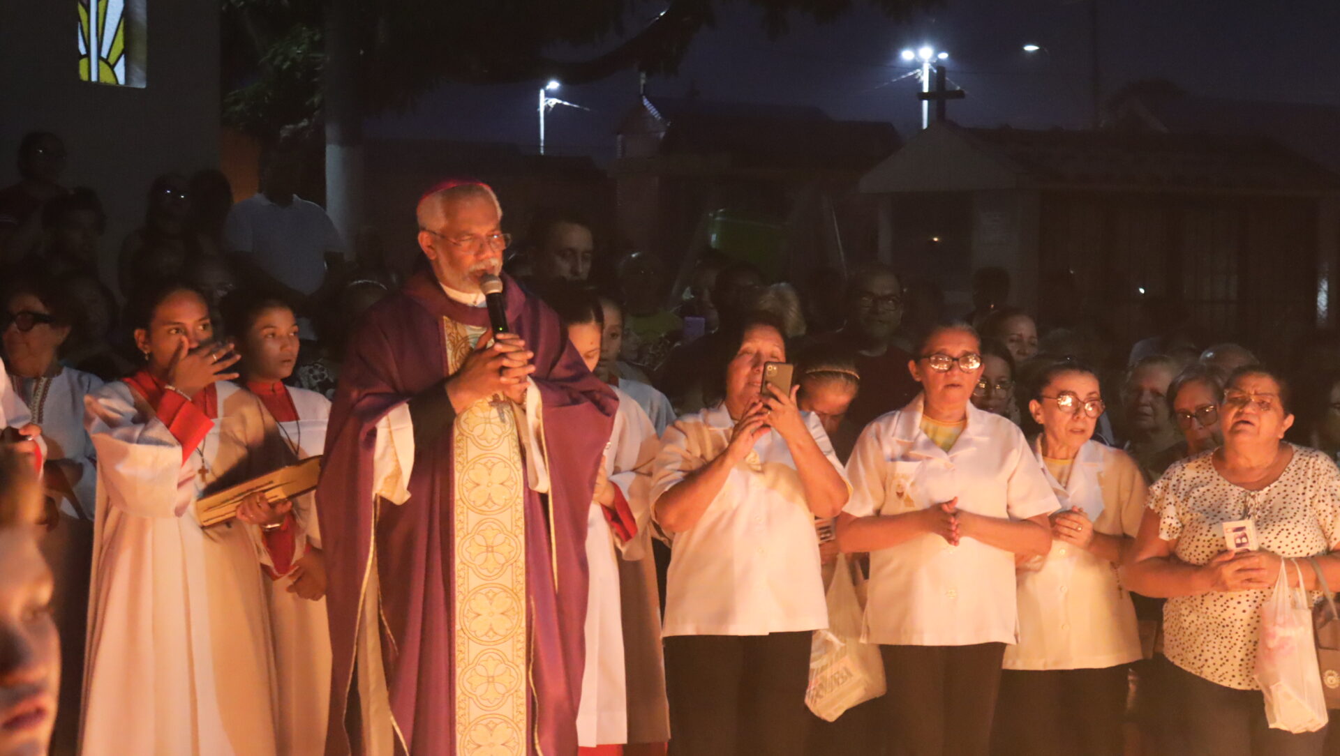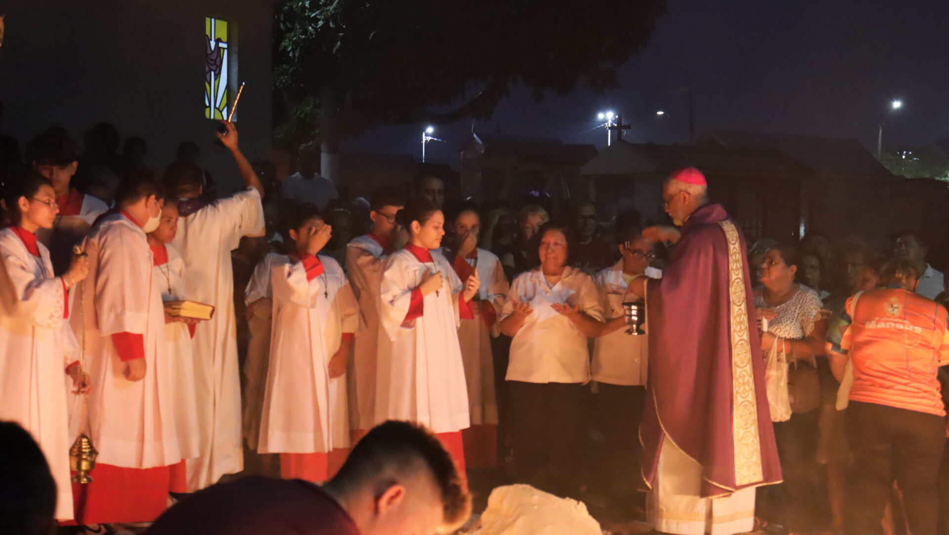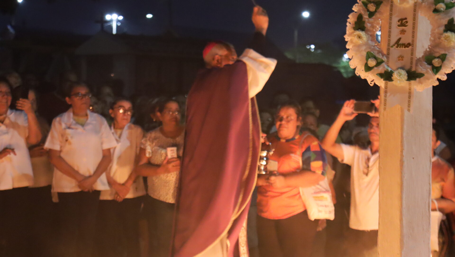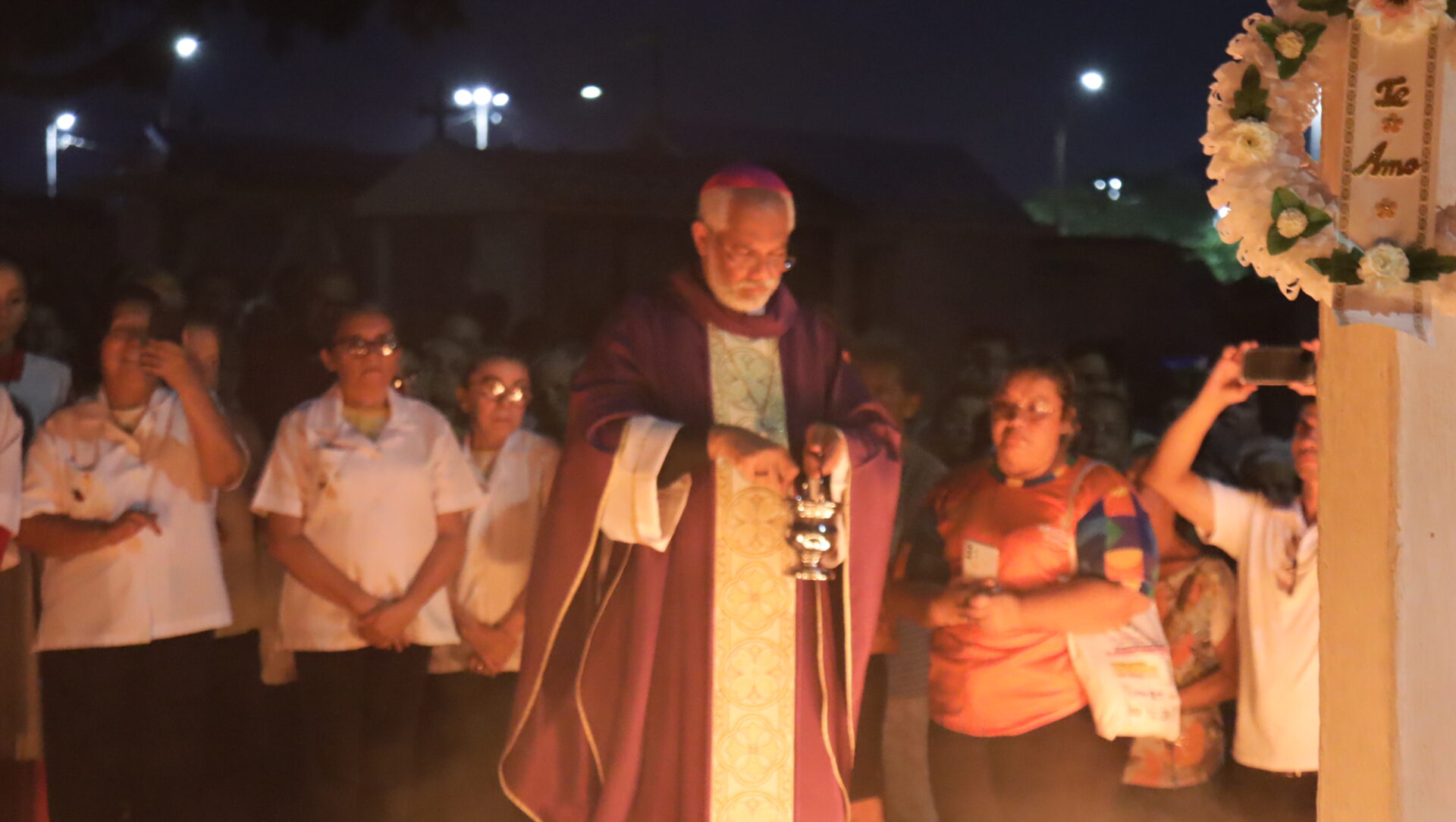 Ao final da celebração, fomos em procissão até o Cruzeiro. “Indo e vindo, trevas e luz. Tudo é graça, Deus nos conduz!” Mons. Zenildo abençoou, aspergindo, o cruzeiro e os presentes.