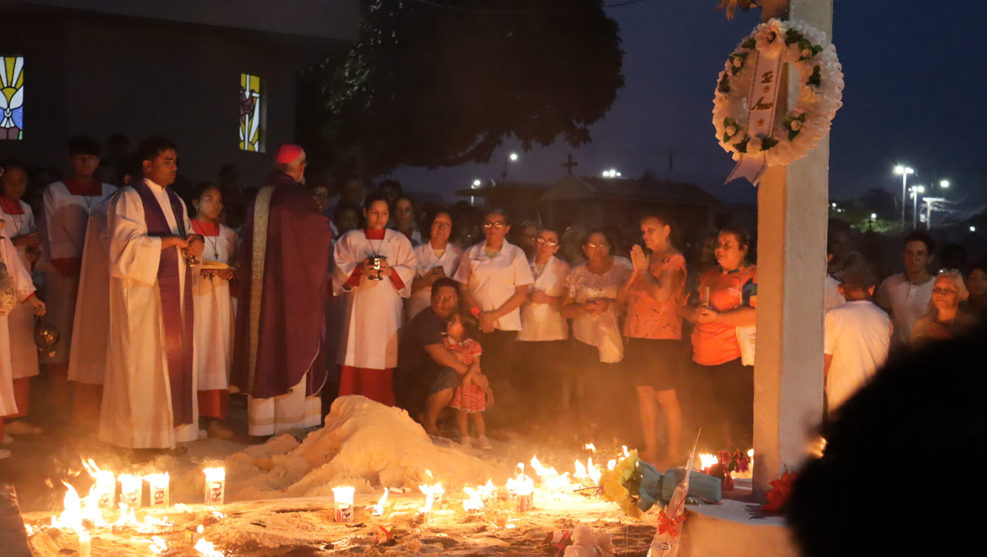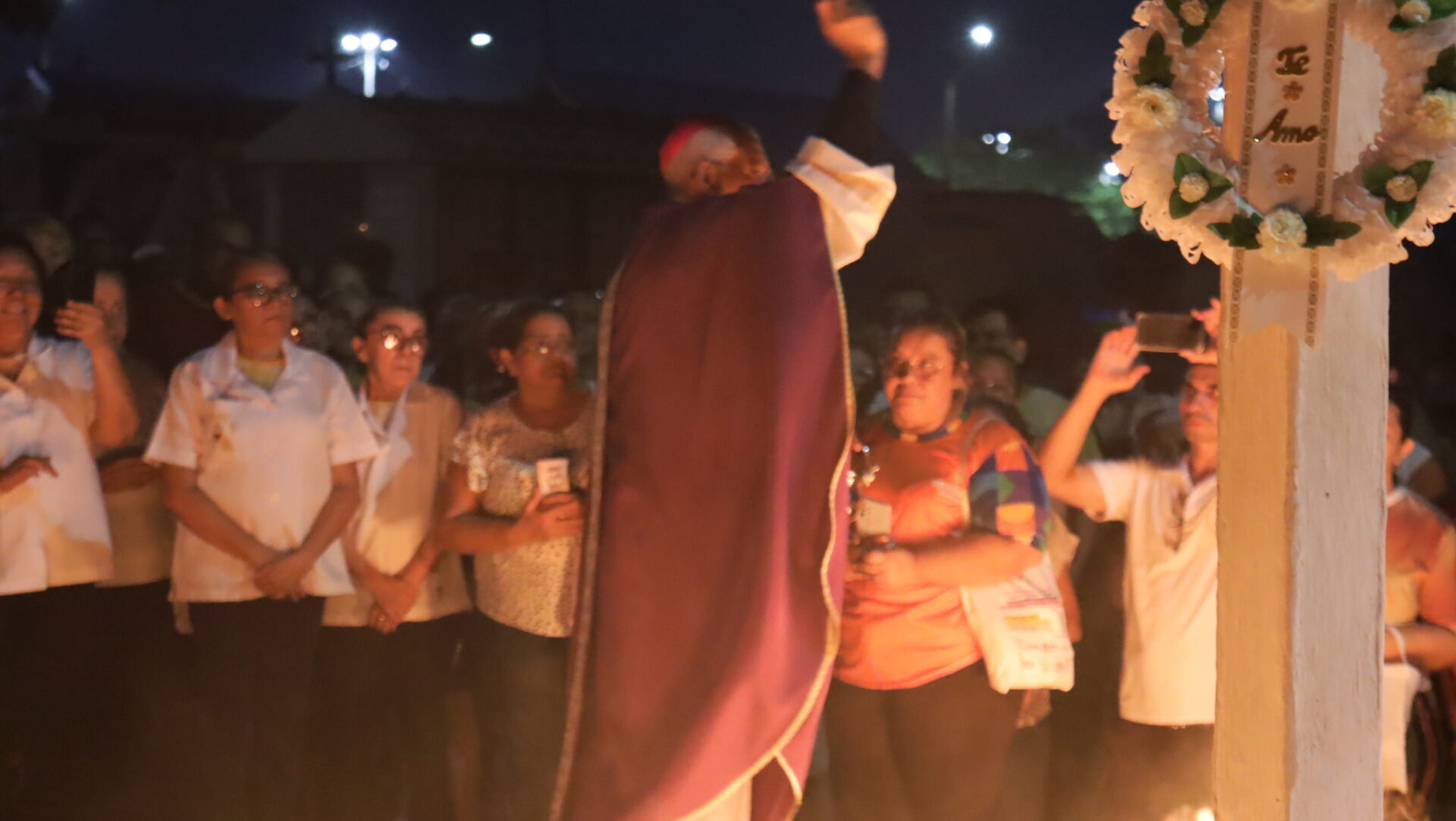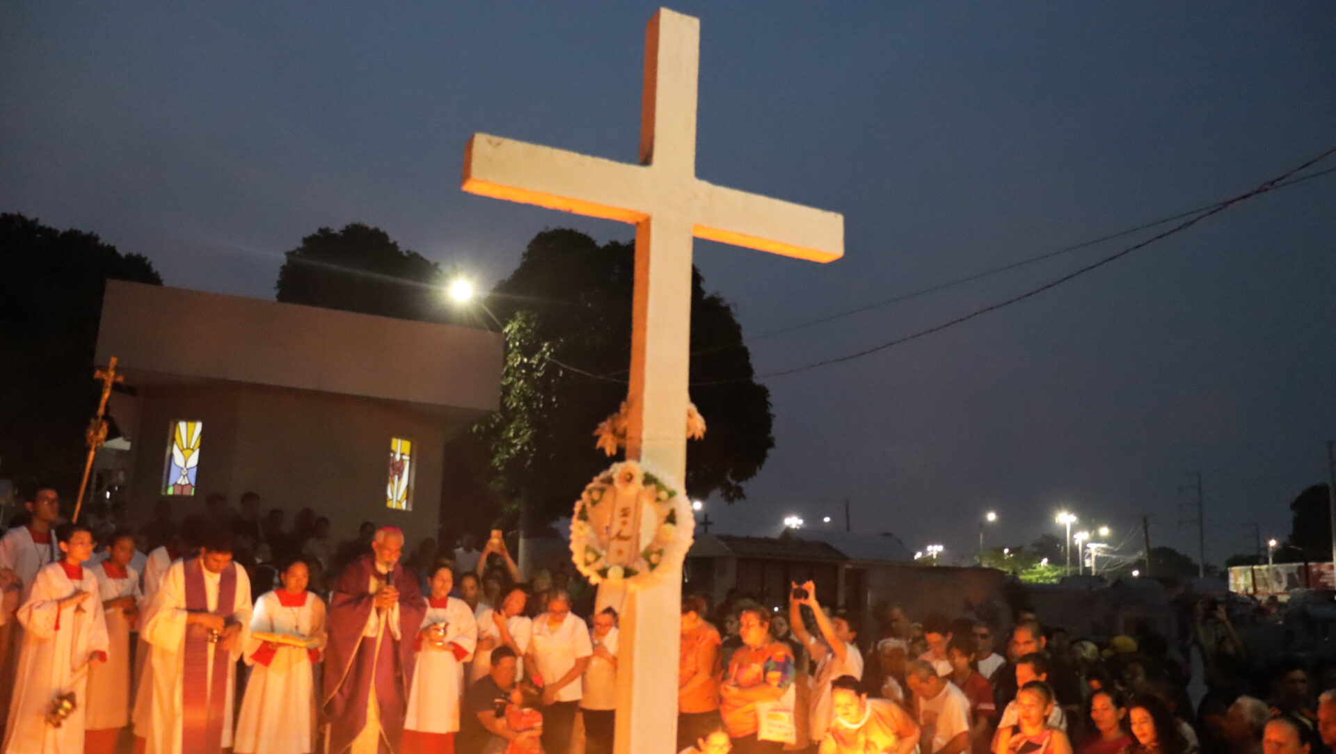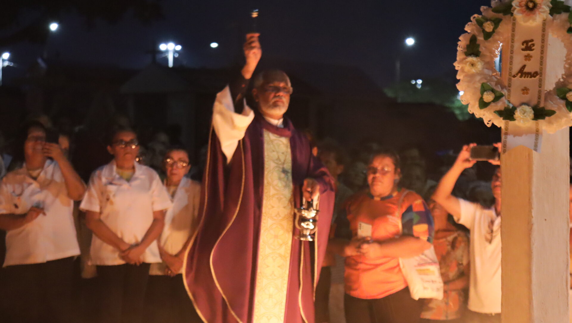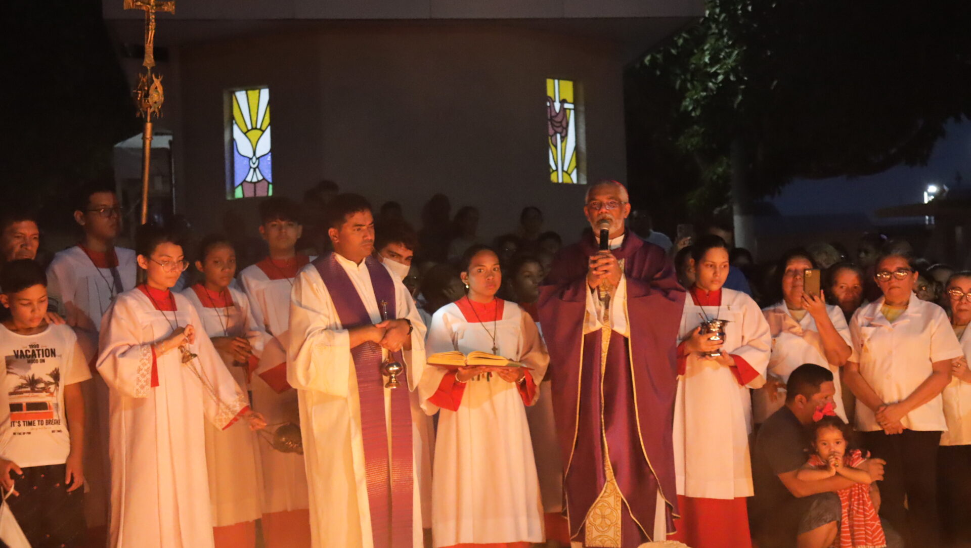 Ao final da celebração, fomos em procissão até o Cruzeiro. “Indo e vindo, trevas e luz. Tudo é graça, Deus nos conduz!” Mons. Zenildo abençoou, aspergindo, o cruzeiro e os presentes.