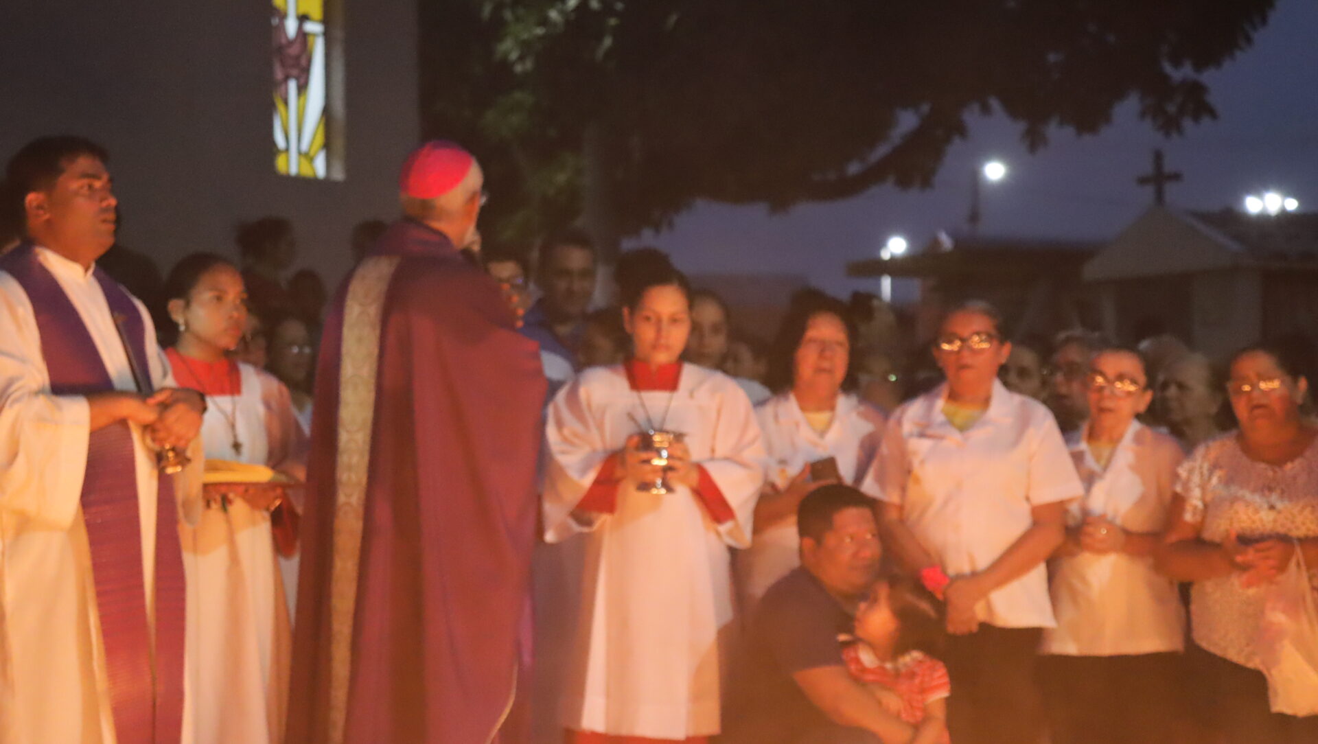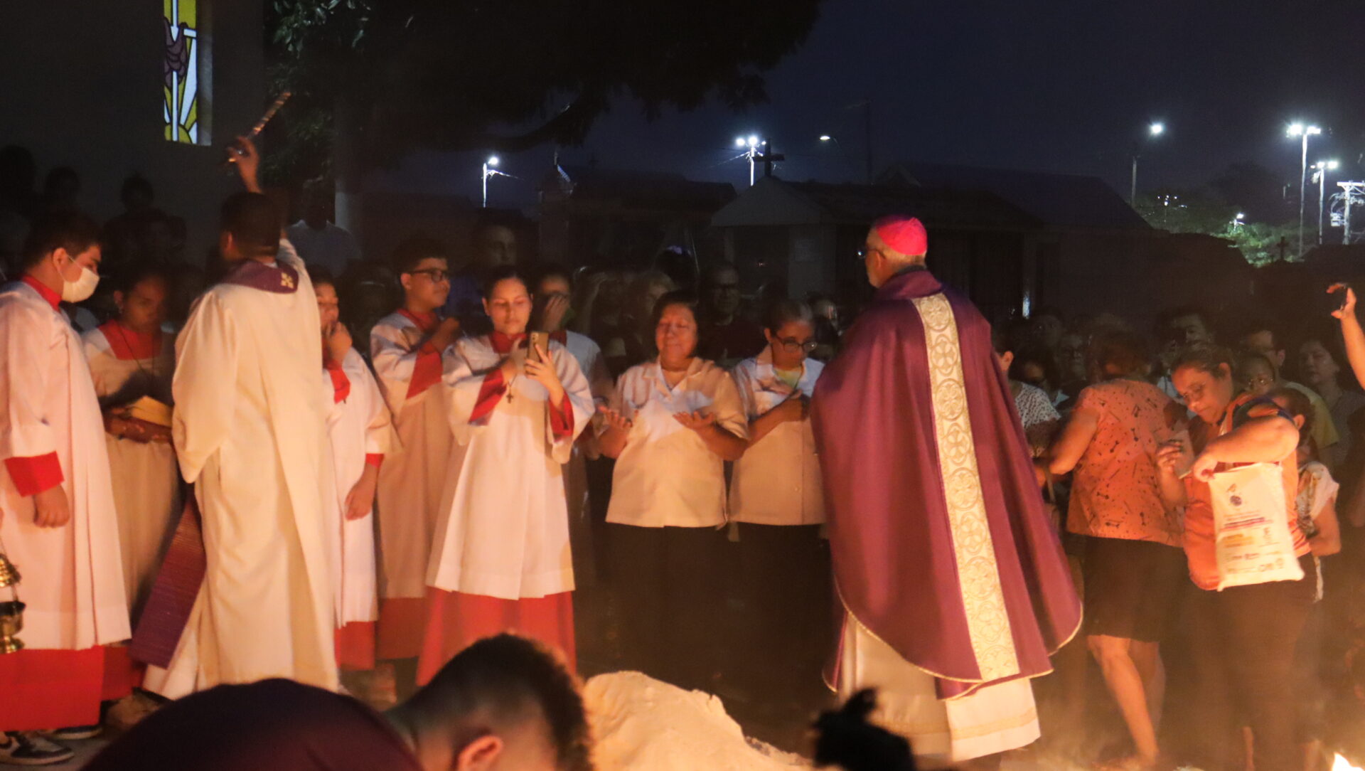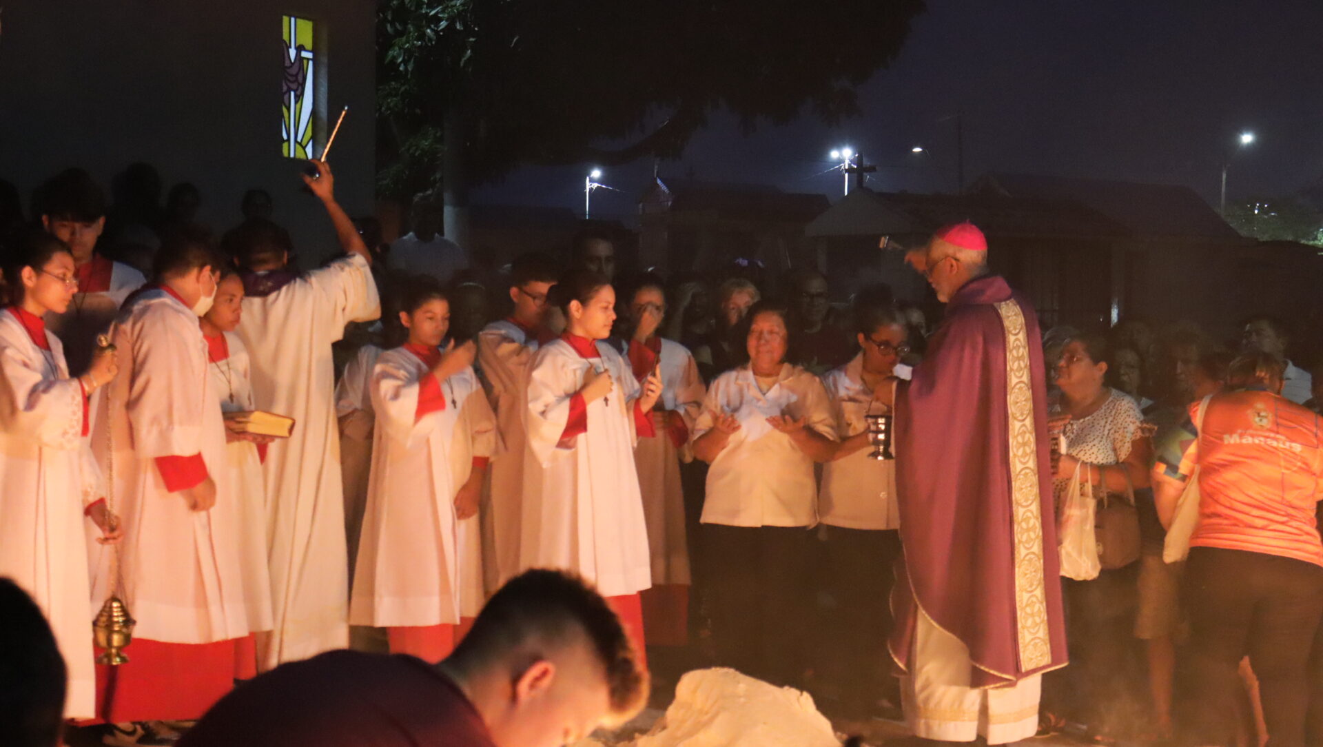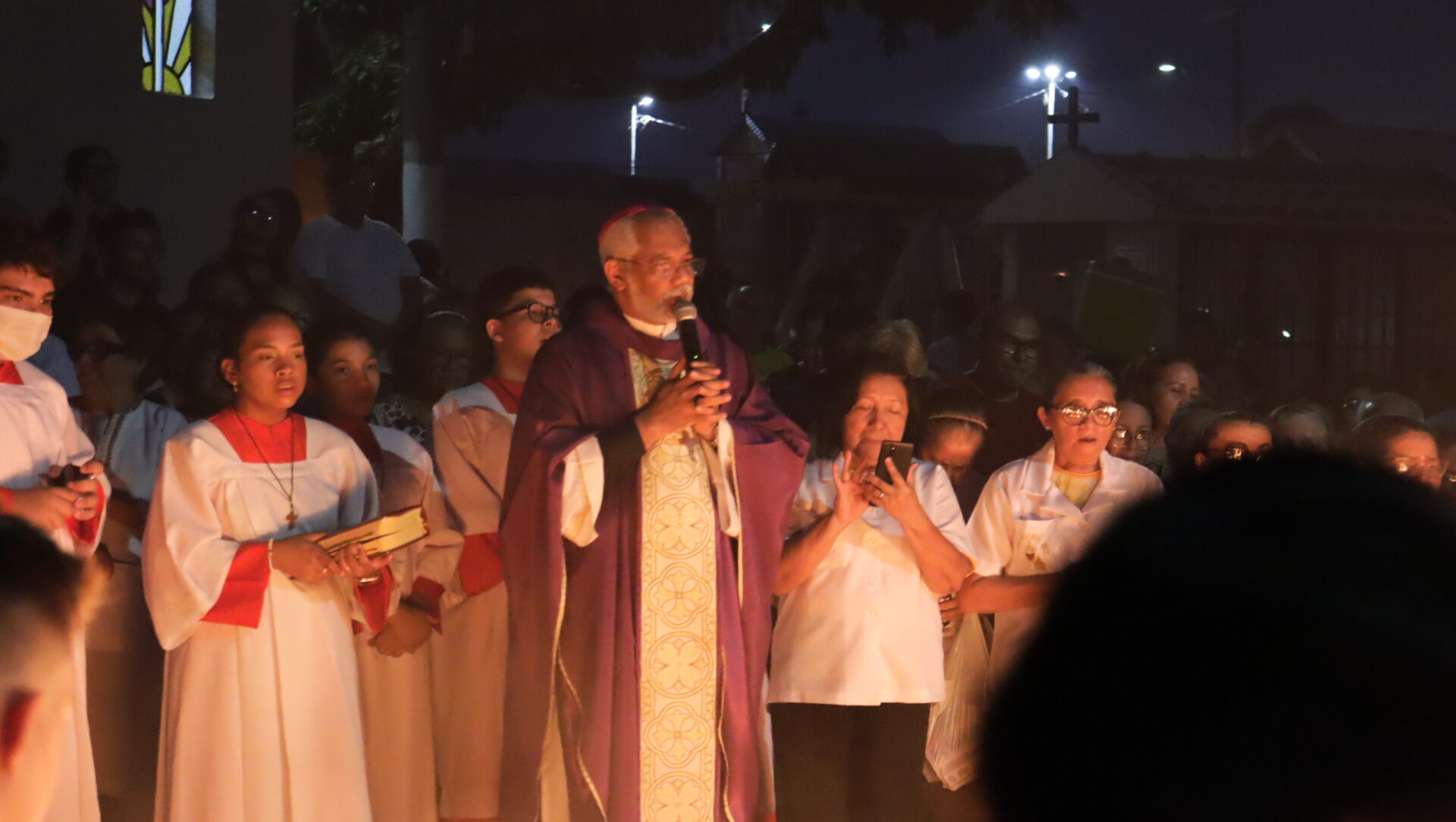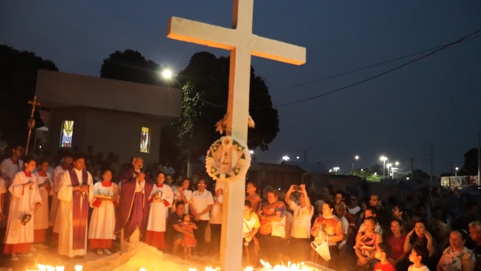 Ao final da celebração, fomos em procissão até o Cruzeiro. “Indo e vindo, trevas e luz. Tudo é graça, Deus nos conduz!” Mons. Zenildo abençoou, aspergindo, o cruzeiro e os presentes.