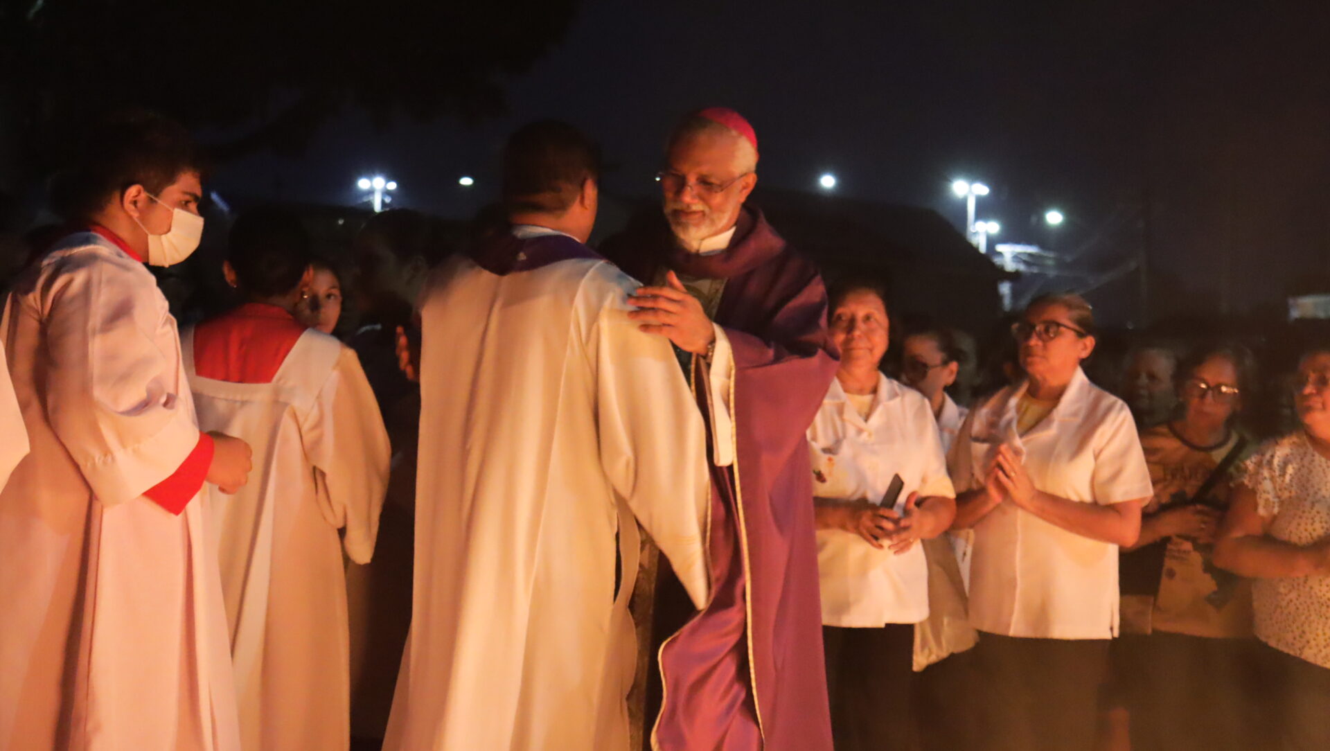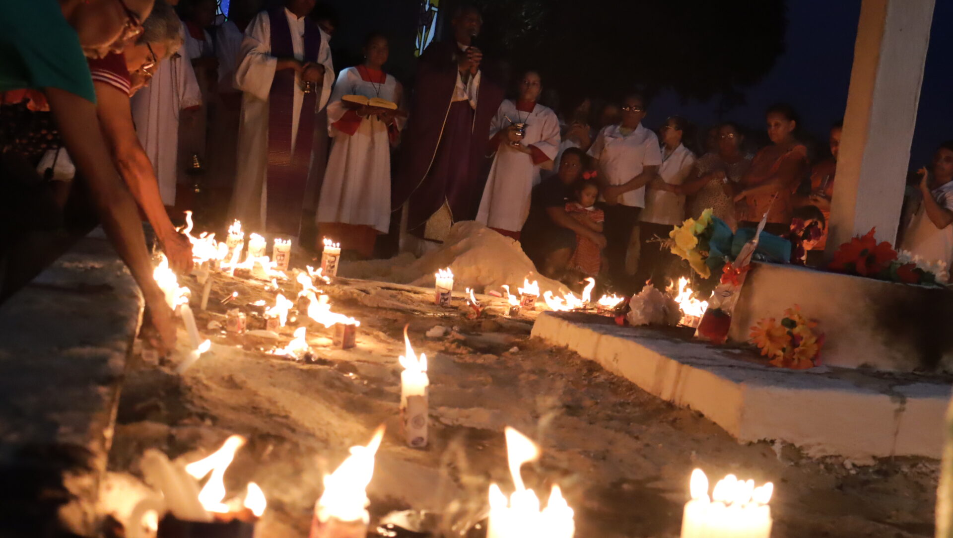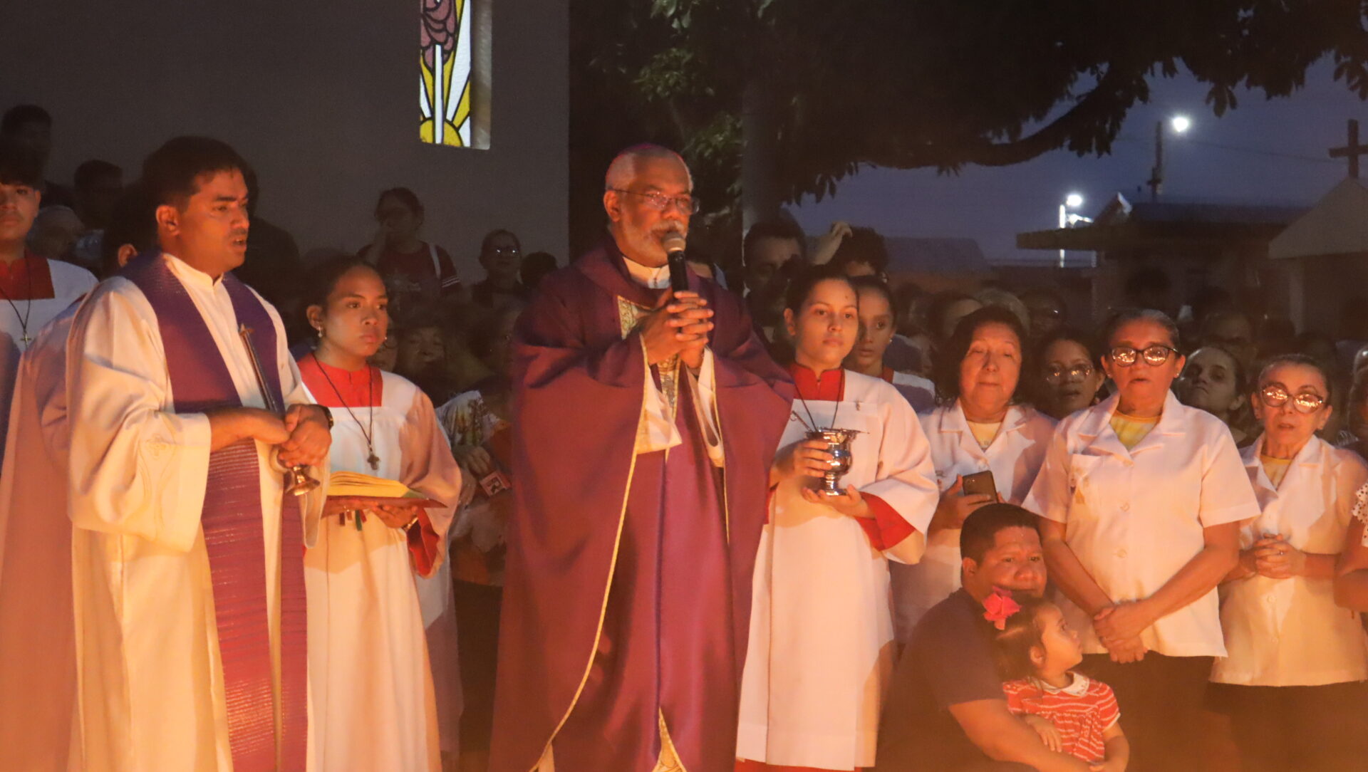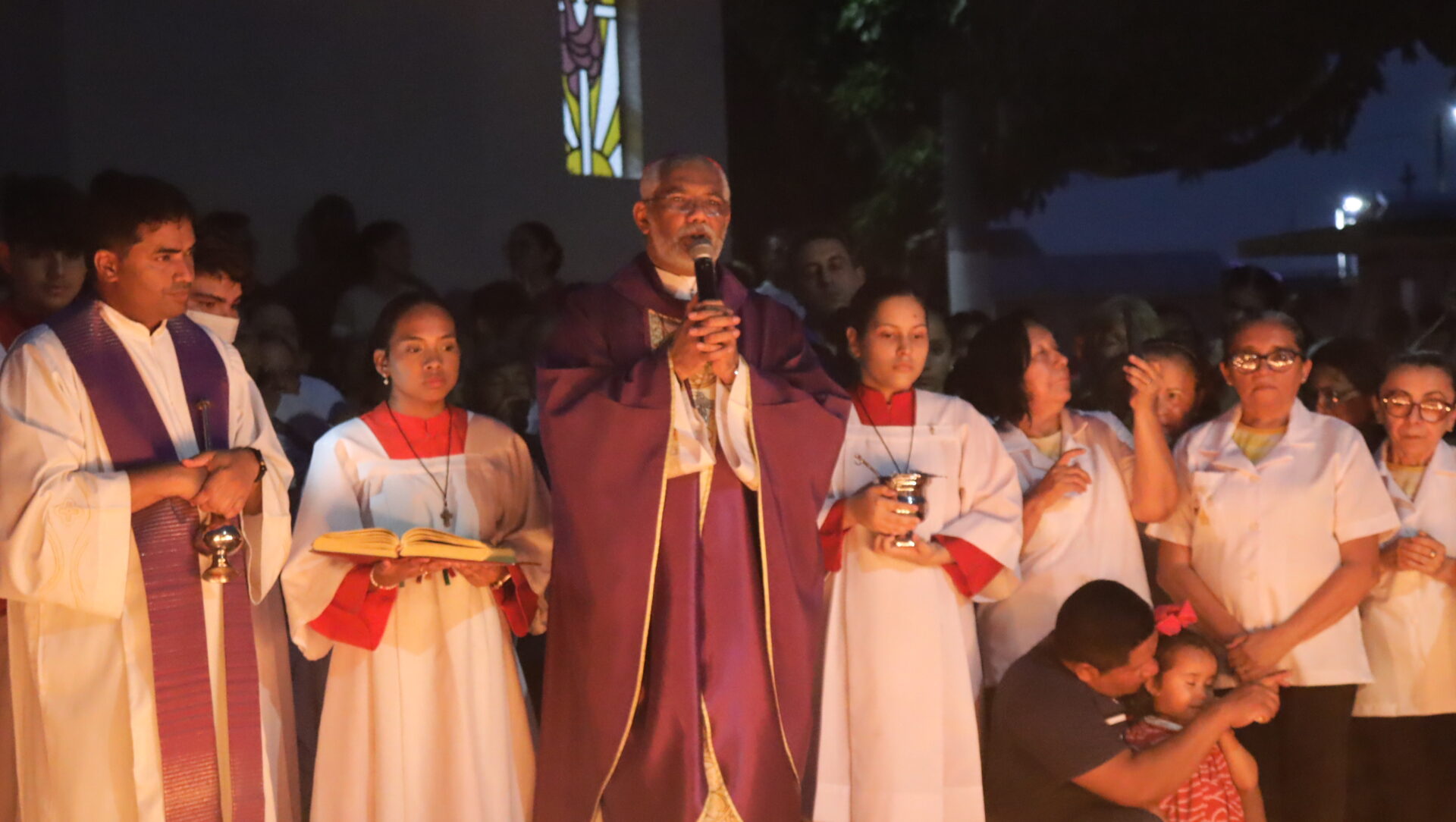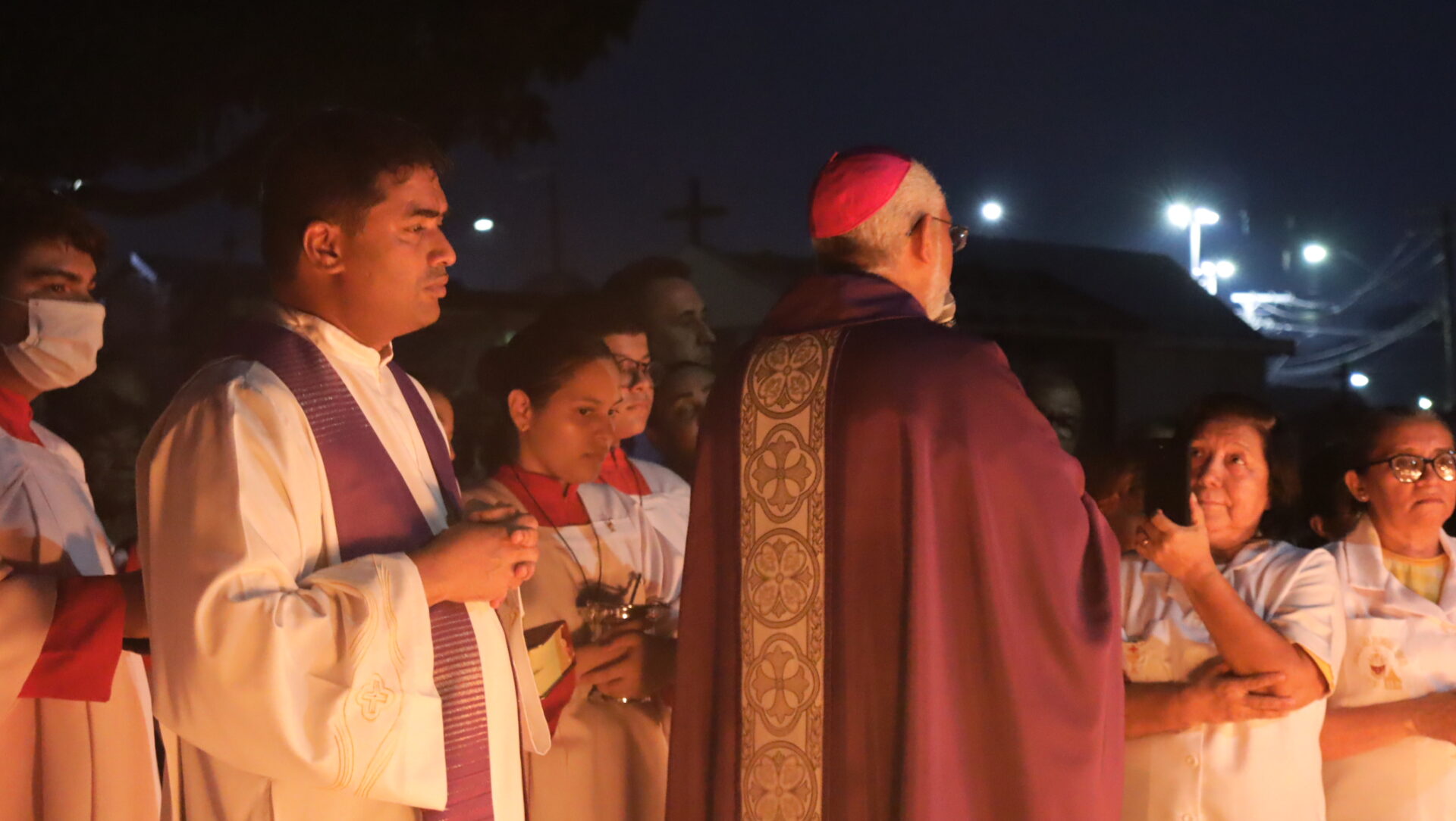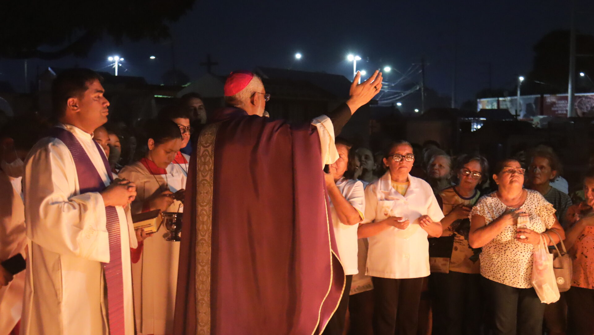 Ao final da celebração, fomos em procissão até o Cruzeiro. “Indo e vindo, trevas e luz. Tudo é graça, Deus nos conduz!” Mons. Zenildo abençoou, aspergindo, o cruzeiro e os presentes.