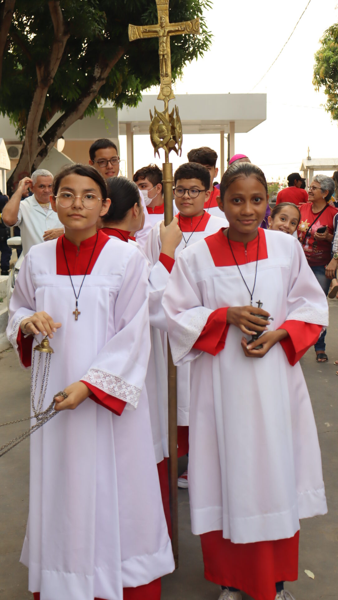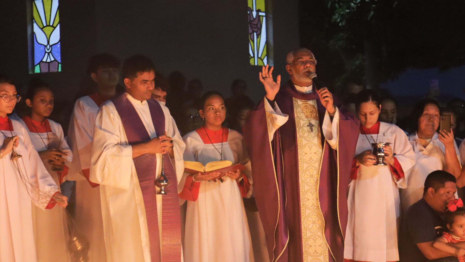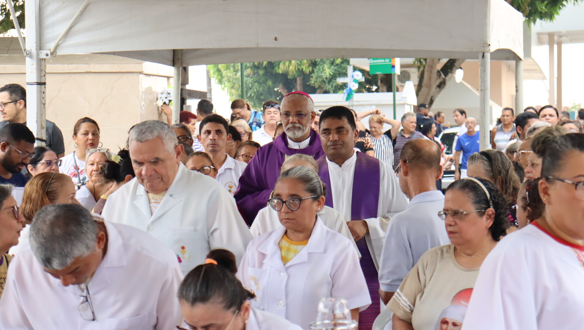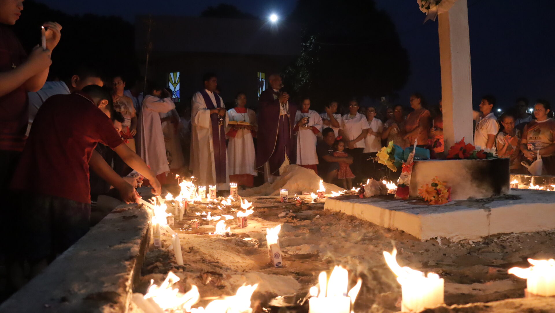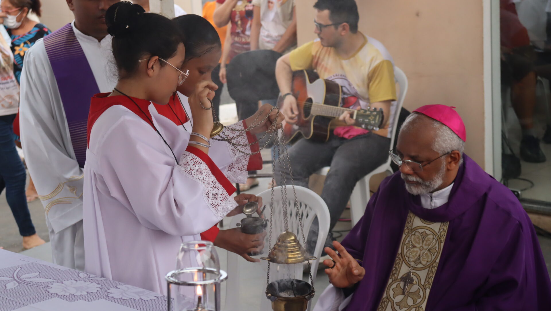 Ao final da celebração, fomos em procissão até o Cruzeiro. “Indo e vindo, trevas e luz. Tudo é graça, Deus nos conduz!” Mons. Zenildo abençoou, aspergindo, o cruzeiro e os presentes.