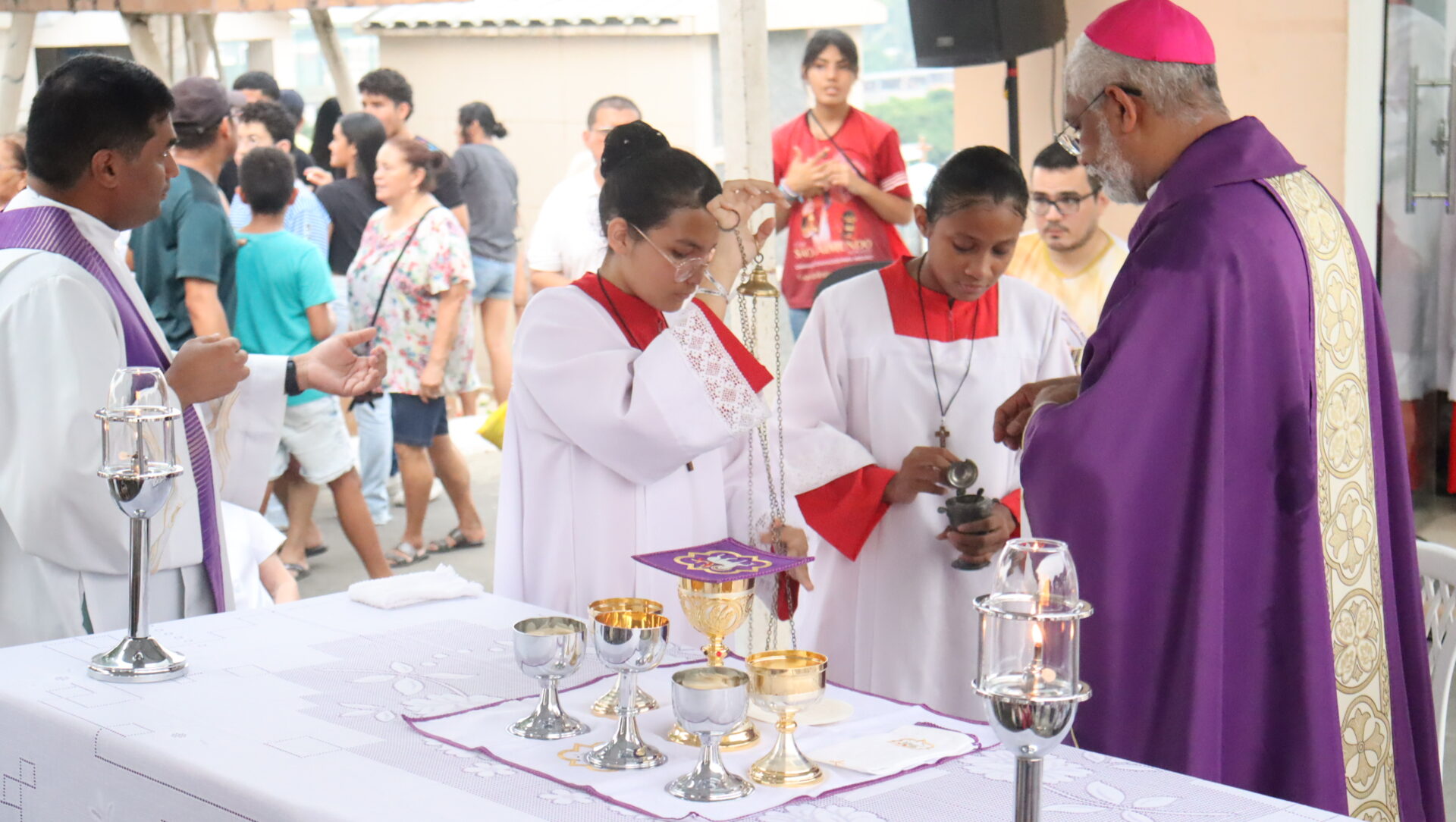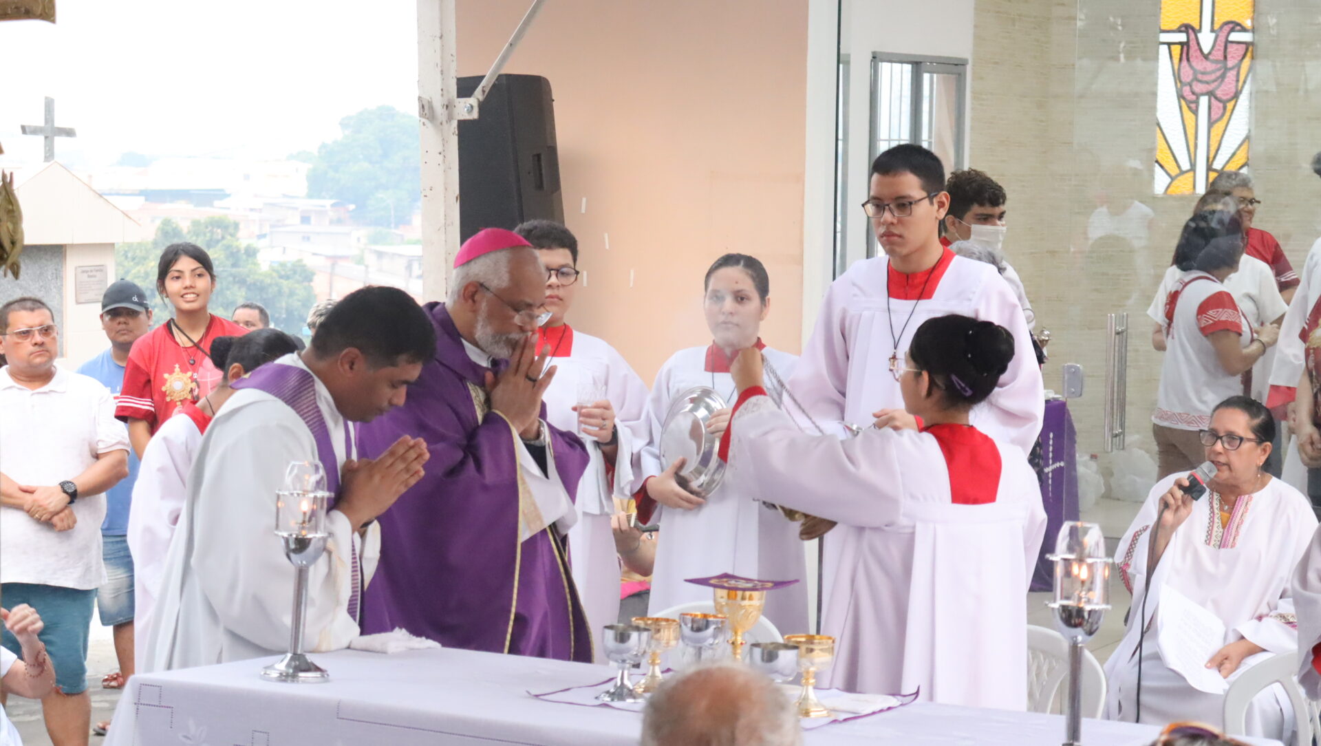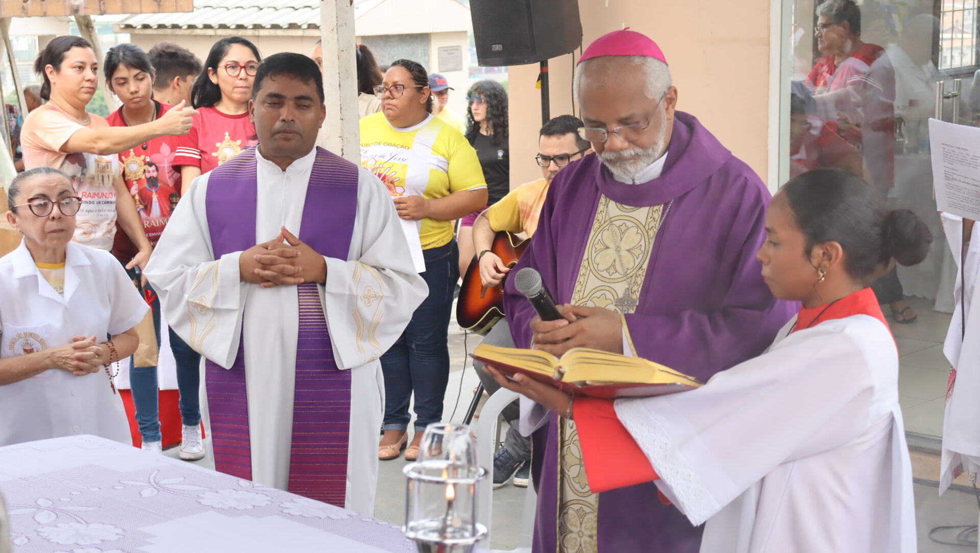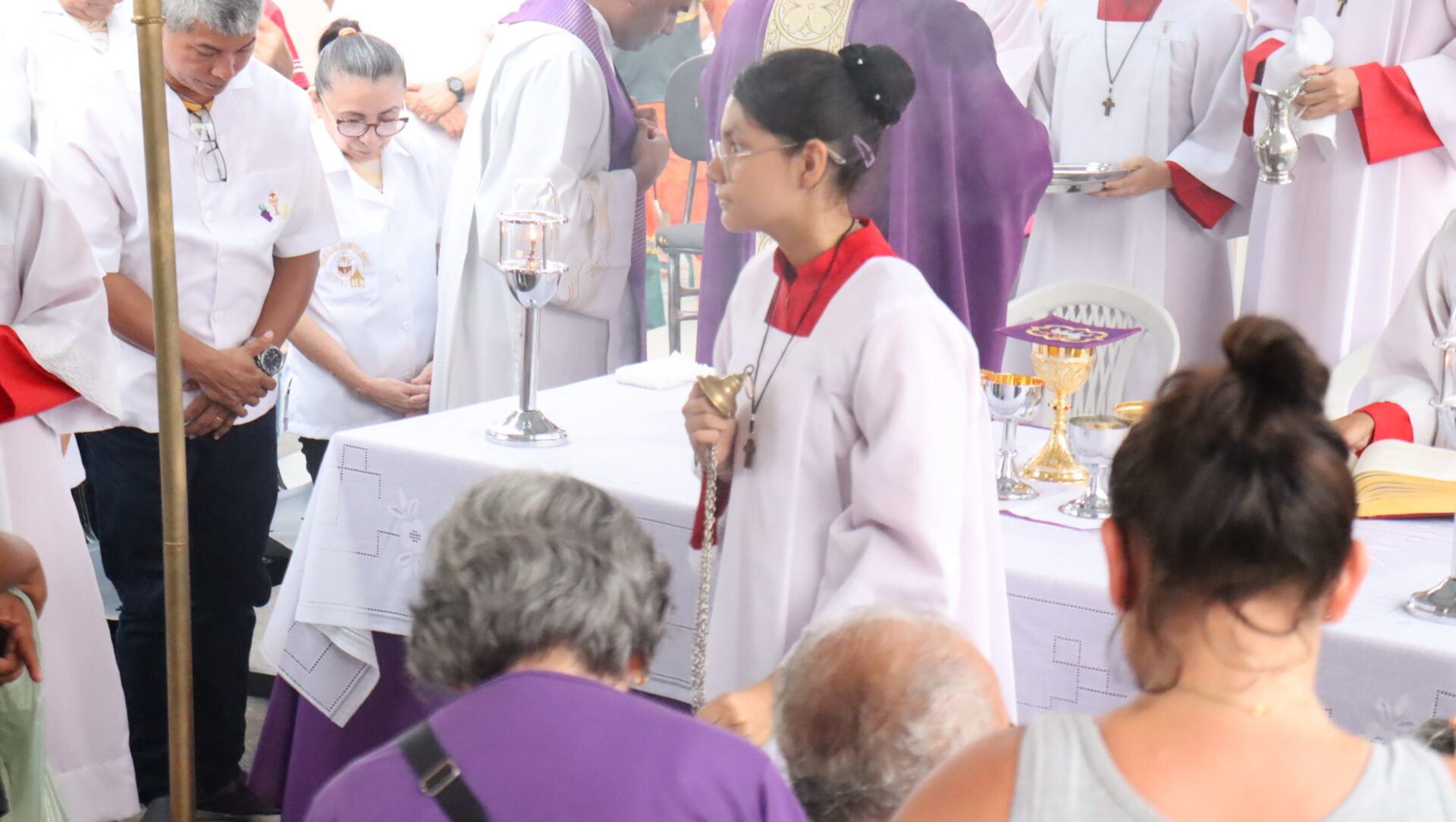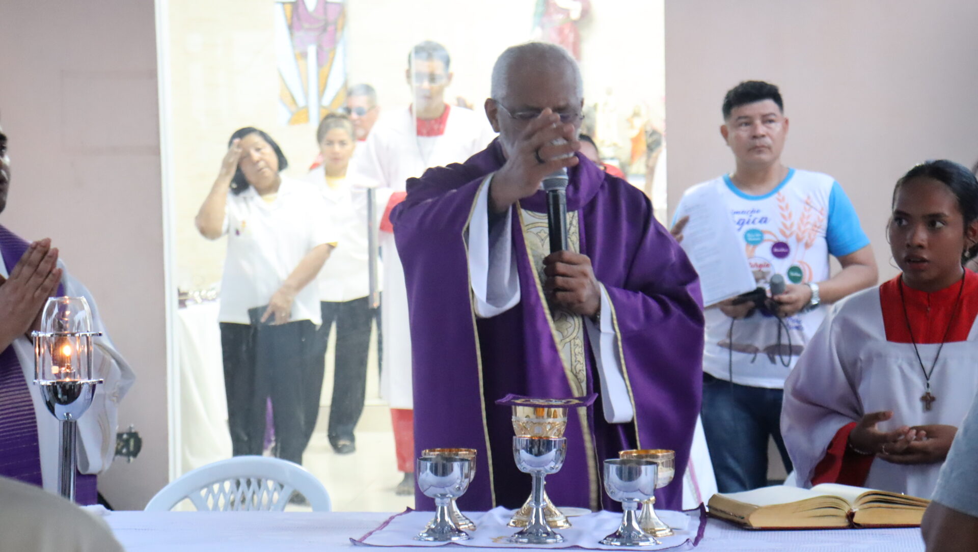 Ao final da celebração, fomos em procissão até o Cruzeiro. “Indo e vindo, trevas e luz. Tudo é graça, Deus nos conduz!” Mons. Zenildo abençoou, aspergindo, o cruzeiro e os presentes.