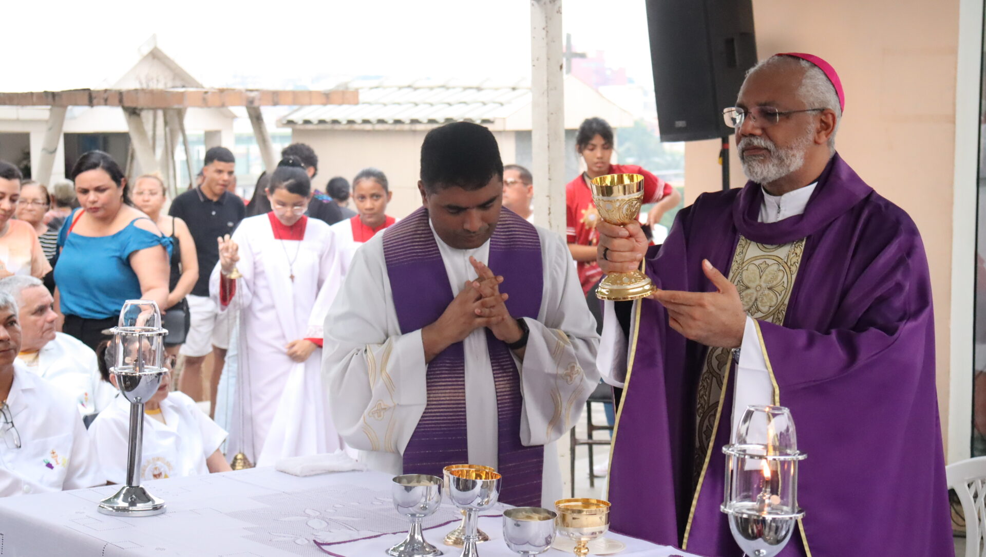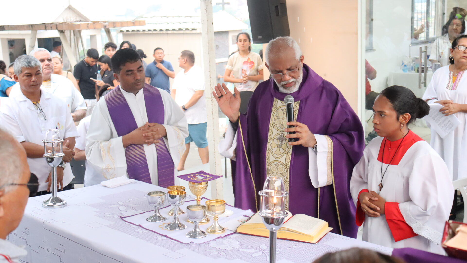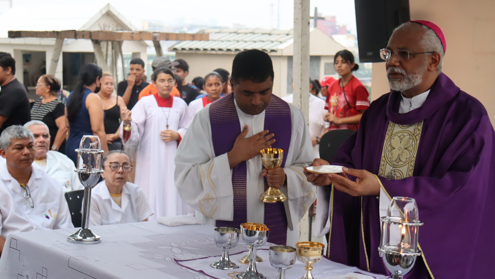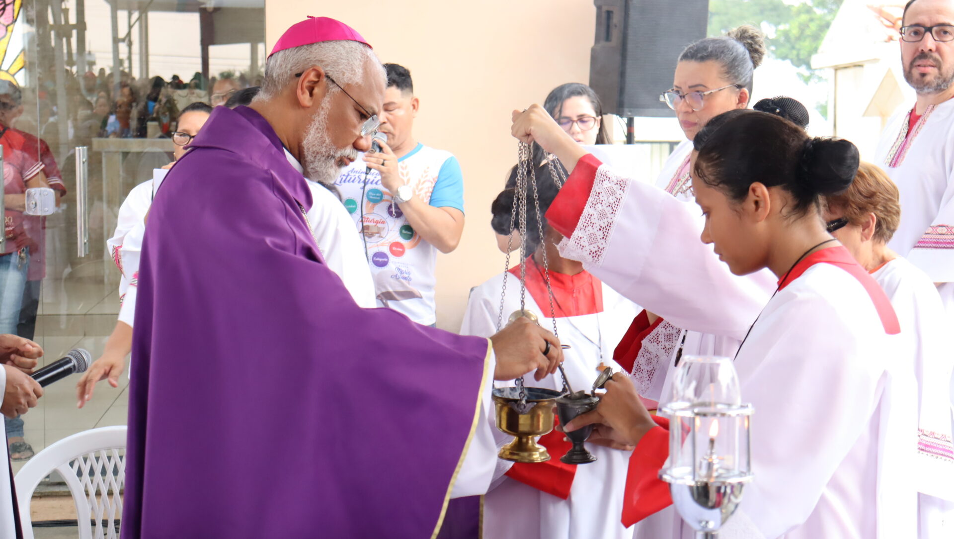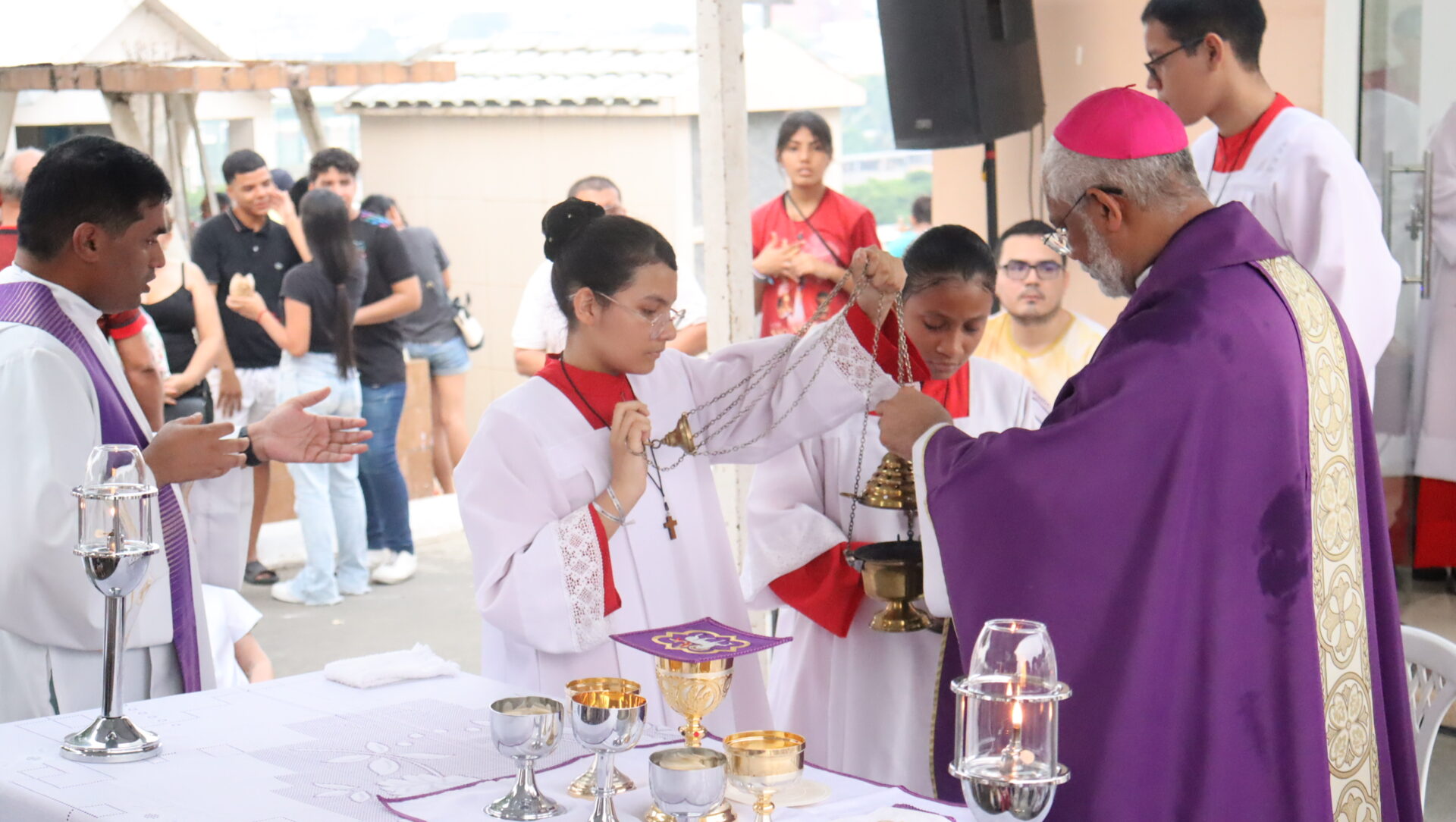 Ao final da celebração, fomos em procissão até o Cruzeiro. “Indo e vindo, trevas e luz. Tudo é graça, Deus nos conduz!” Mons. Zenildo abençoou, aspergindo, o cruzeiro e os presentes.