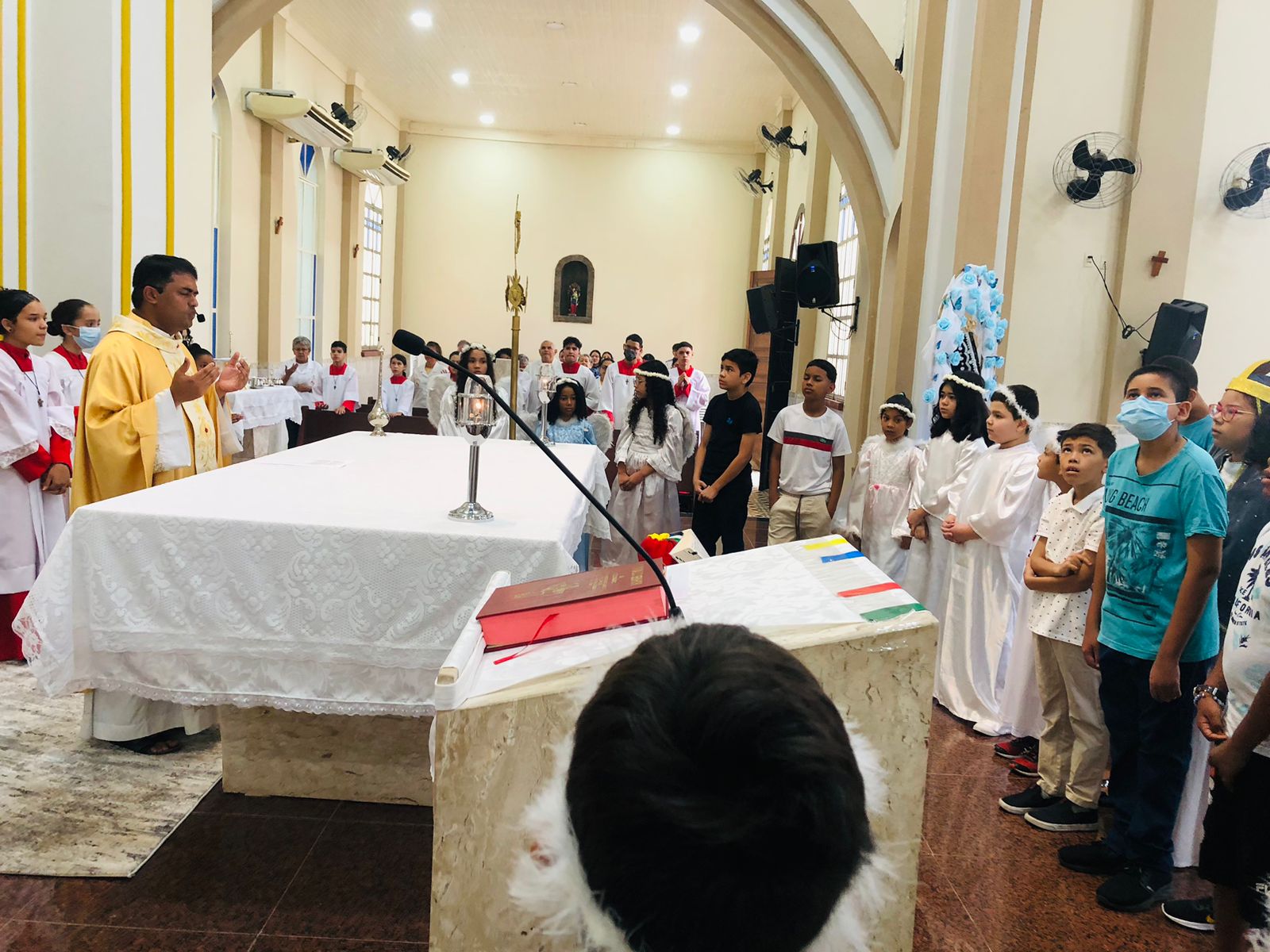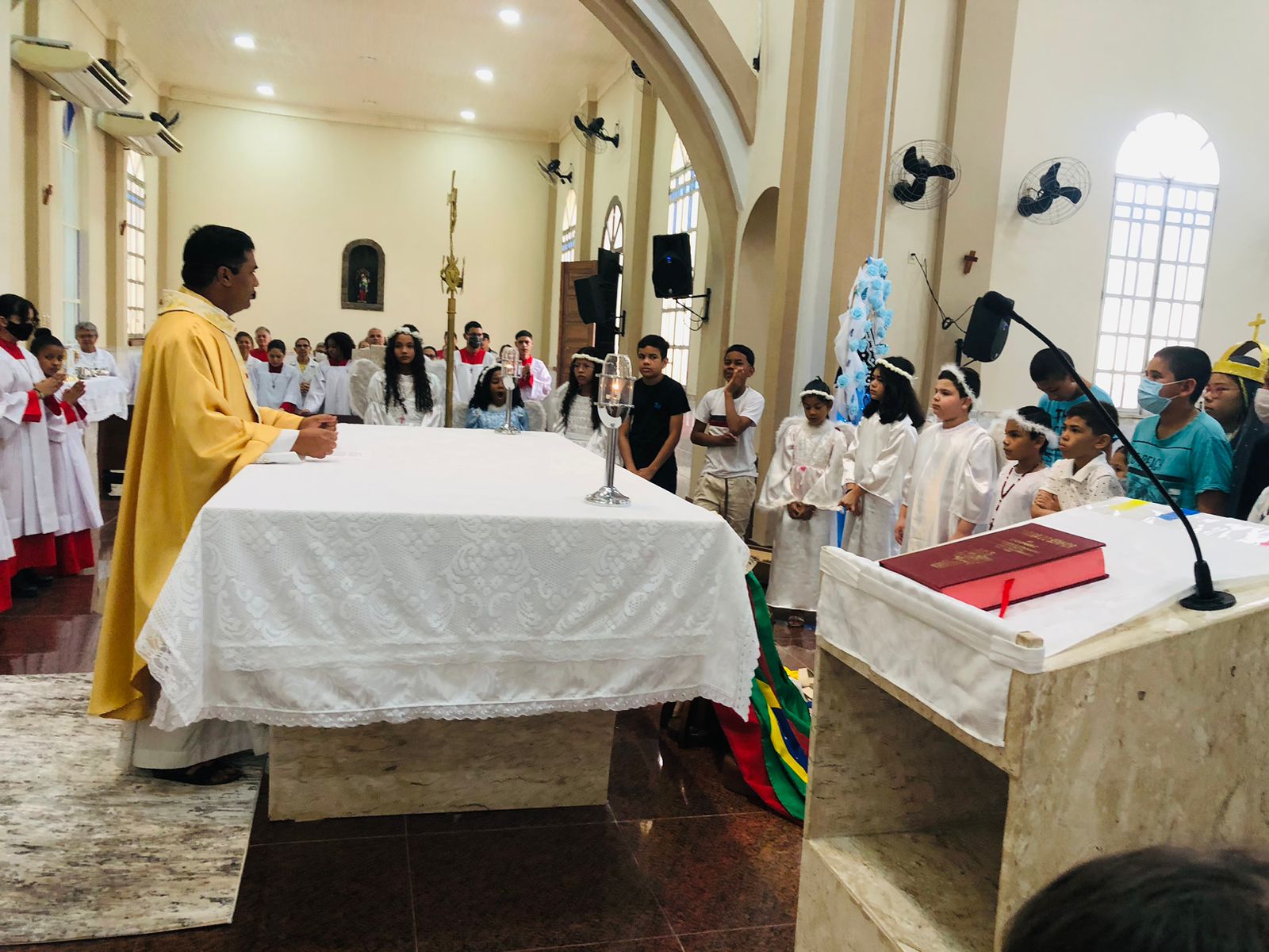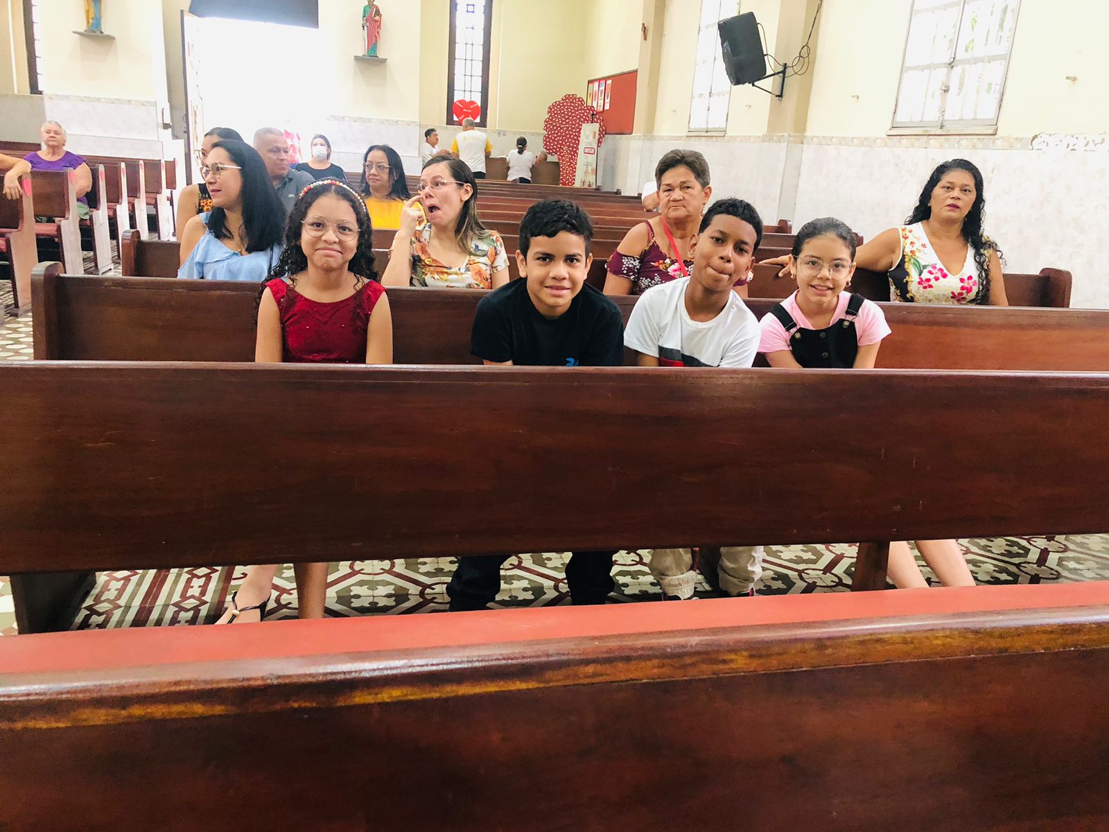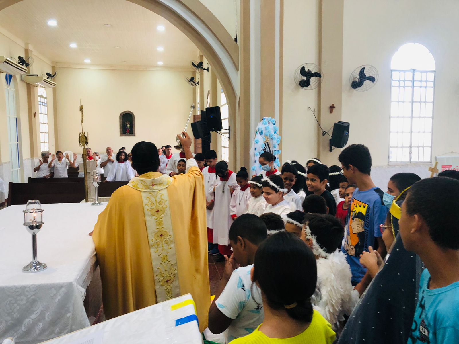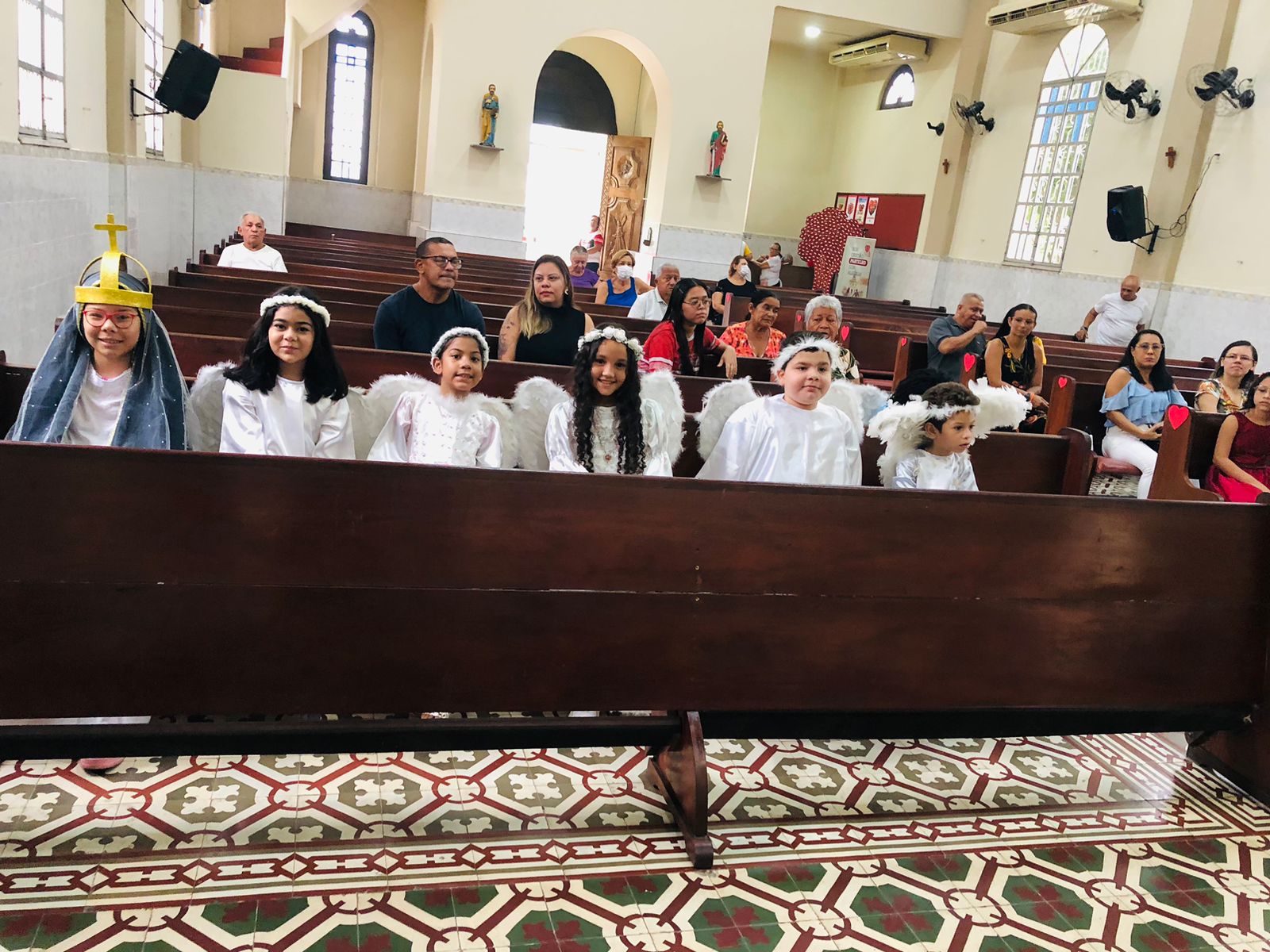Crianças vestidas de anjo e, uma delas, de Nossa Senhora Aparecida levaram o manto em procissão para colocar sobre a imagem que se encontrava em destaque. Foi uma linda celebração com a participação das três Comunidades: São Raimundo Nonato, São Vicente de Paulo e Beata Maria Assunta.