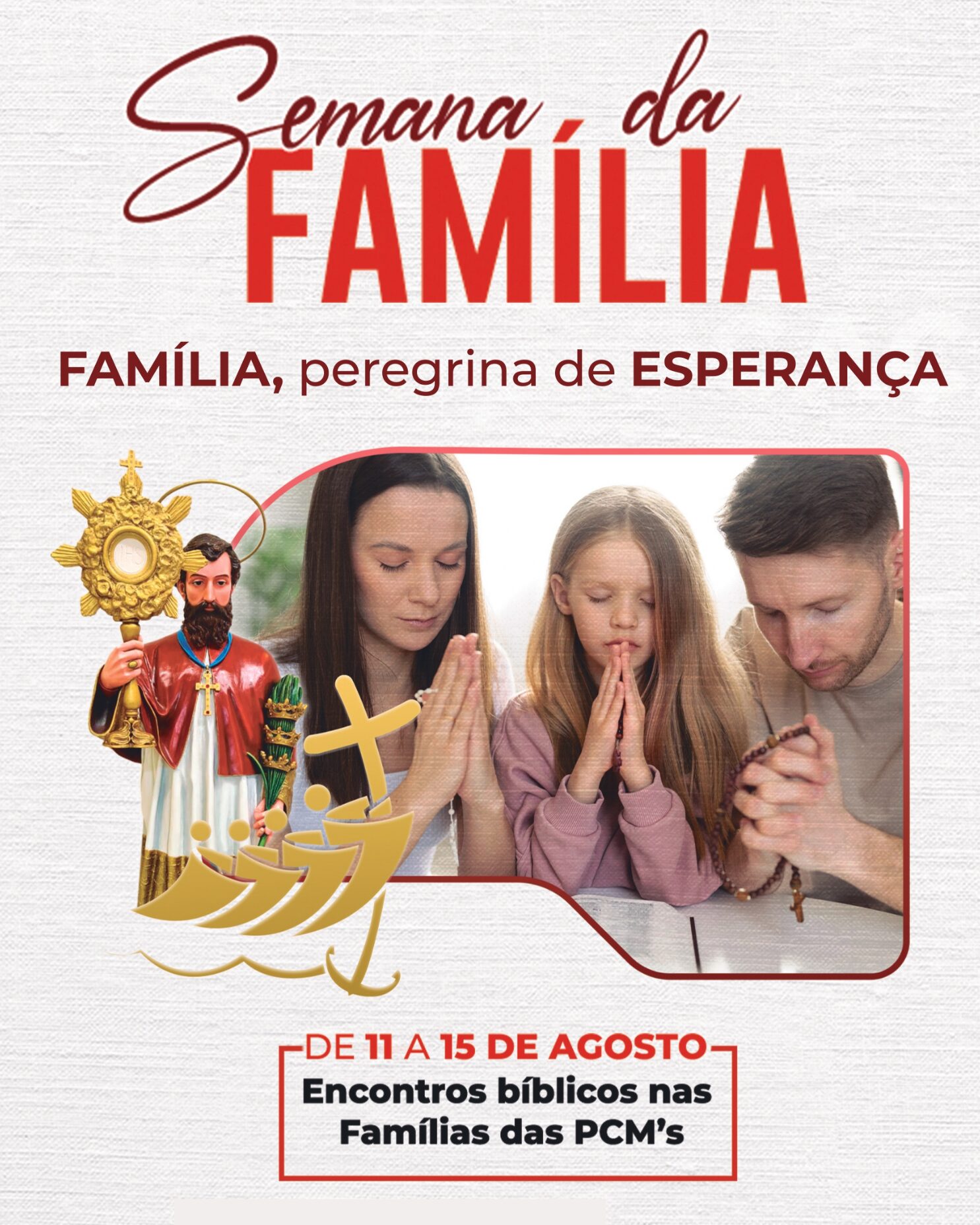 Este é um convite para rezar com as famílias e pelas famílias. O essencial é termos um momento em família e de família. Sendo o mês de agosto o mês do nosso padroeiro, acrescentamos um encontro (quarto encontro) com oração dedicada a São Raimundo Nonato. Convidamos o animador de cada PCM a organizar um momento para rezar a oração ao santo padroeiro da paróquia, seja em um encontro específico ou ao final dos encontros da Semana da Família.
