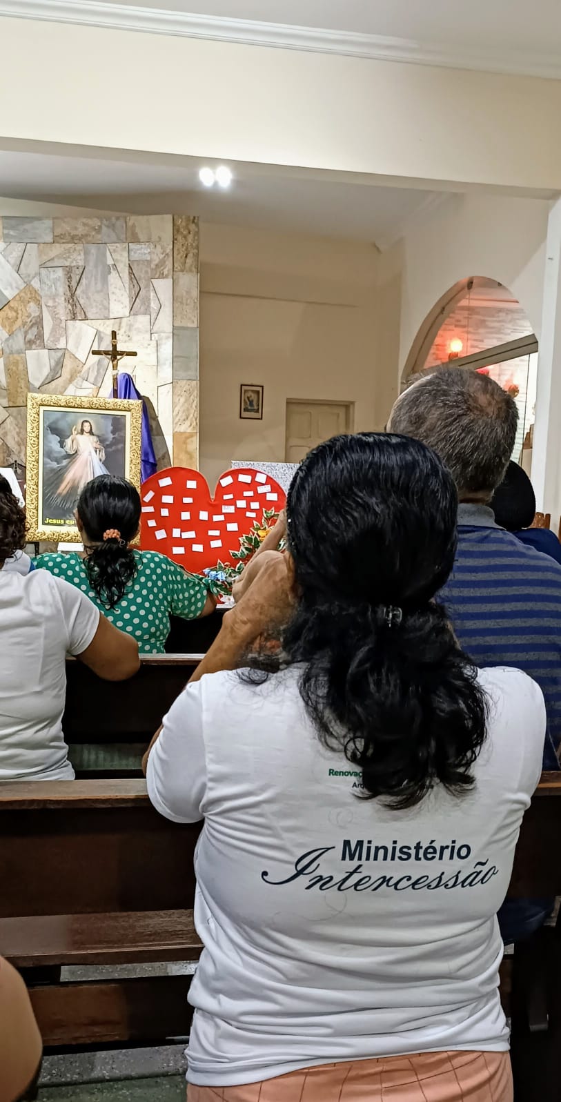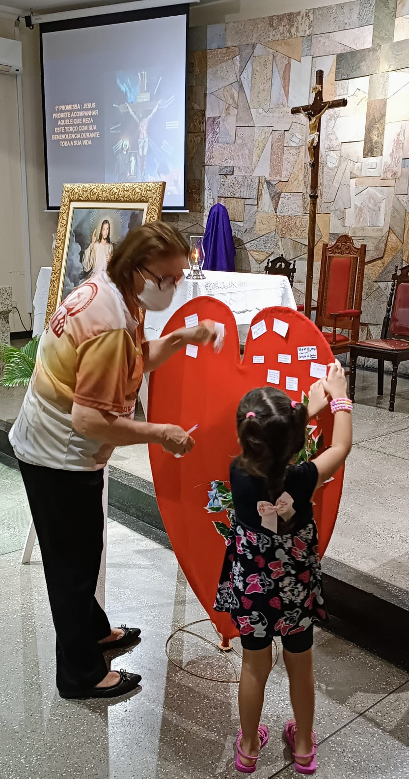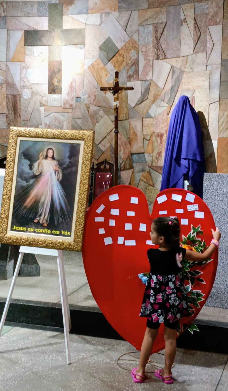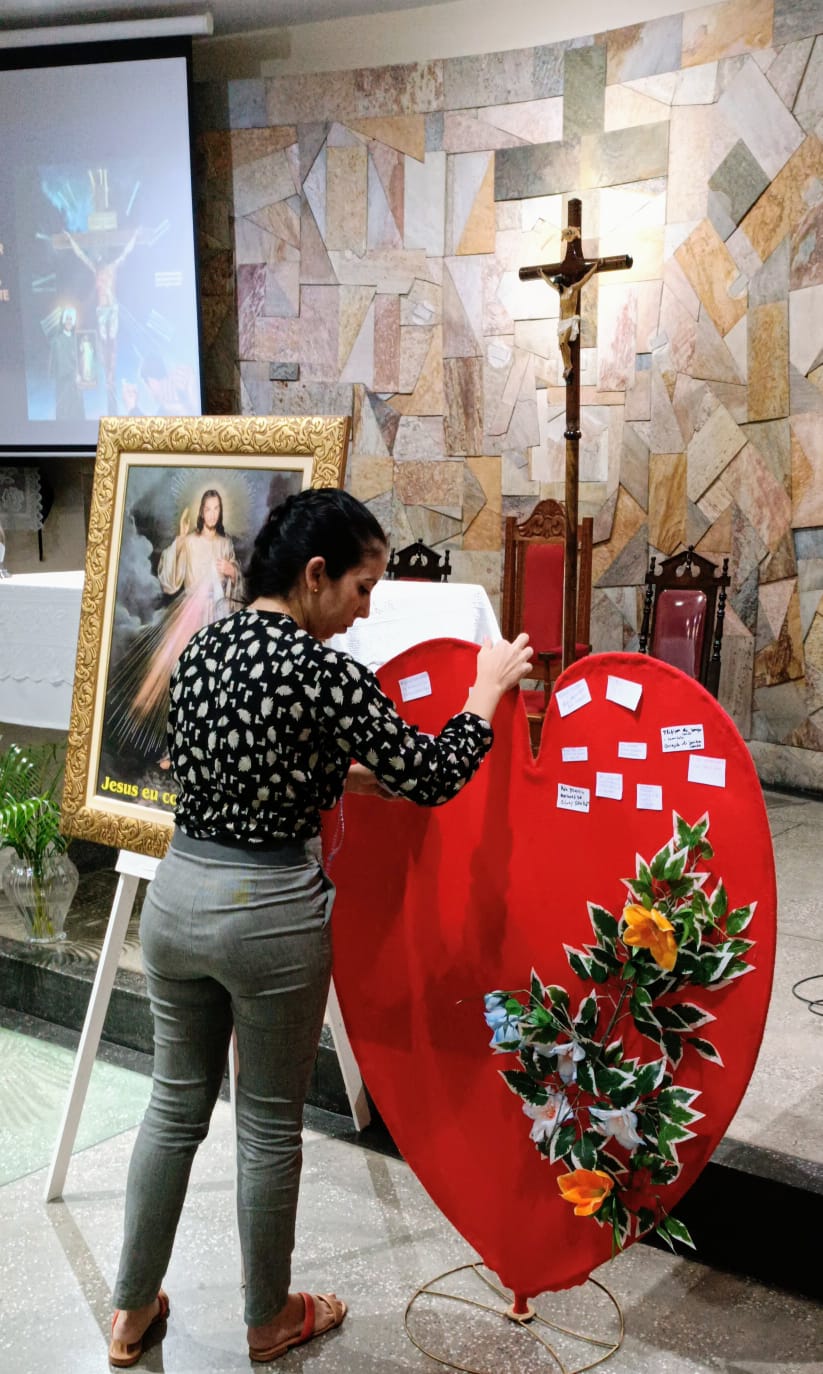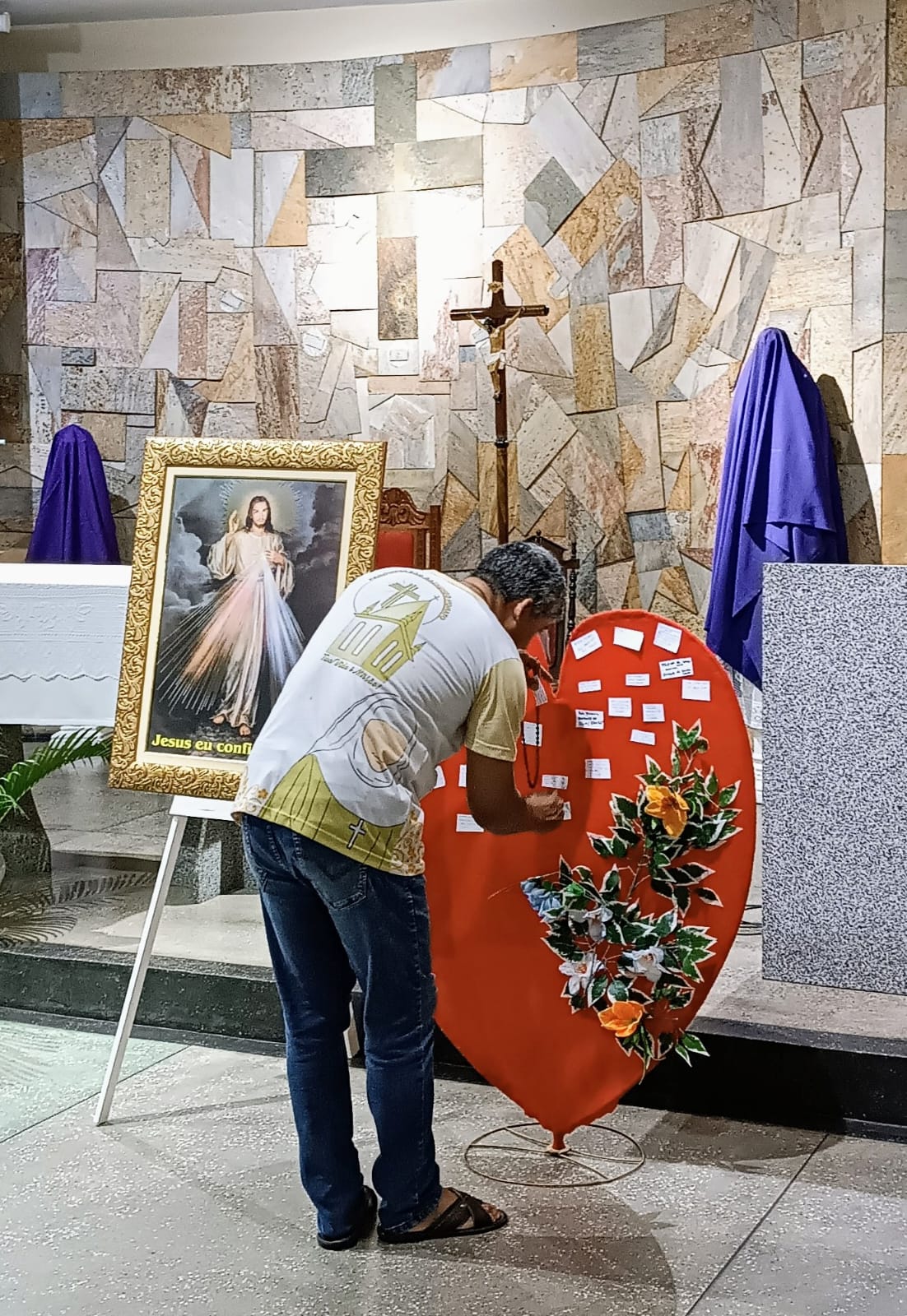 assembléia, em uma breve dinâmica, escreveu e colou no coração ao lado do quadro de Jesus Misericordioso, o nome de pessoas que gostariam que estivessem presente.