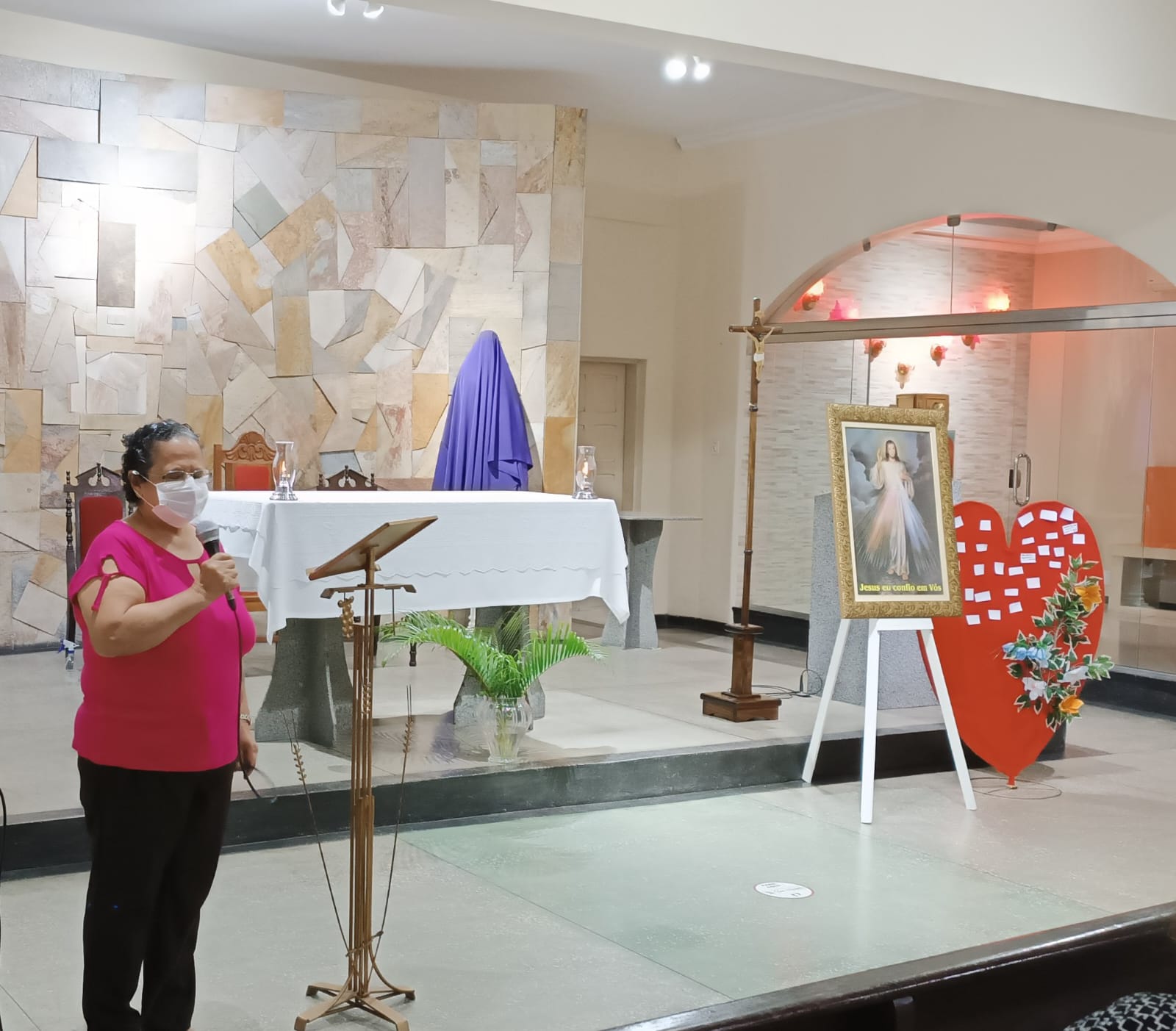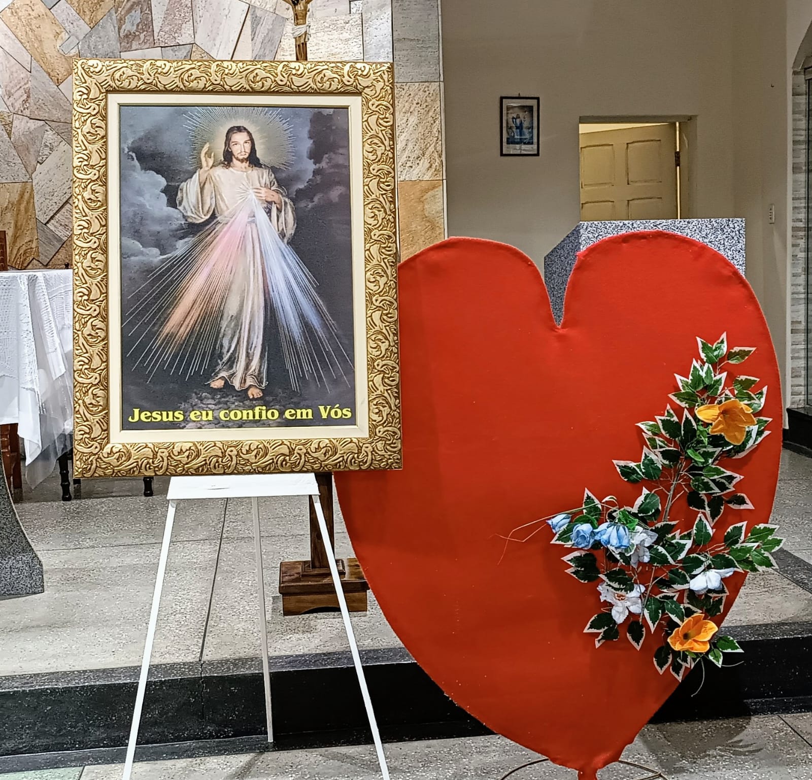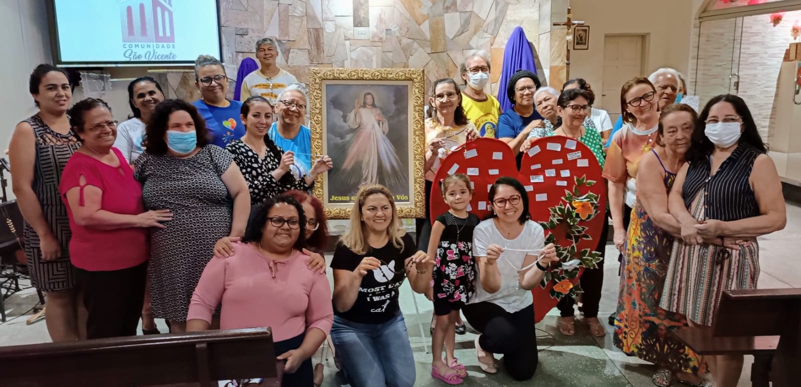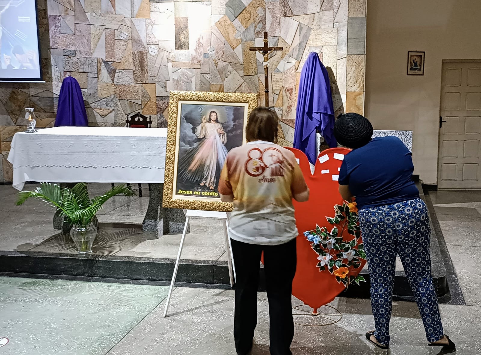 assembléia, em uma breve dinâmica, escreveu e colou no coração ao lado do quadro de Jesus Misericordioso, o nome de pessoas que gostariam que estivessem presente.