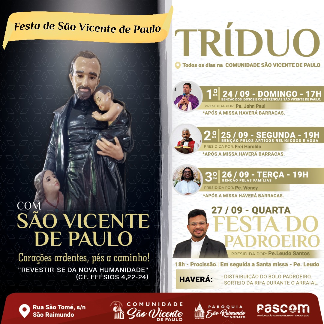 Vamos começar o tríduo do padroeiro da Comunidade São Vicente de Paulo. Motivo para nos encontrarmos, como irmãos em Cristo, contemplar a vida e as obras de caridade de São Vicente de Paulo, que nos inspiram para a missão evangelizadora. Sejamos revestidos da nova humanidade, como nos exorta o lema da festa. Vamos celebrar!