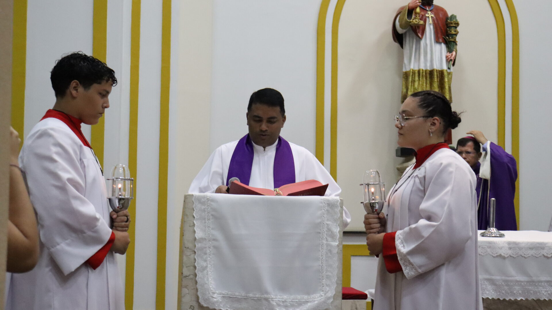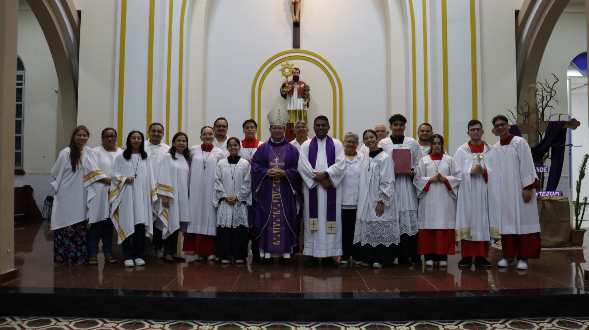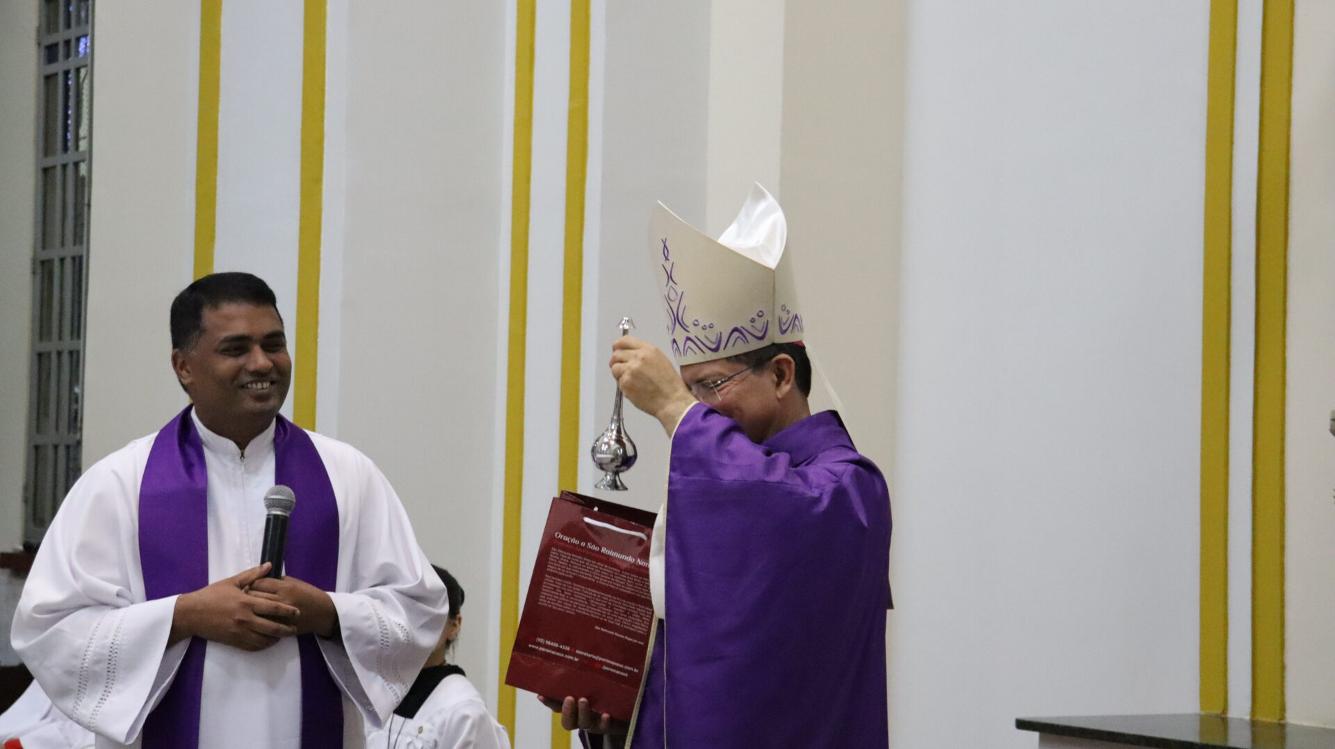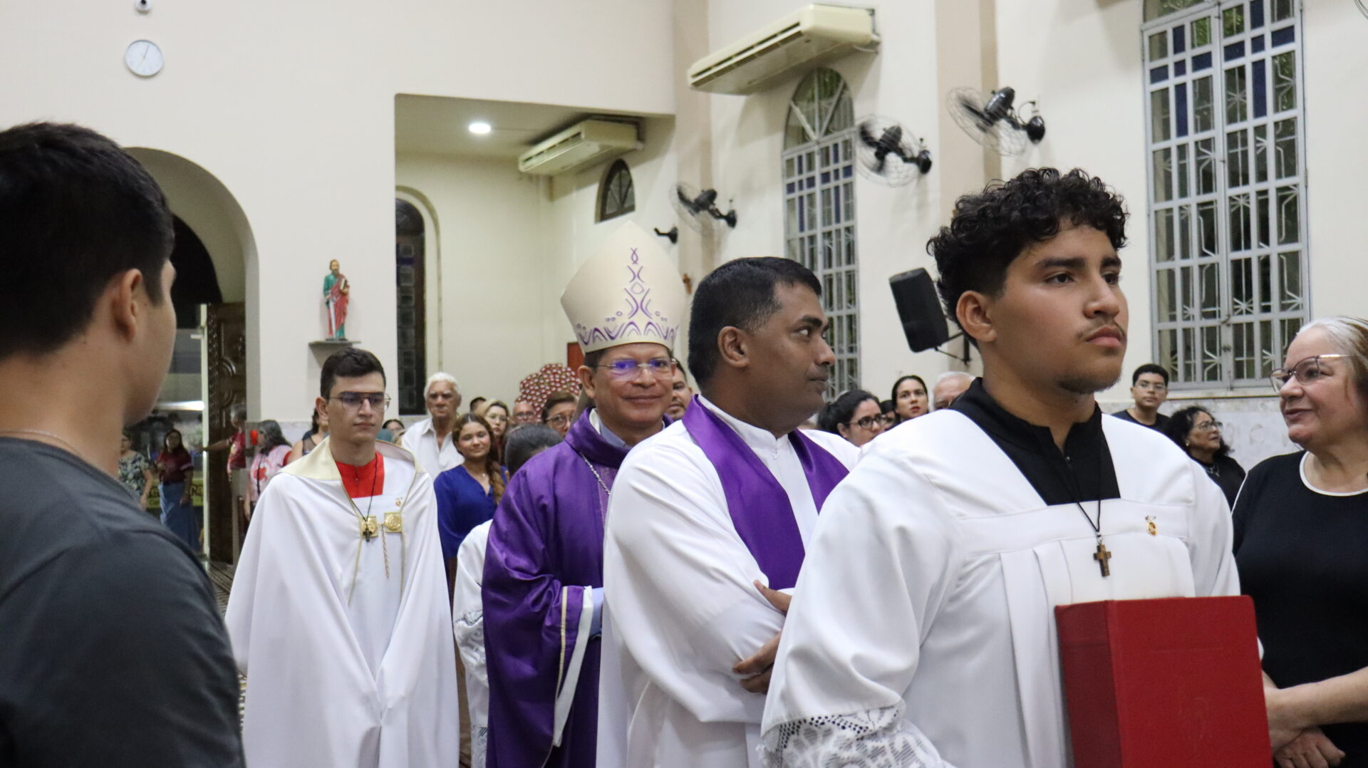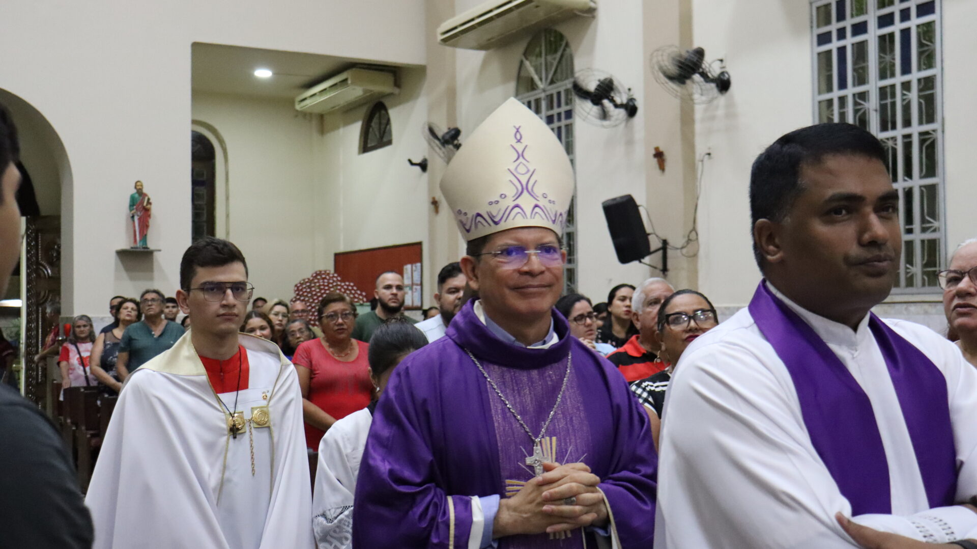 Neste 1° Domingo da Quaresma (09/03/2025), na missa das 19 horas, tivemos a alegria de receber em nossa Paróquia o Bispo Auxiliar da Arquidiocese de Manaus, Dom Hudson, que presidiu a missa, tendo ao seu lado o nosso pároco, padre John Paul.